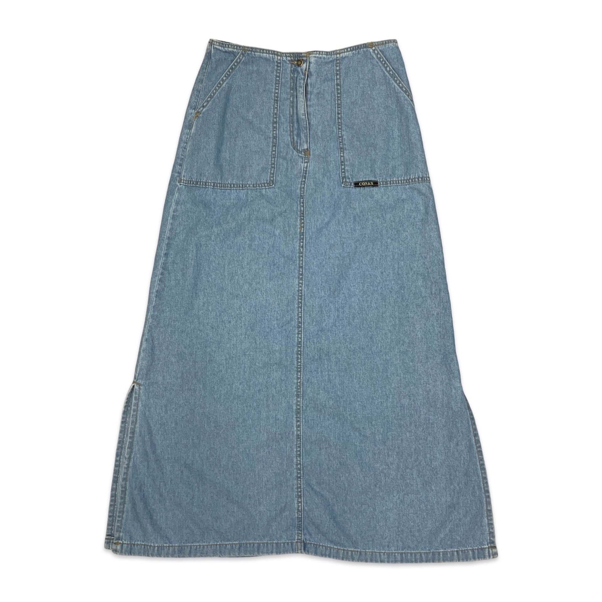 Women’s vintage maxi skirt. Light weight denim with beige top stitching & two front pockets. Front button and fly zip fastening.