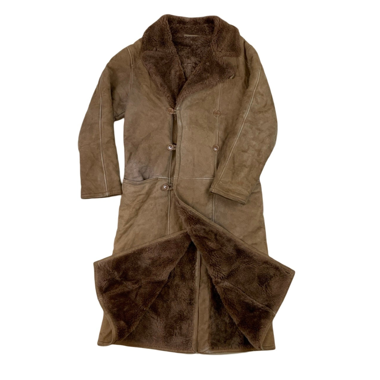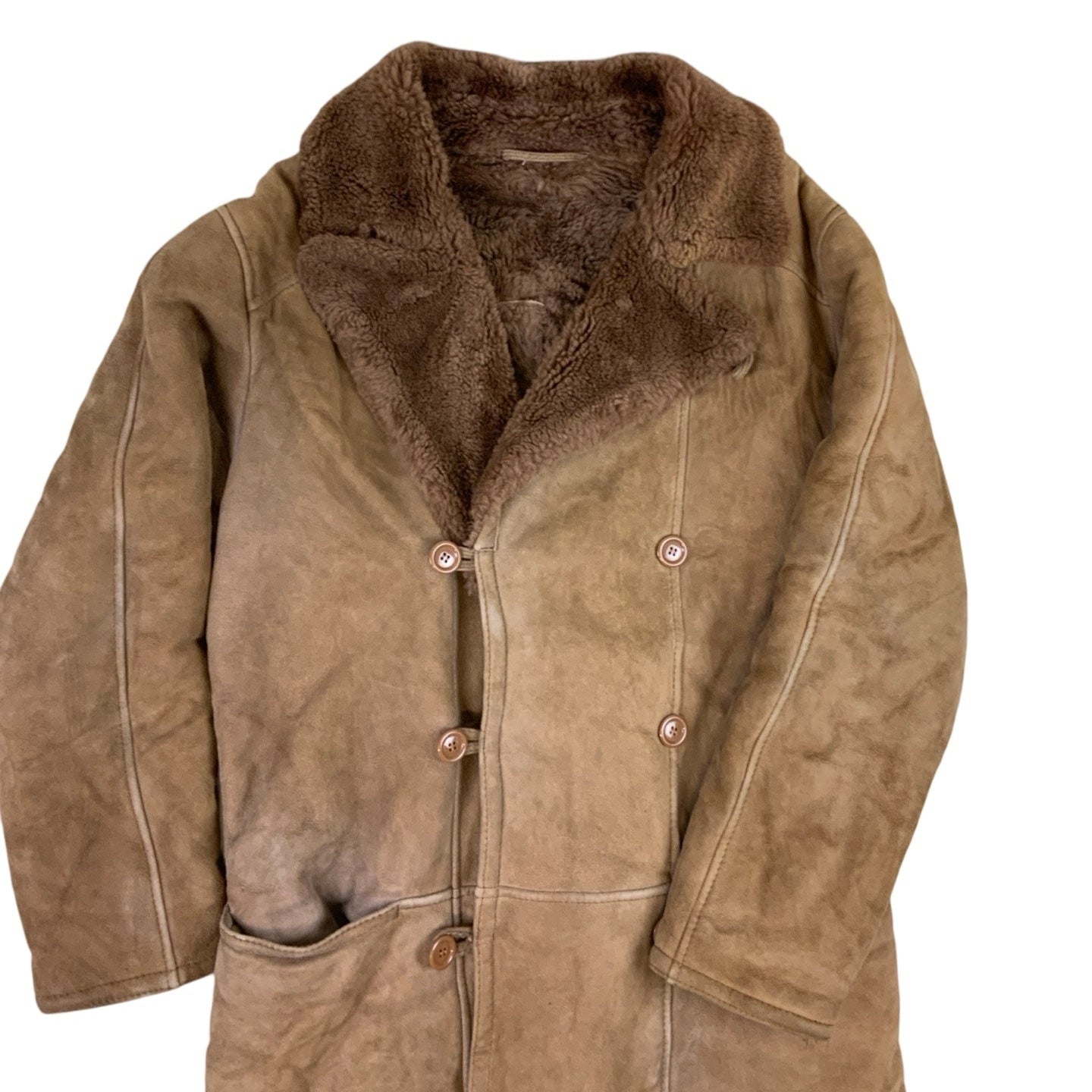 Vintag sheepskin/ faux suede shearling coat with faux fur collar. Light brown with coloured. Original belt and front pockets. Buttoned front fastening.