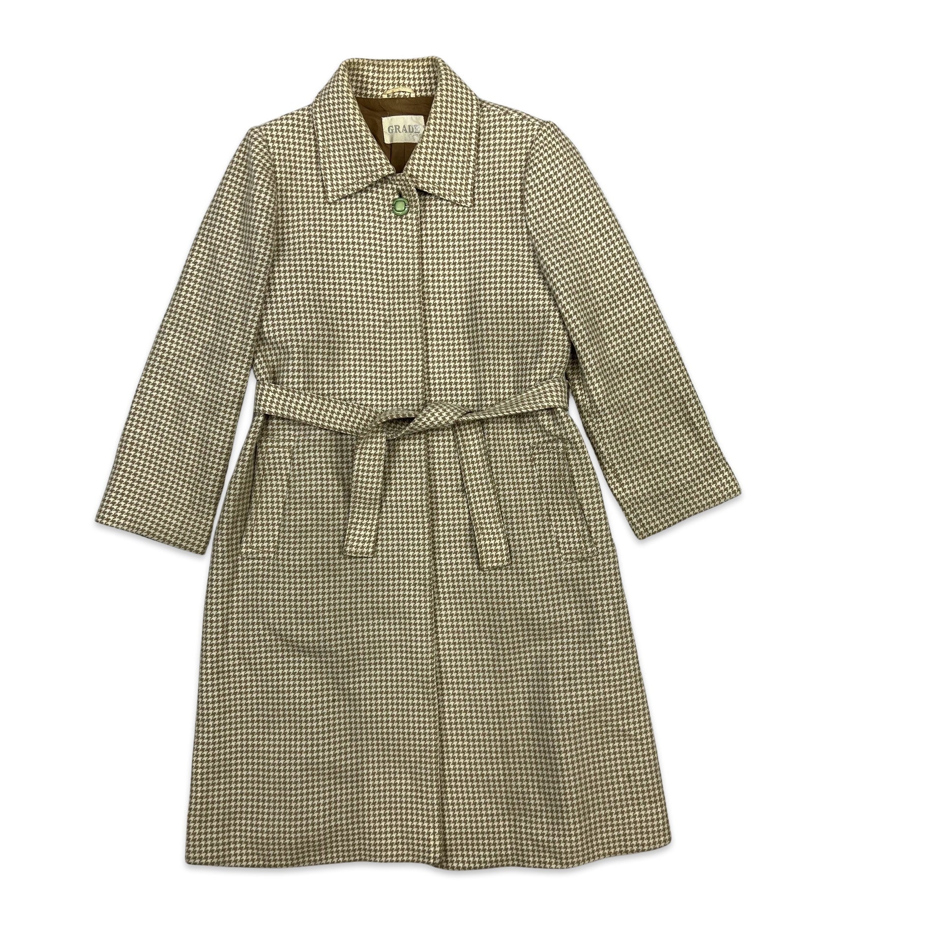 Vintage wool midi coat. Brown and cream dogtooth pattern. Mint green ornate top button. Belted, fully lined, button front fastening.