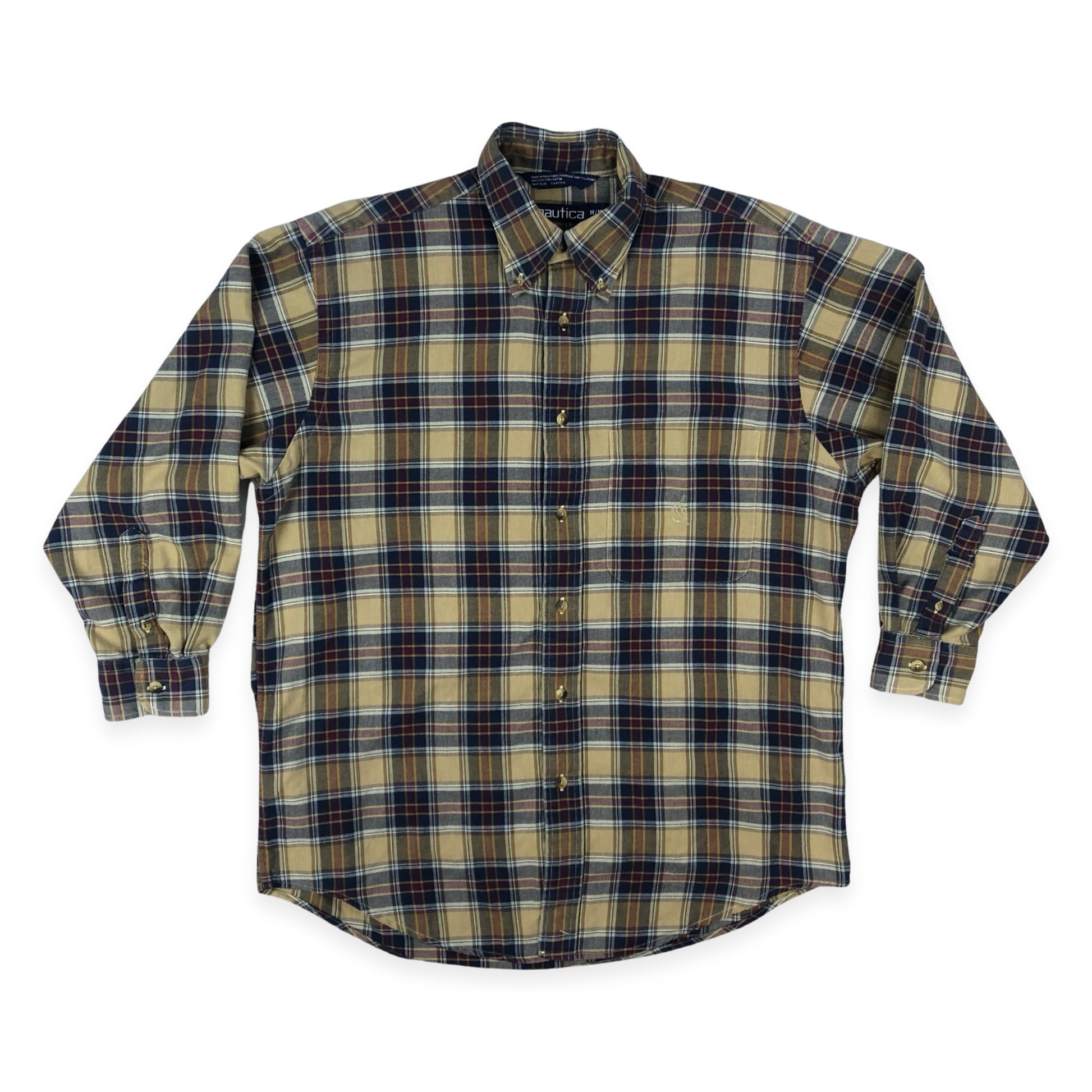 Vintage Nautica plaid flannel shirt in brown, blue, and red.