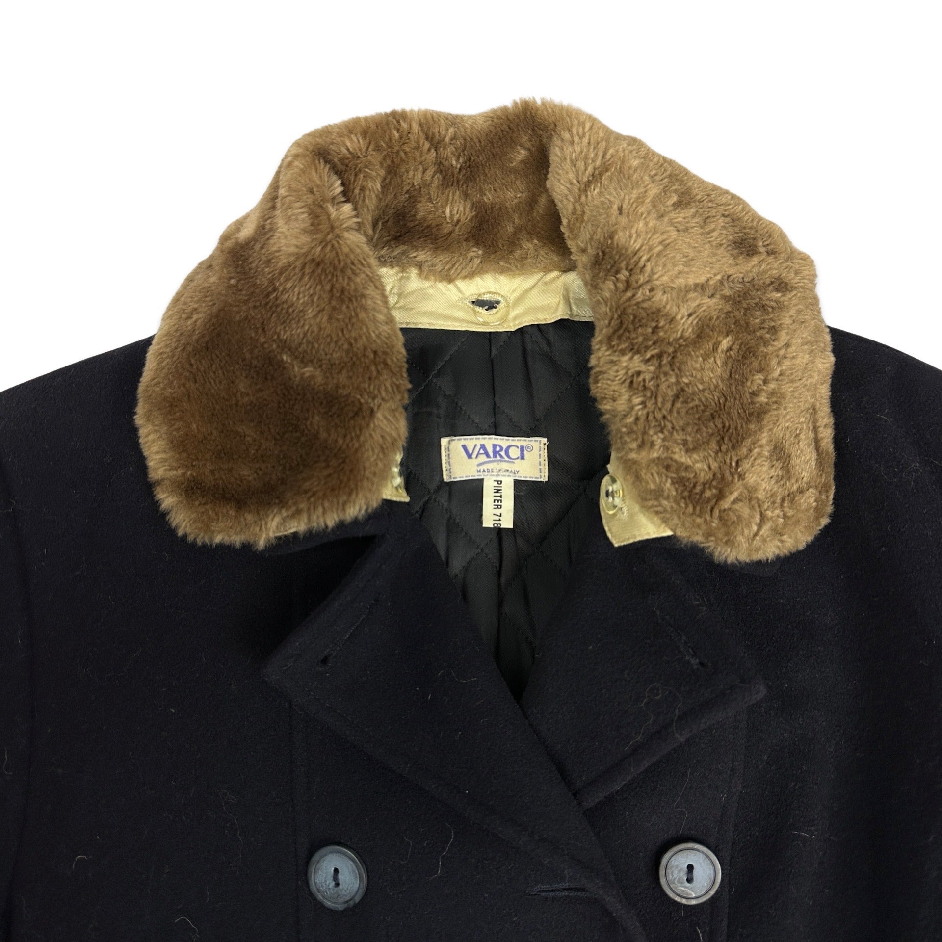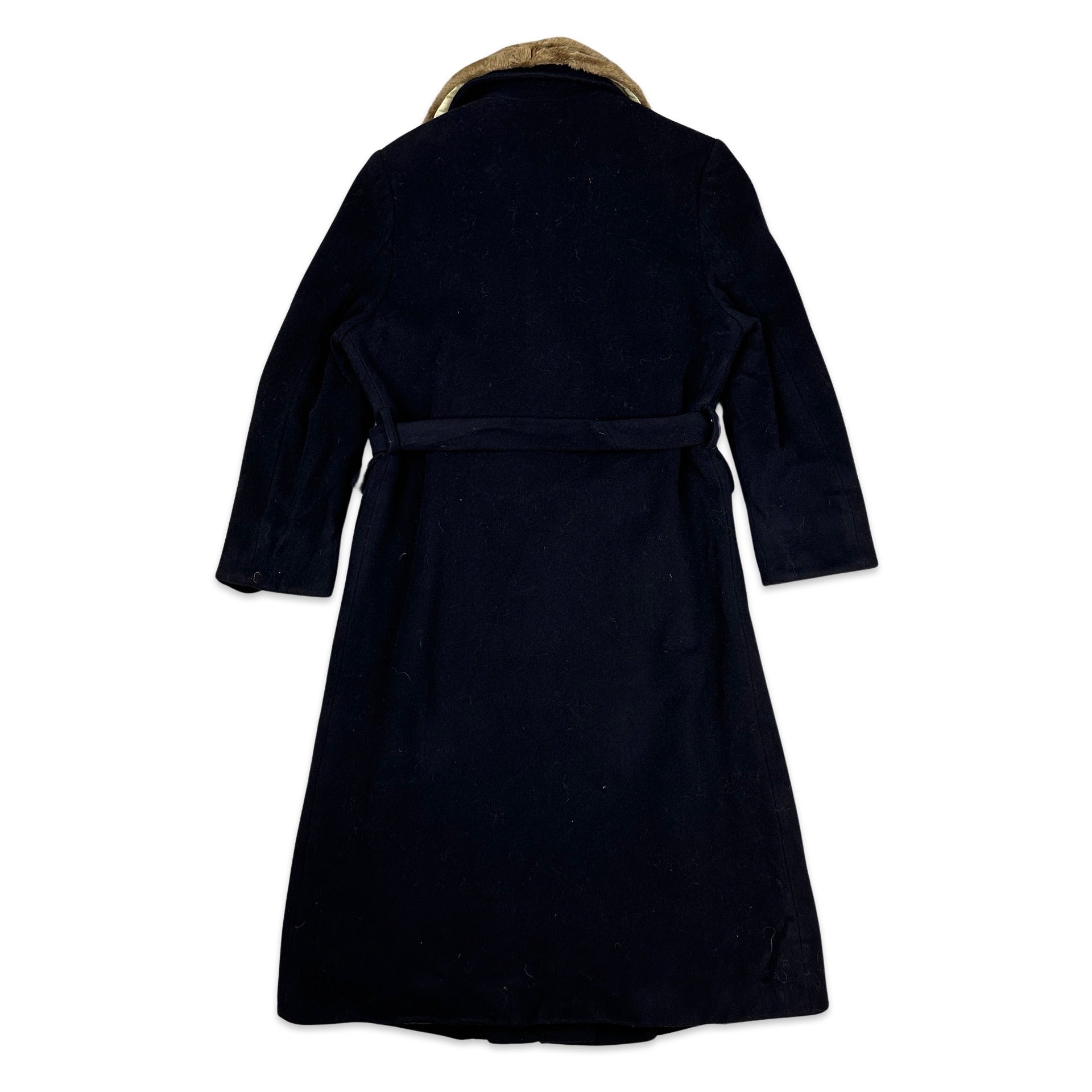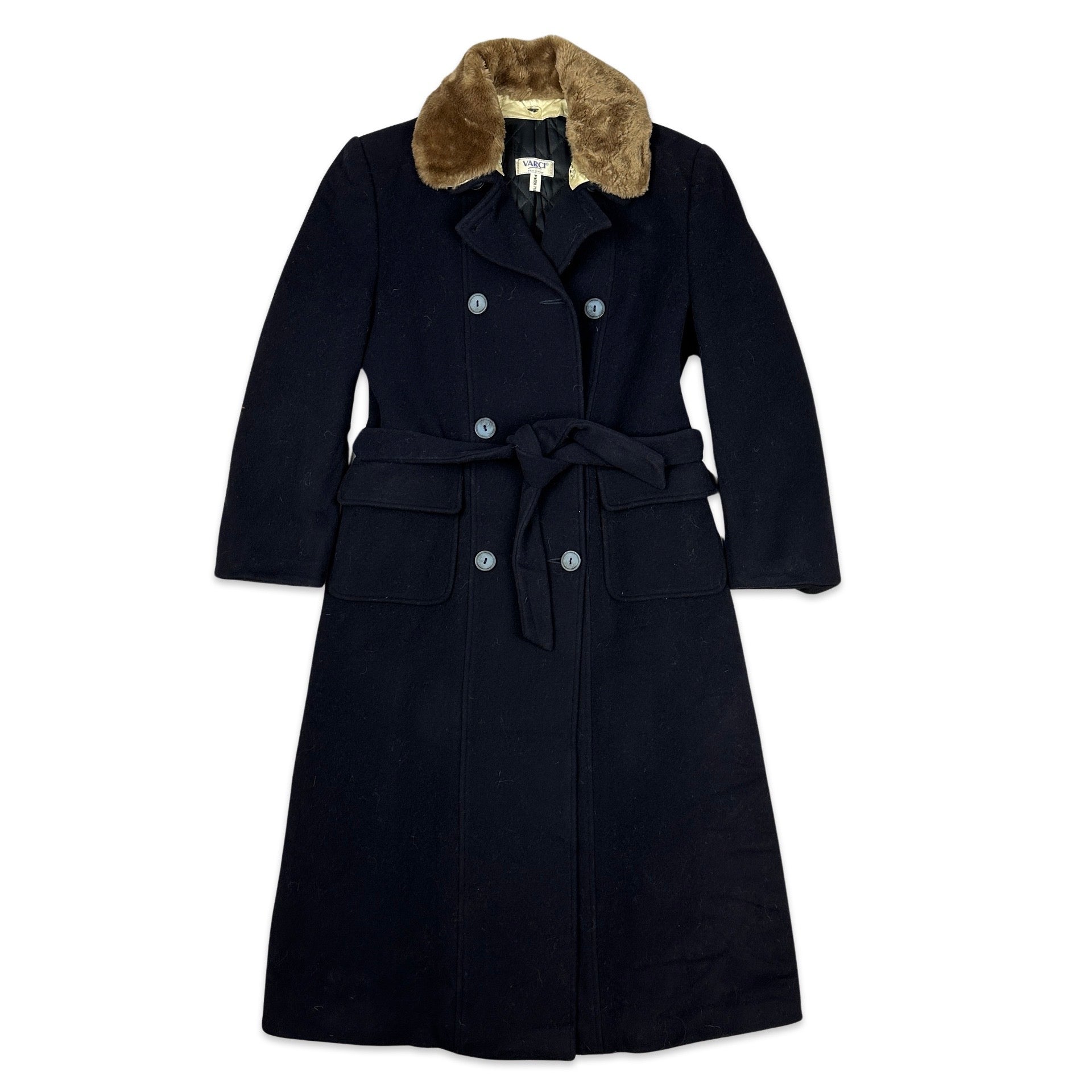 90s vintage made in Italy ladies navy blue wool longline duster/trench coat. Brown faux fur detachable collar, double breasted statement button fastening.
