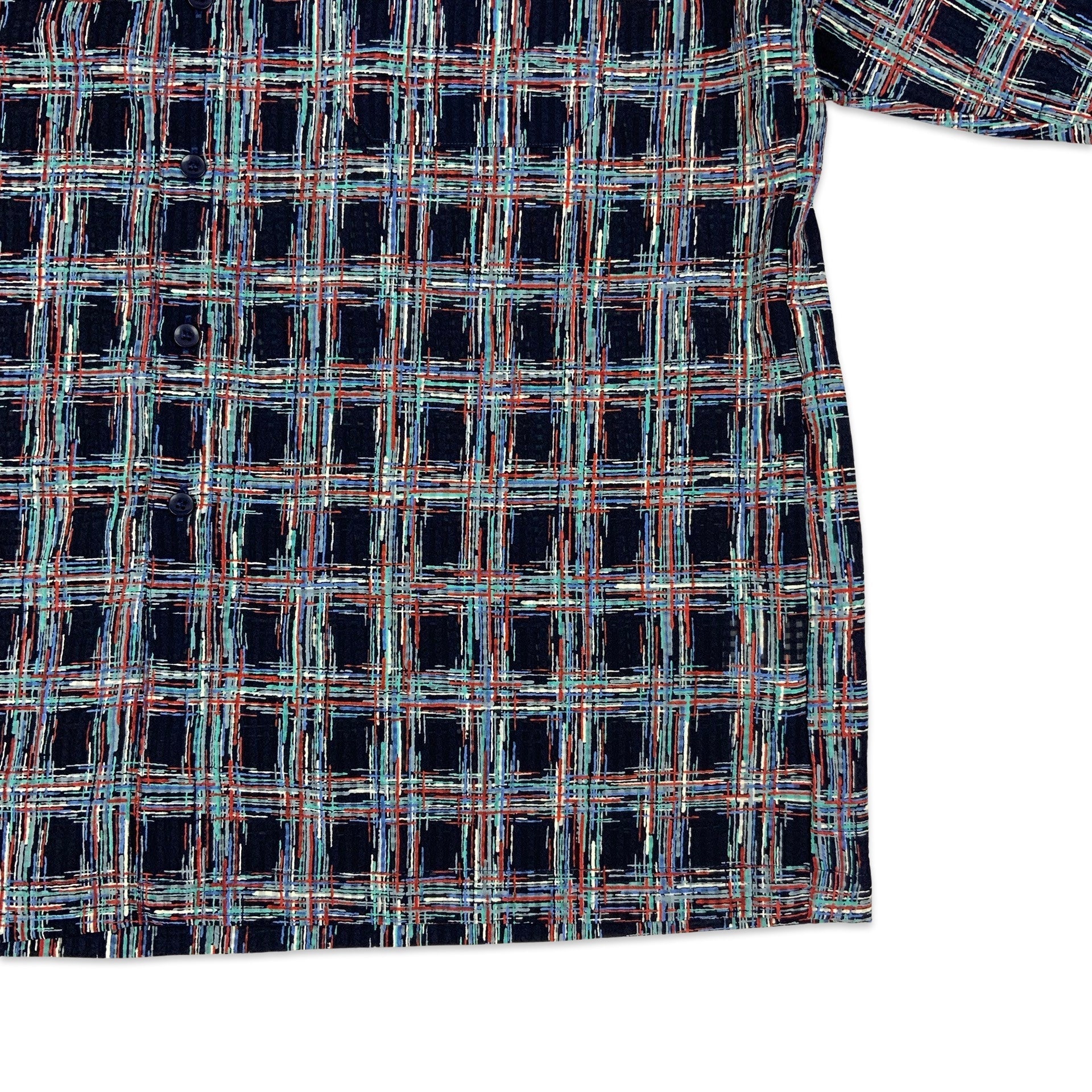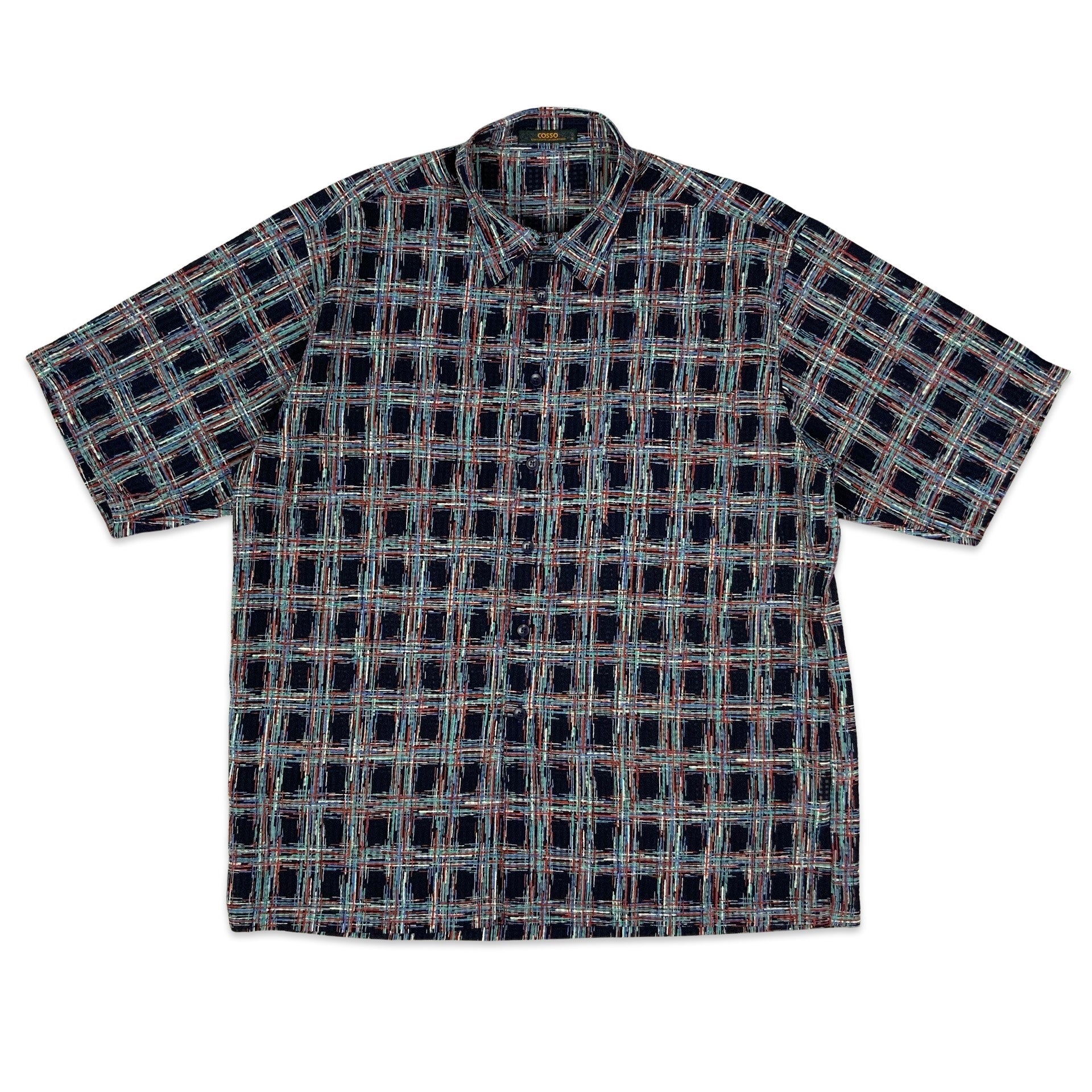 Men’s vintage short sleeve shirt. Navy, red, white & grey checkered print with navy buttons. Sheer fabric.