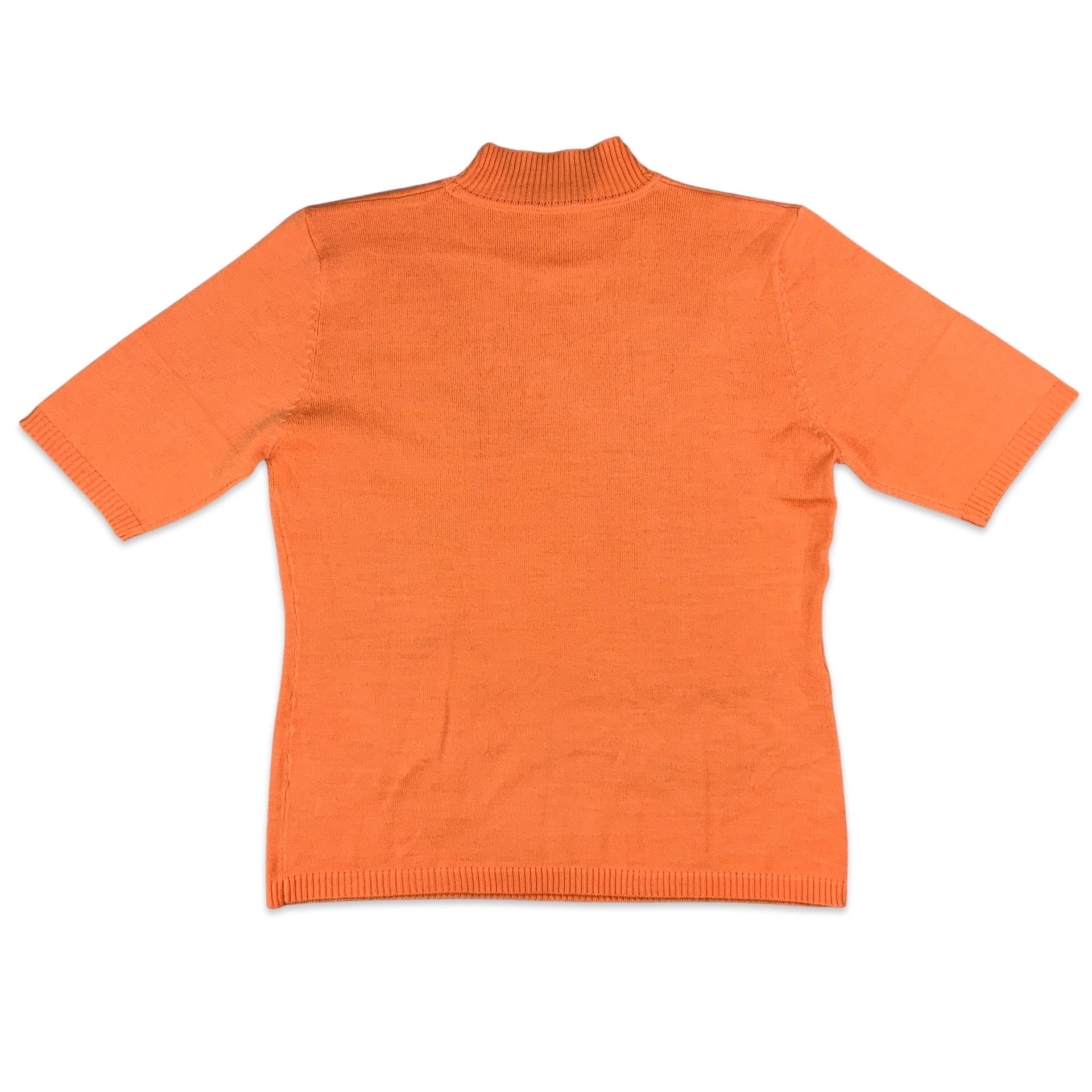 Vintage orange mock neck short sleeve knit jumper with brown botanical diamant print across front.