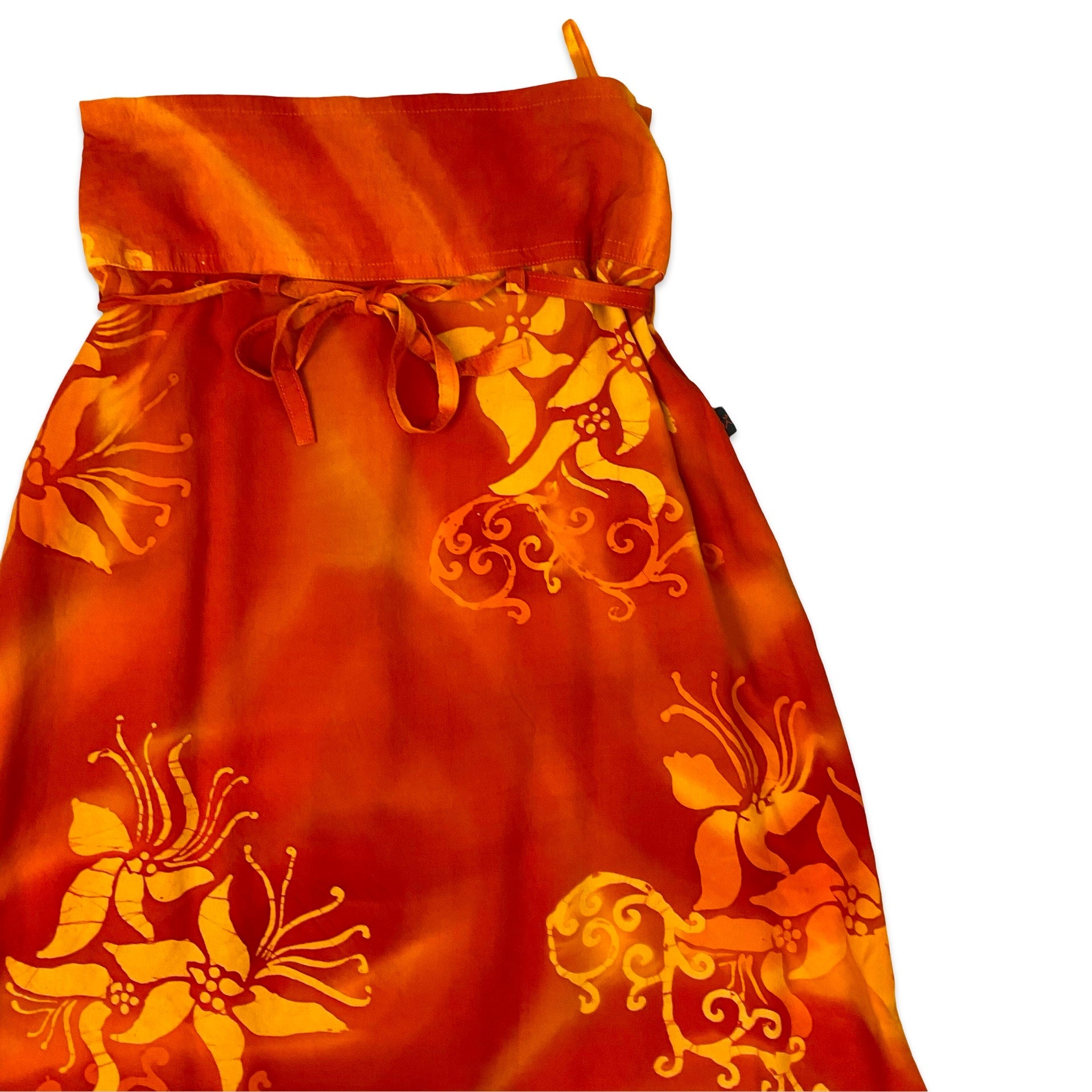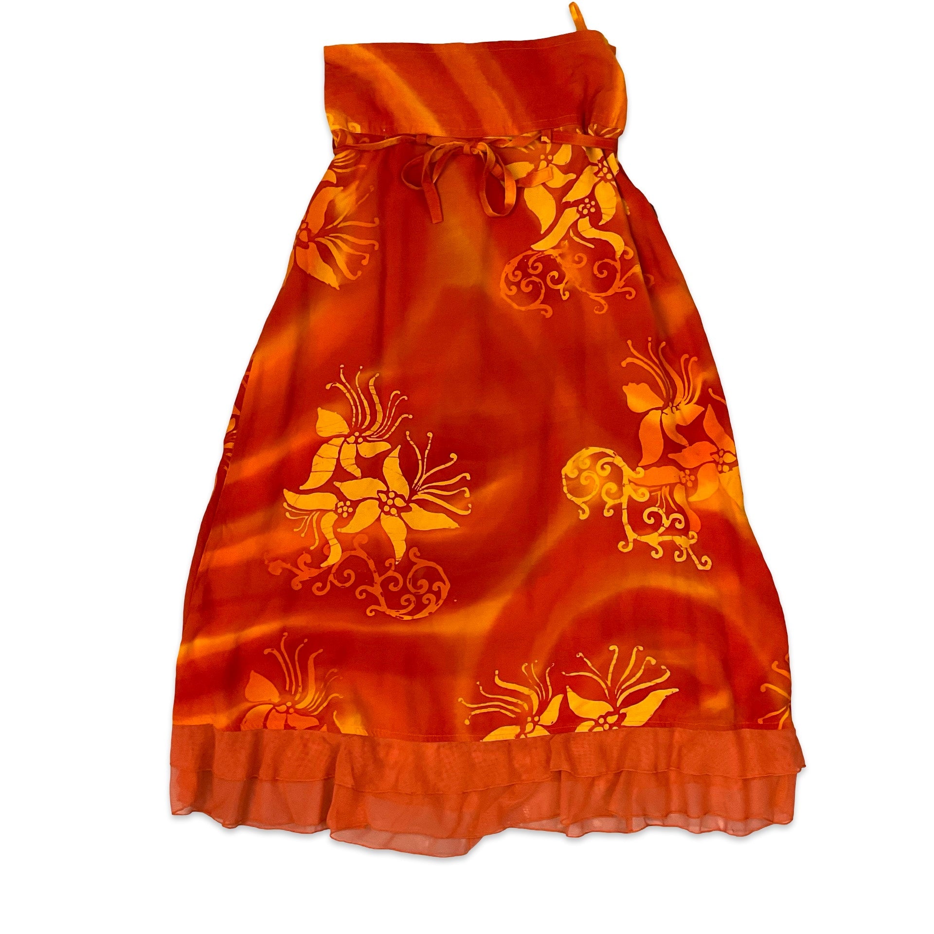 Vintage orange maxi skirt with all-over floral print and tie-up belt at waist.