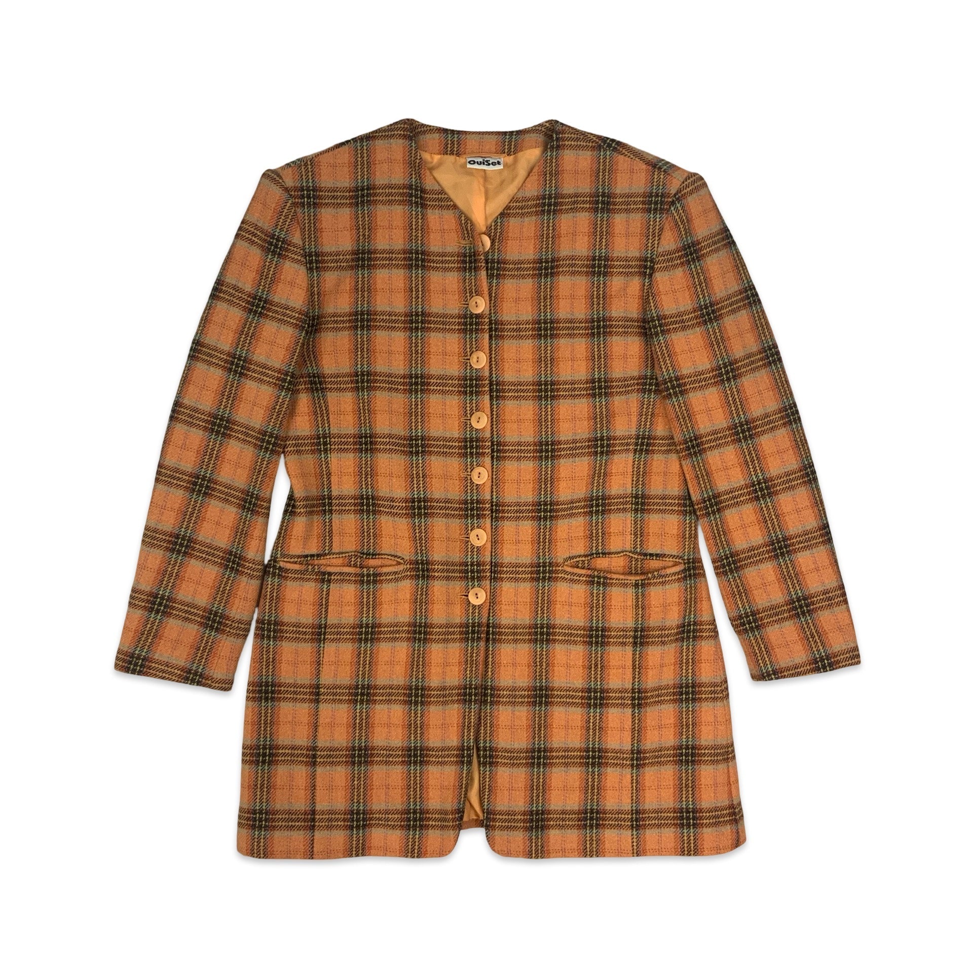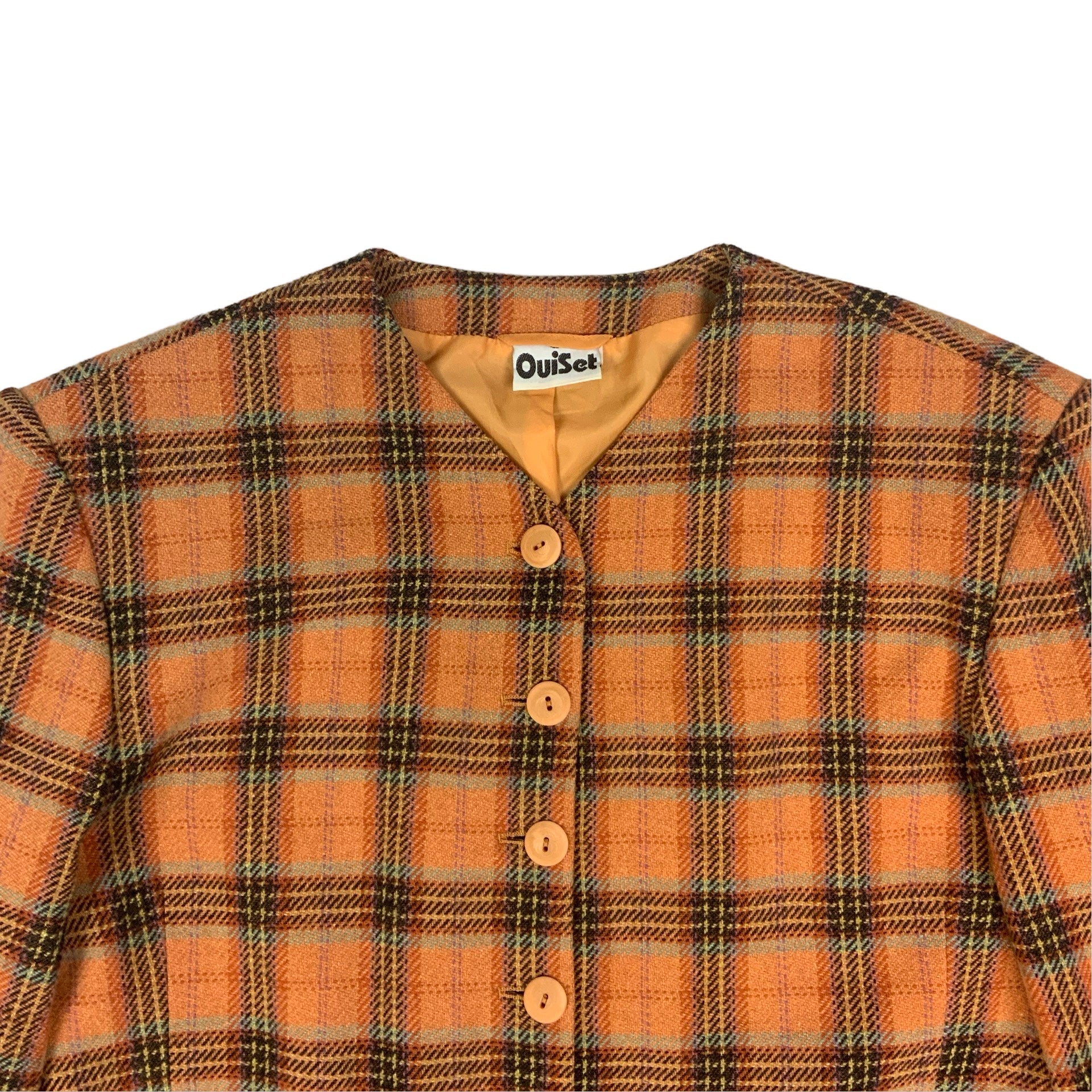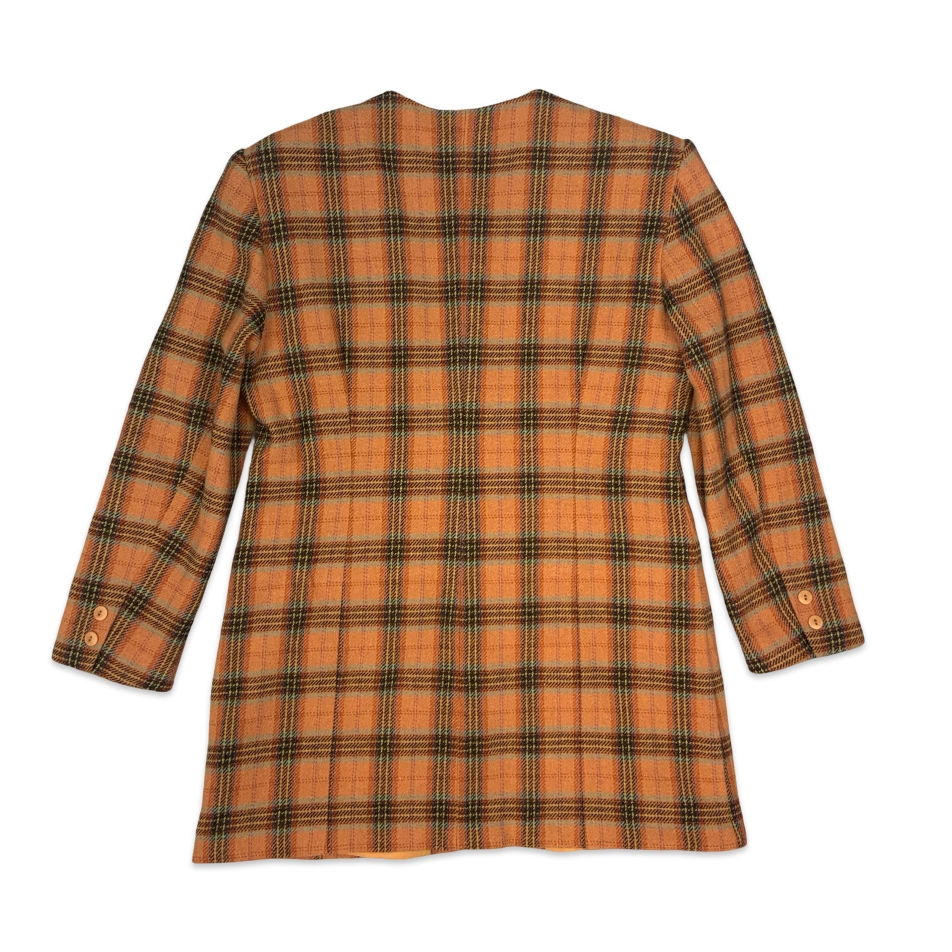 Women’s vintage midi coat. Orange, purple, yellow, teal & black plaid print. Wool & rayon mix.