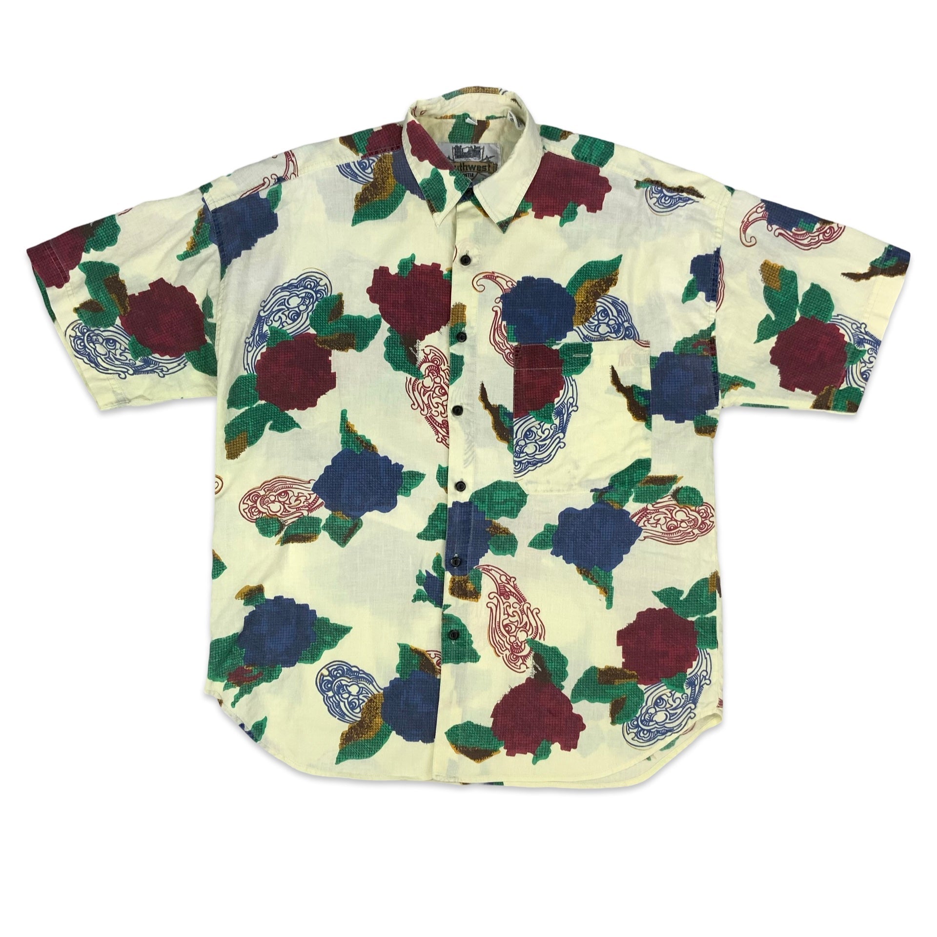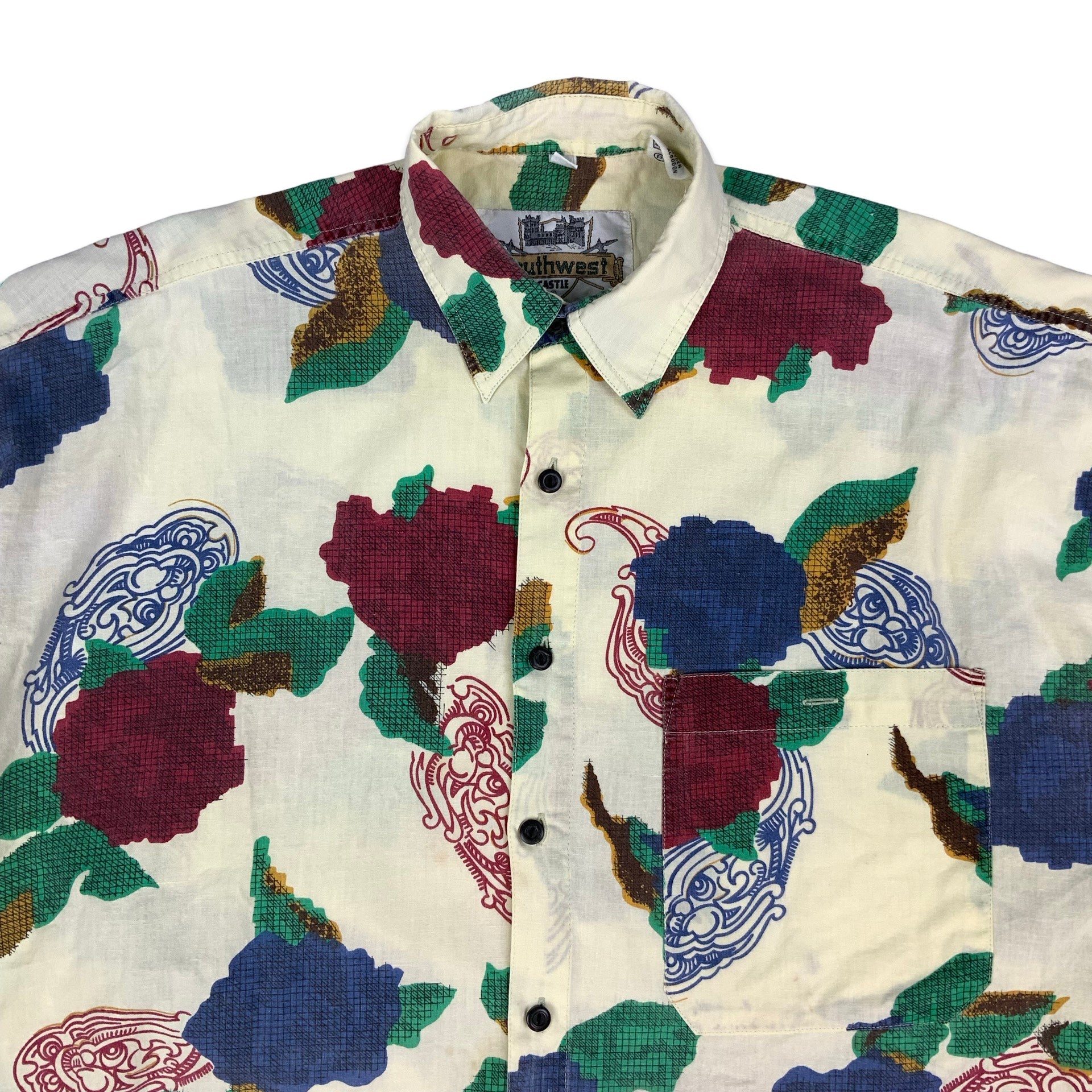 Vintage Pale Yellow Red Blue Green Abstract Print Shirt L
