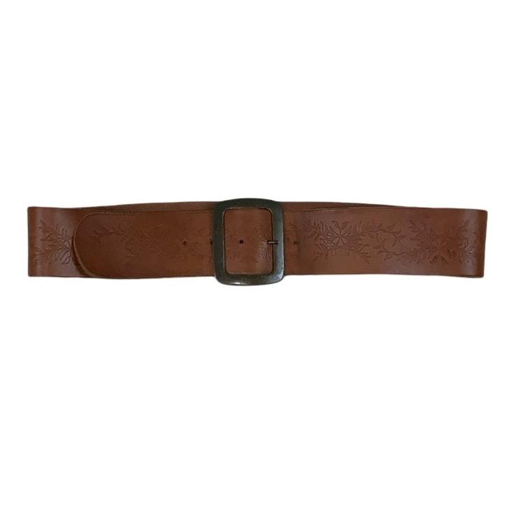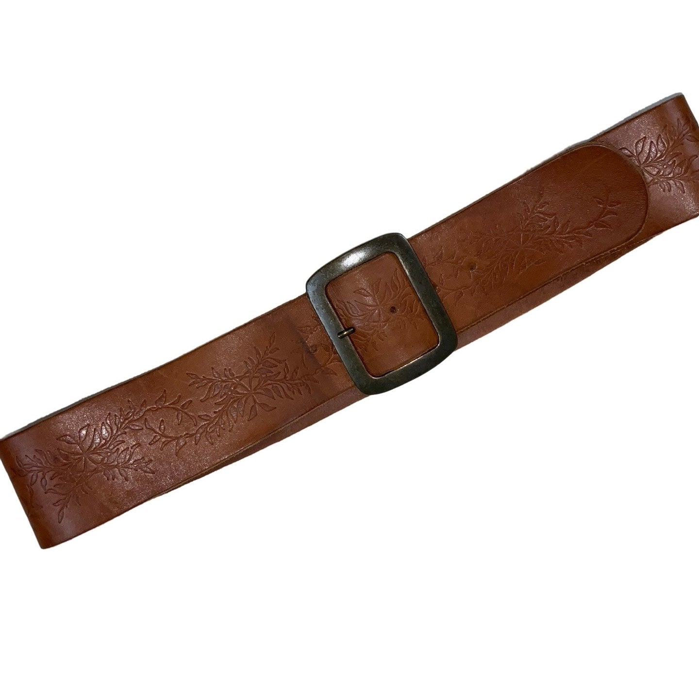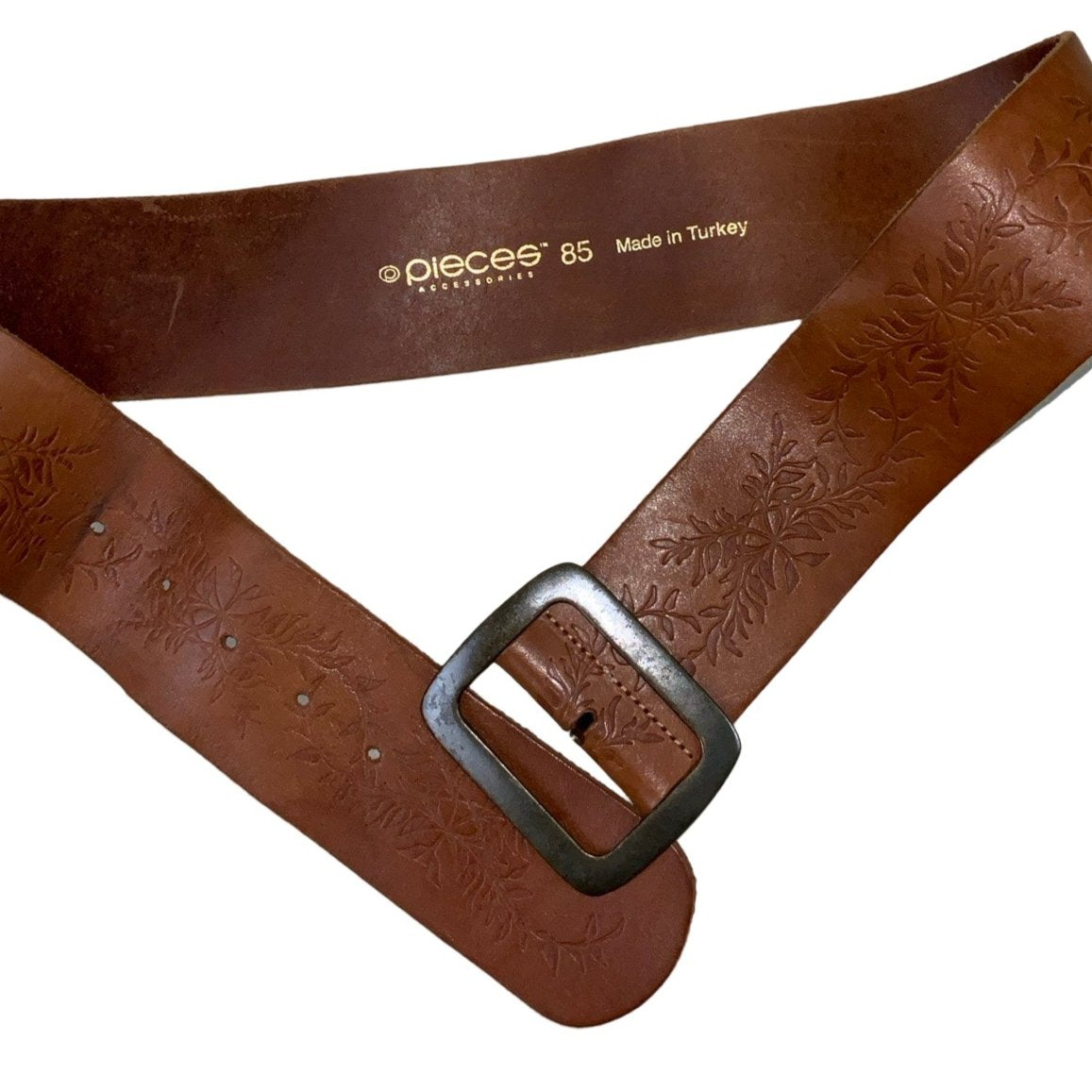Vintage 'Pieces Accessories' brown belt with a botanical pattern surrounding, and large bronze buckle fastening.