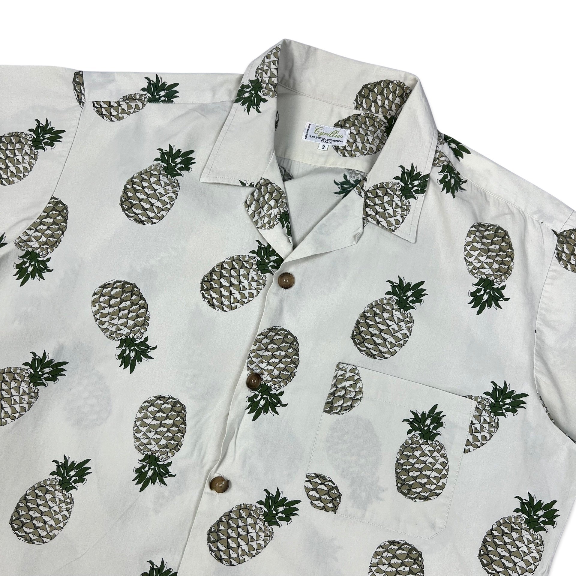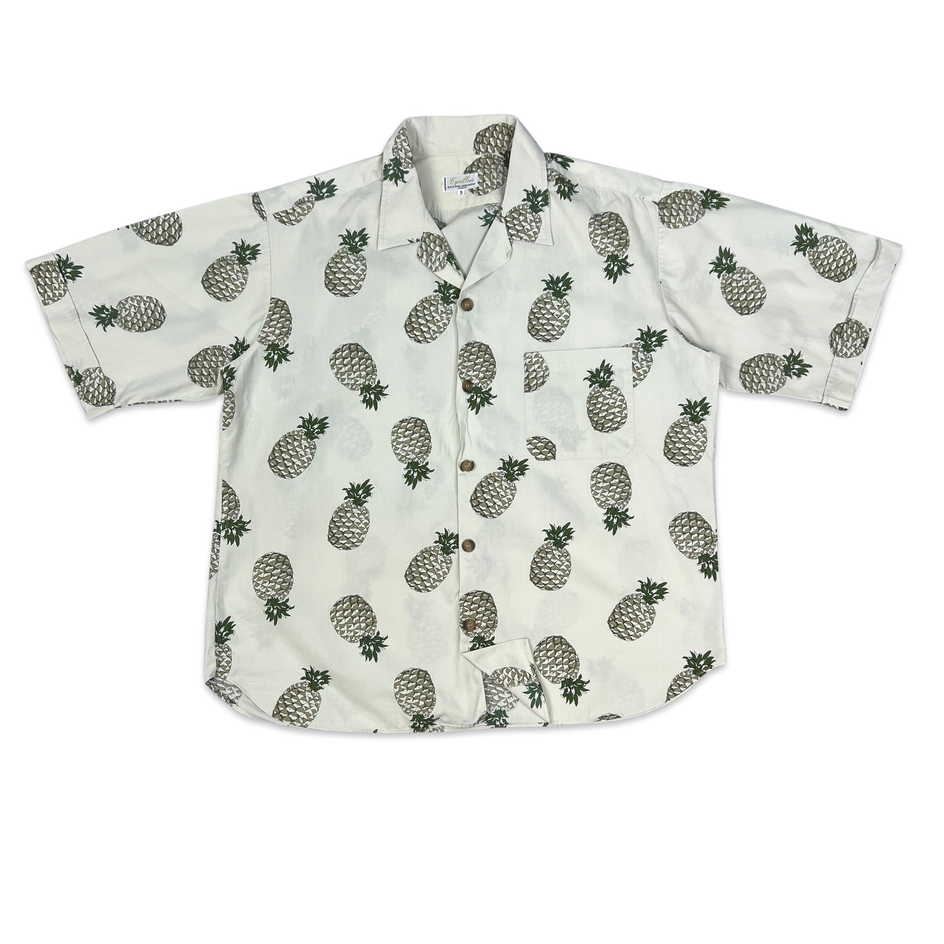 Vinatge men's Hawaiian style shirt in off-white with all-over pineapple print and chest pocket.
