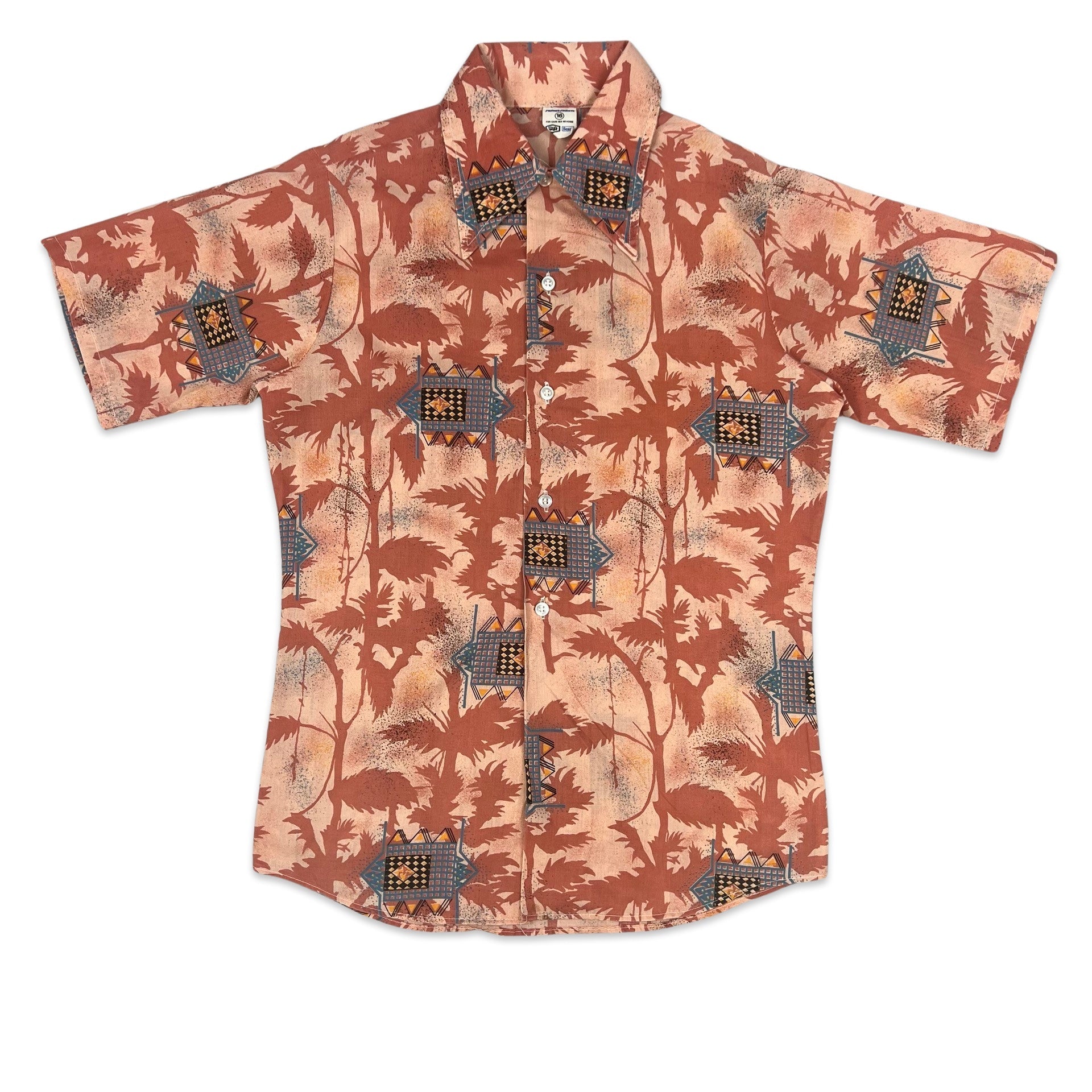 Vintage 1970s Sears boys' Hawaiian style shirt with pink abstract print.