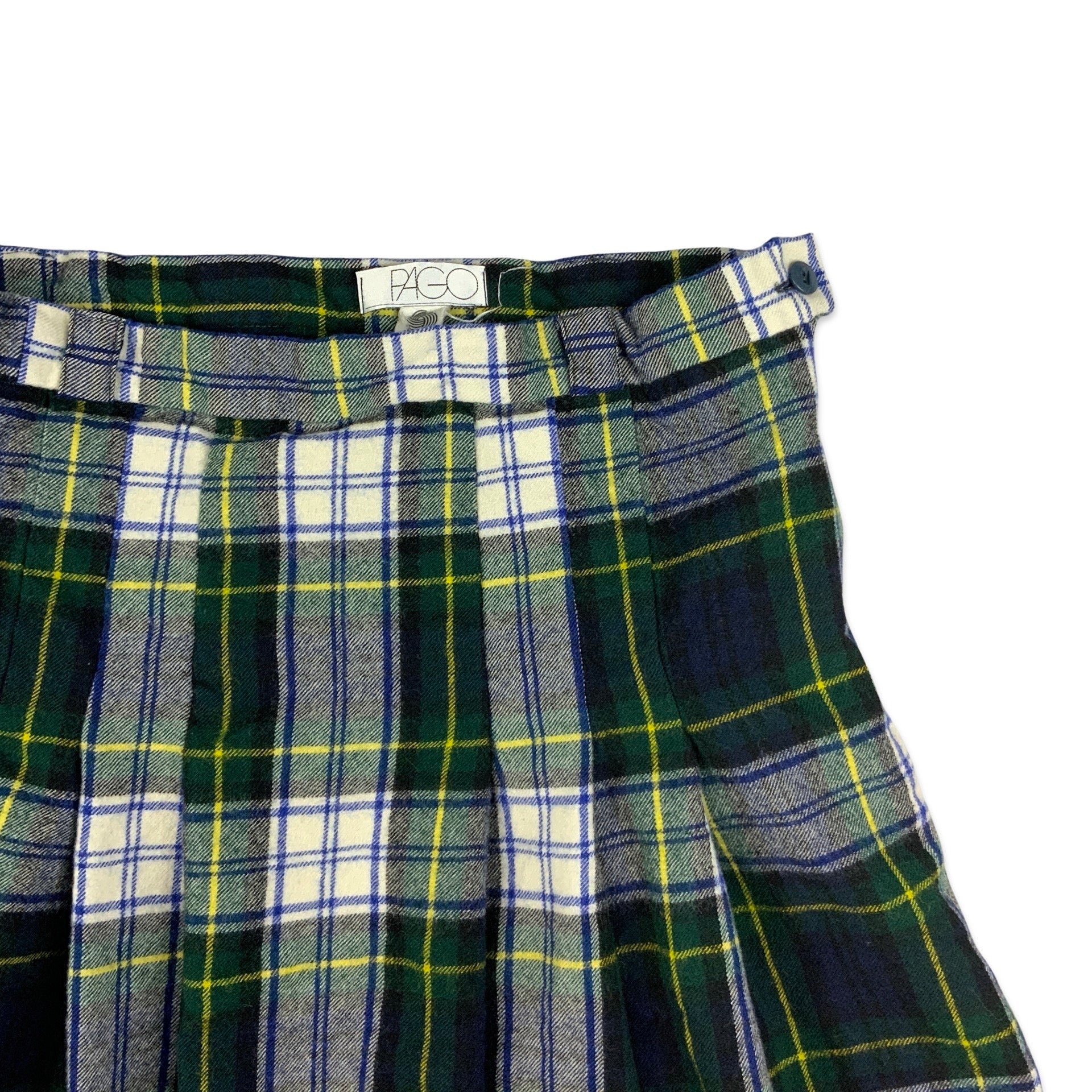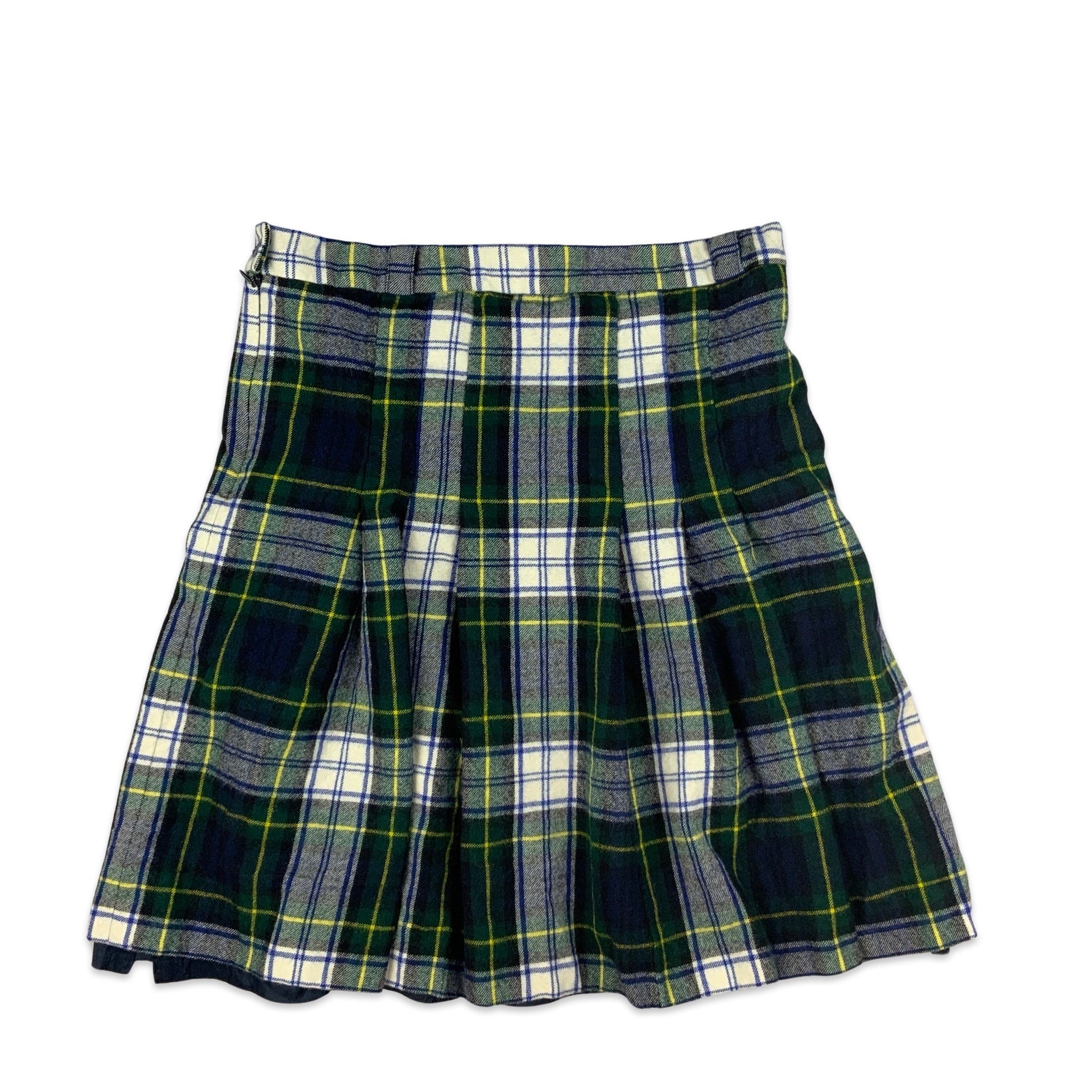 Vintage women's pleated plaid midi kilt with navy. green, white, and black plaid pattern. Zip fastening.