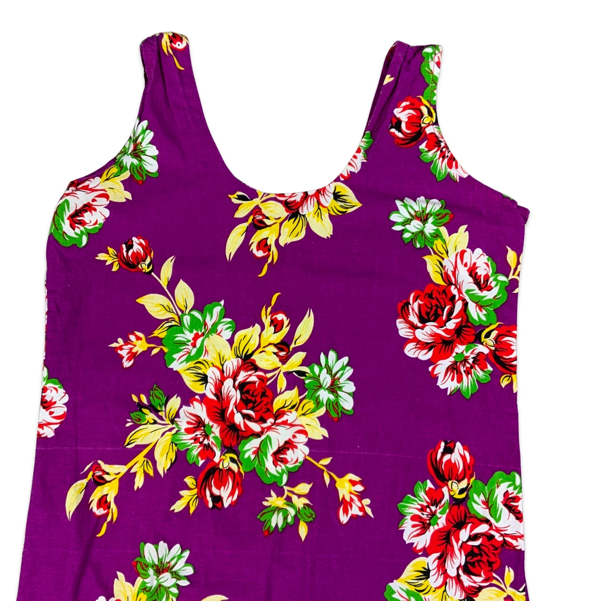 Women’s vintage handmade Aline shift dress. Purple with green, red and yellow flower print.