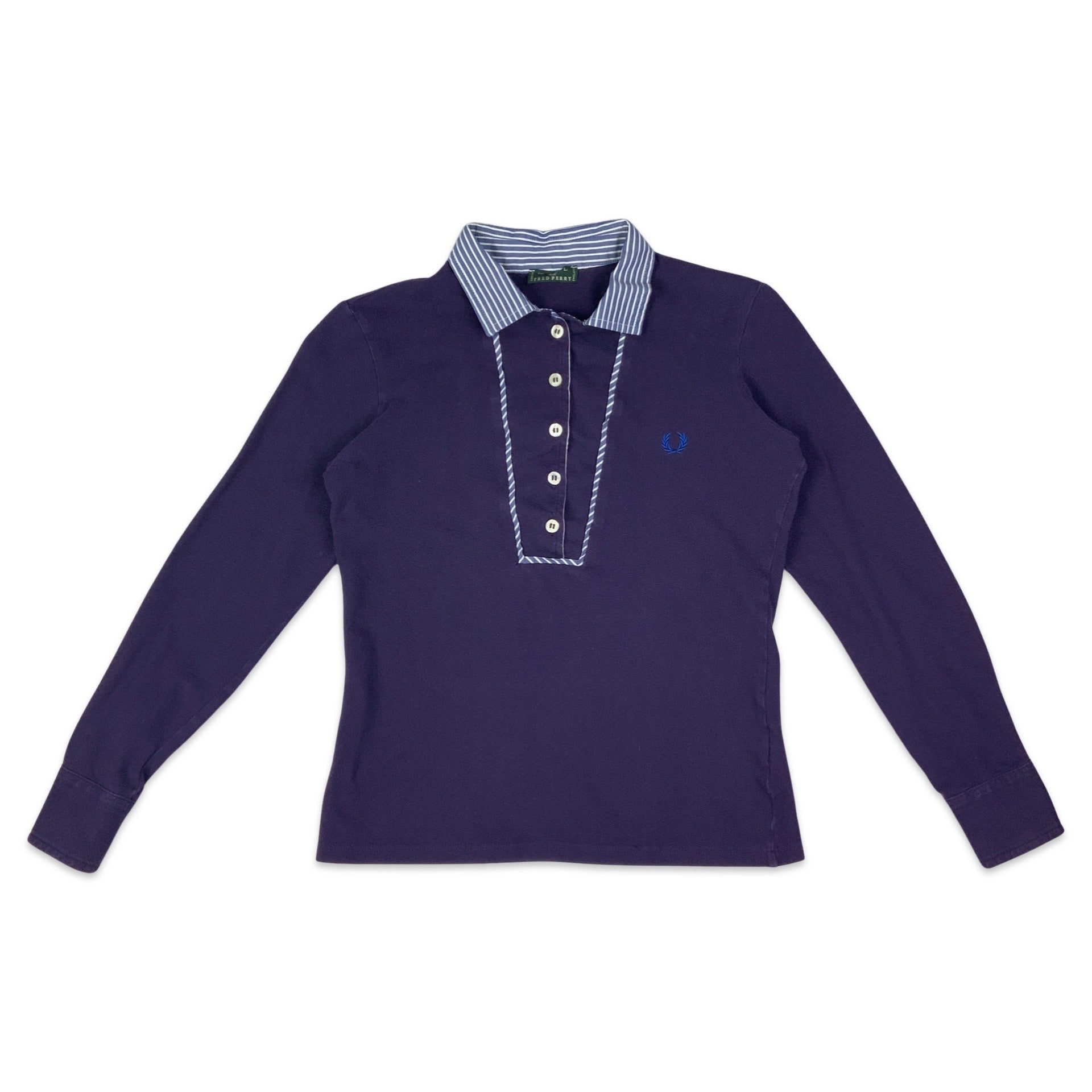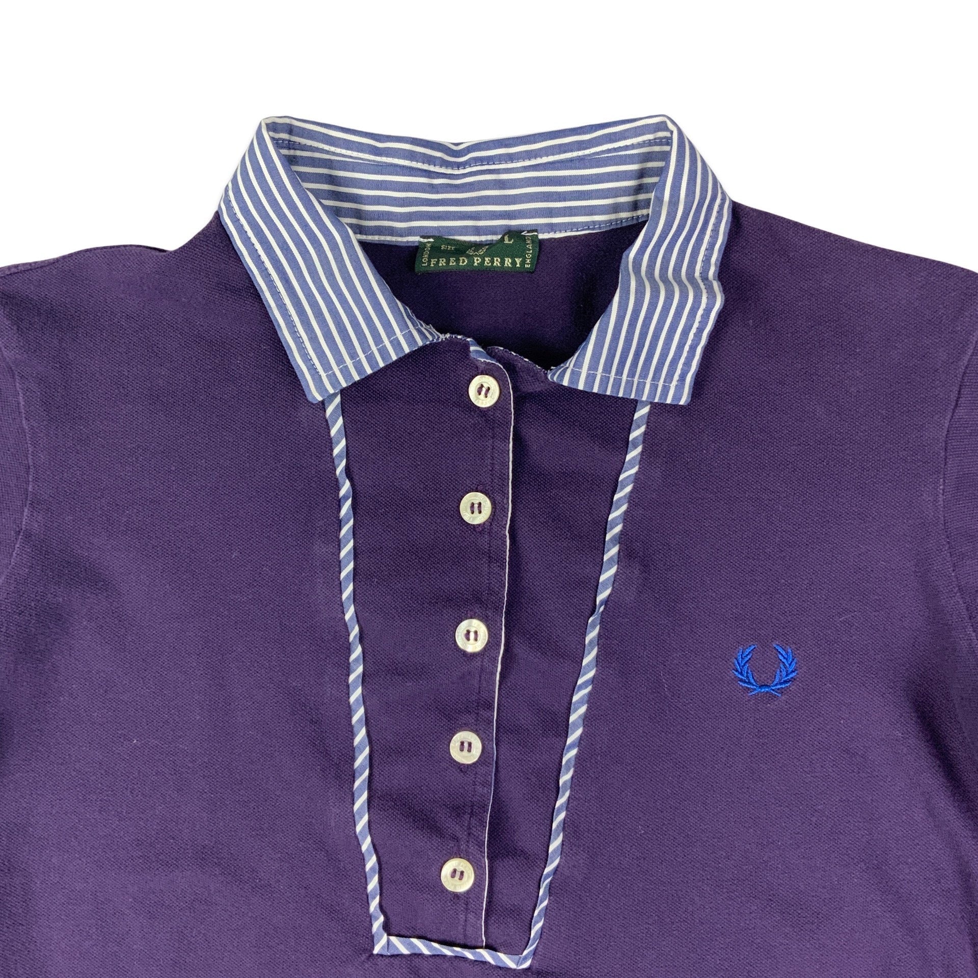 Women’s vintage Fred Perry button up, long sleeve shirt. 5 button up. Purple with white and blue striped collar and cuff detail. Cotton and elastane mix.