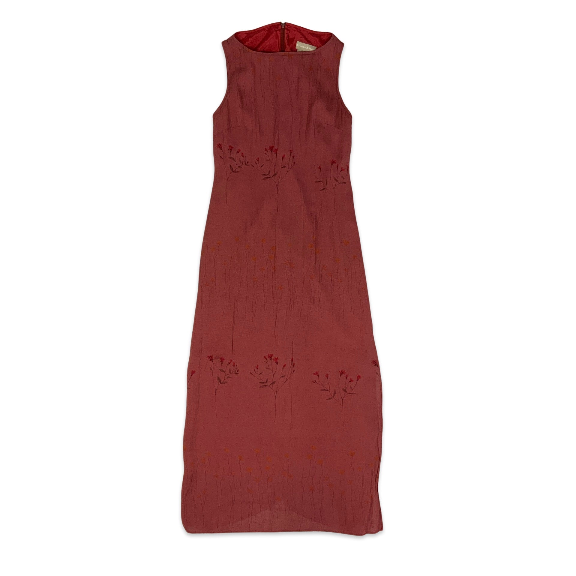 Vintage sleeveless red maxi dress with subtle floral print, interior lining and back zip fastening.