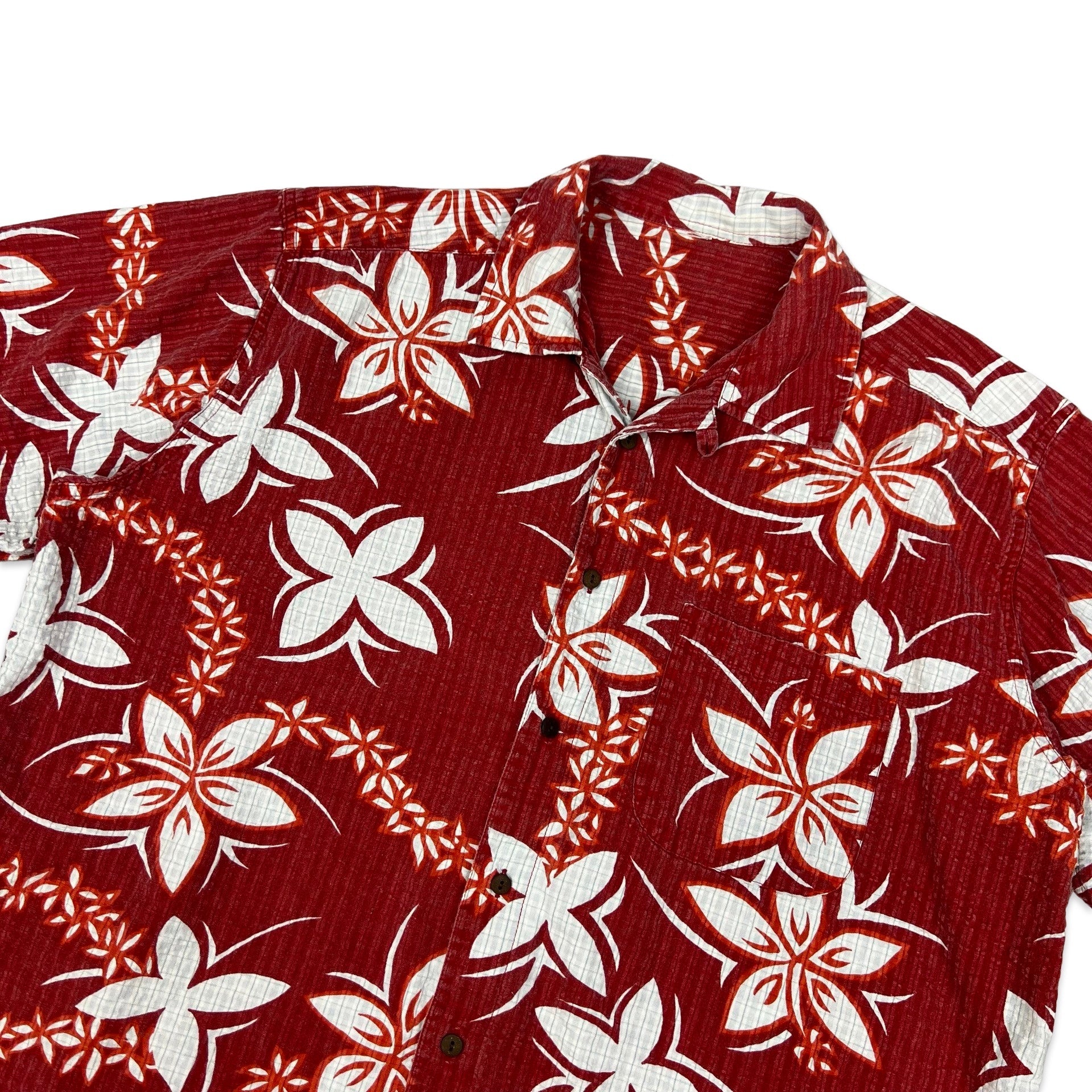 Vintage red and white textured Hawaiian style shirt with floral print and chest pocket with wooden buttons.