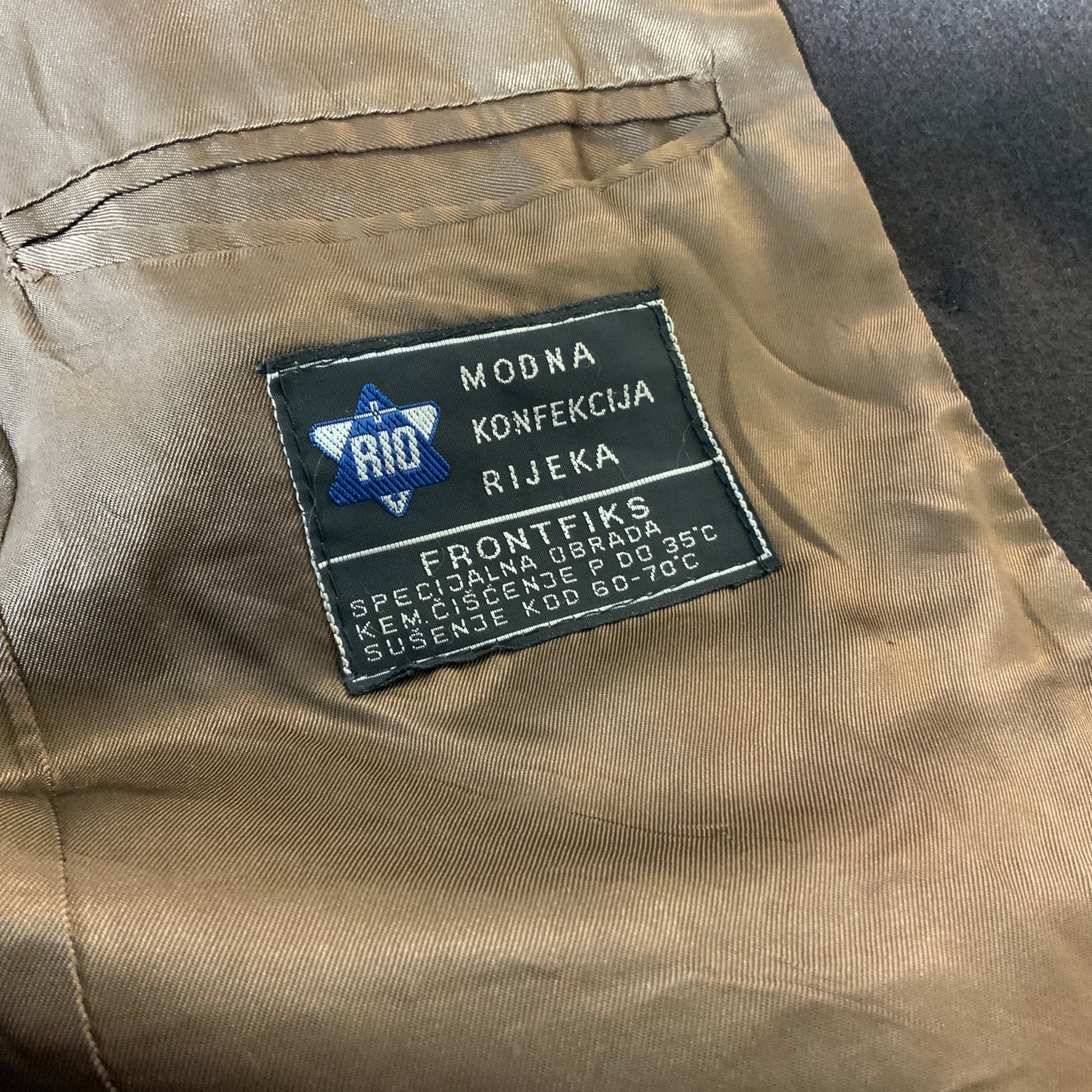 Vintage Modna Konfekcija Rijeka RIO double breasted duster coat in brown with a cotched collar, silk-feel lining, one internal pocket and two external pockets.