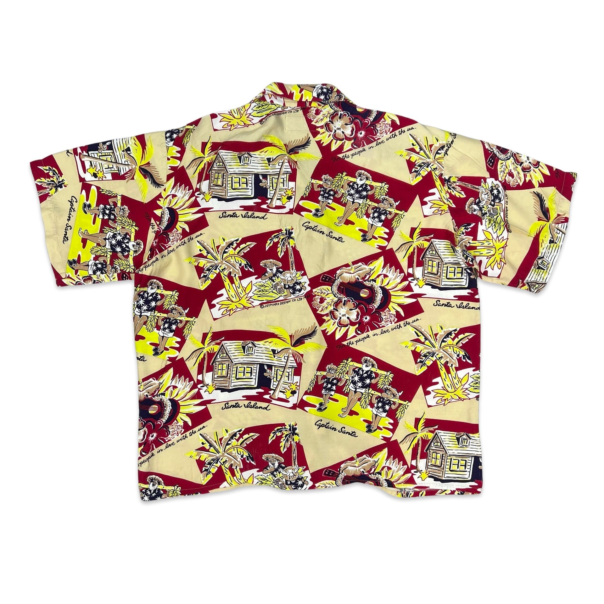 Vintage 1985 Hawaiian style men's shirt featuring all-over print of Father Christmas on holiday.