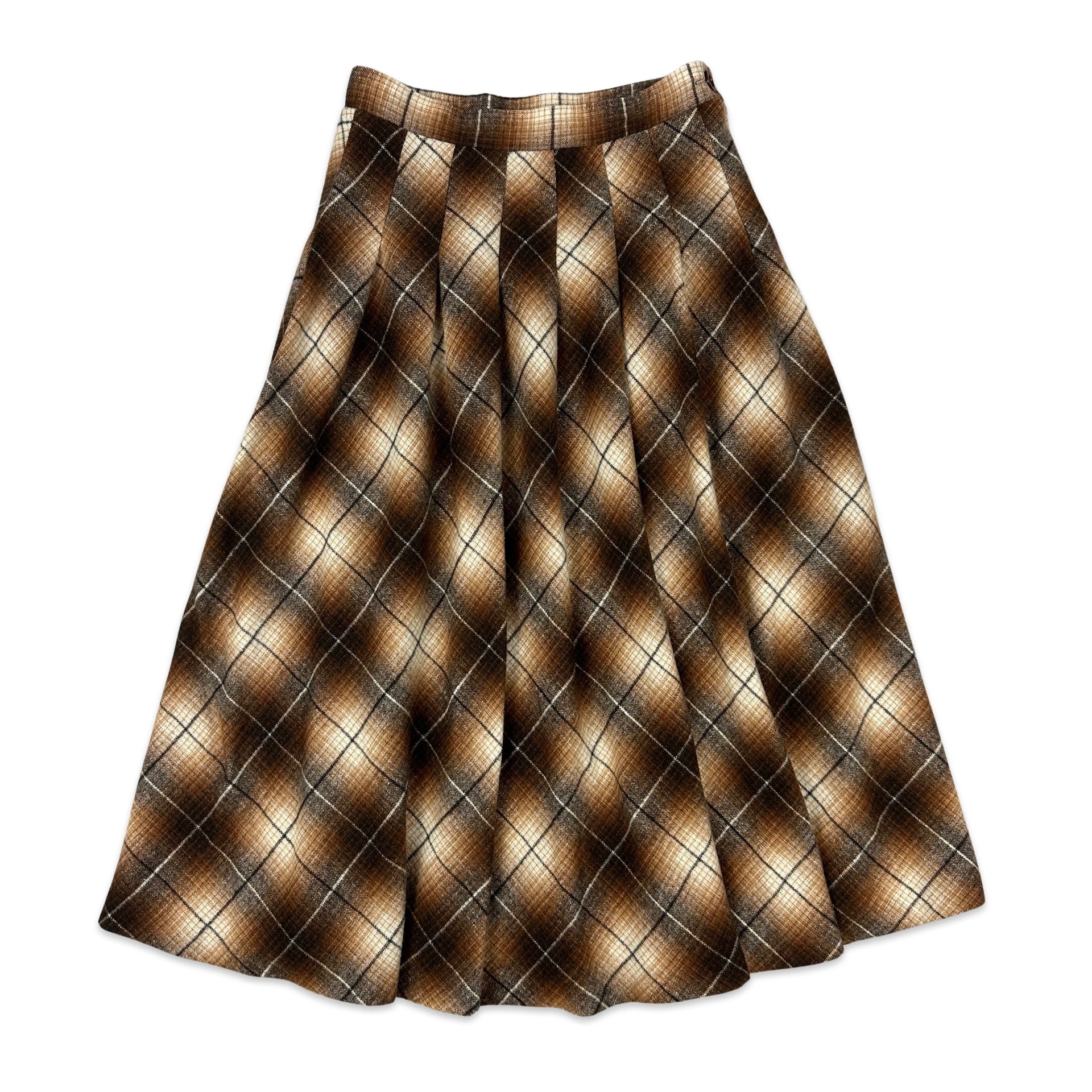 vintage black and brown tweed style pleated check wool blend midi length skirt.
