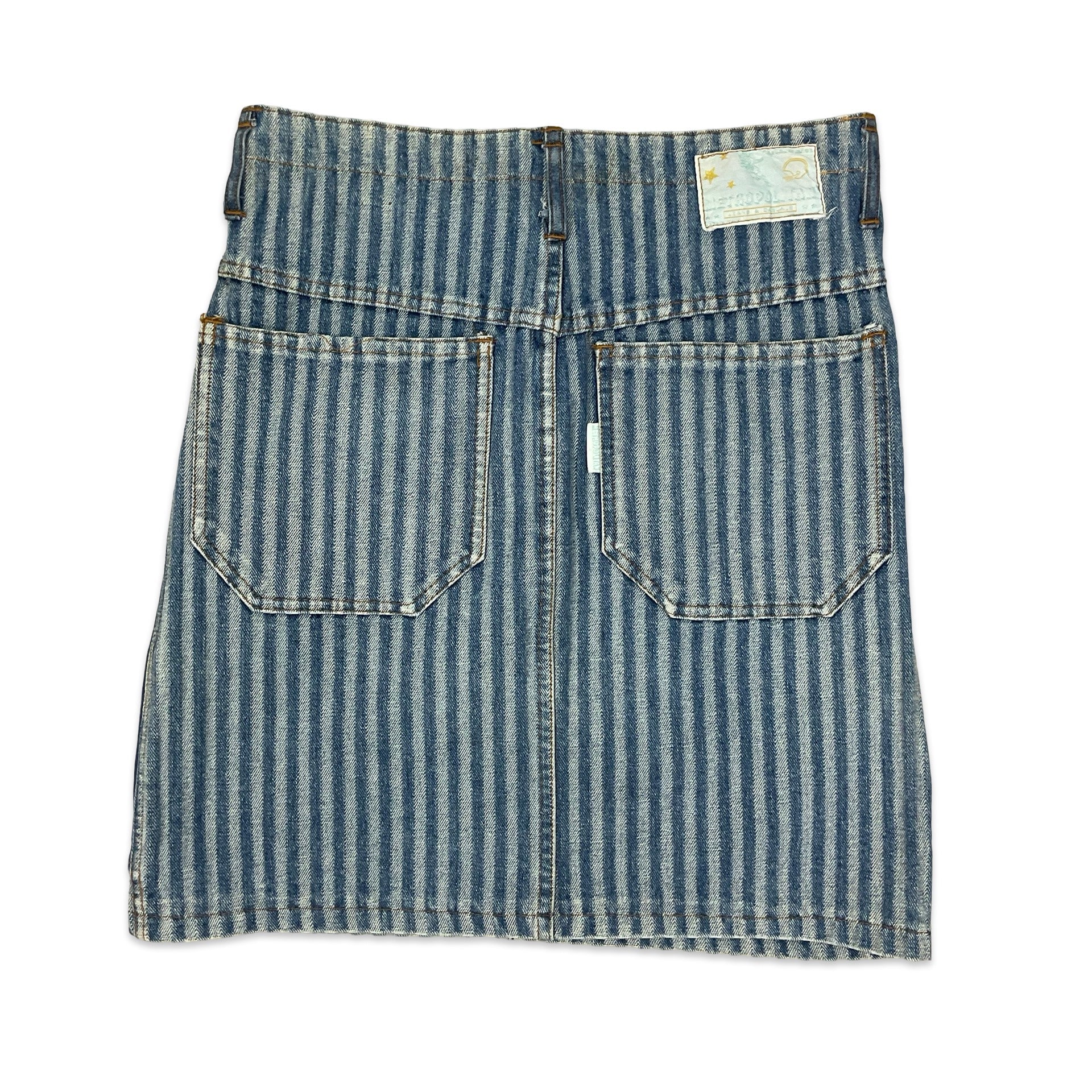 Vintage striped denim midi skirt with multiple pockets.