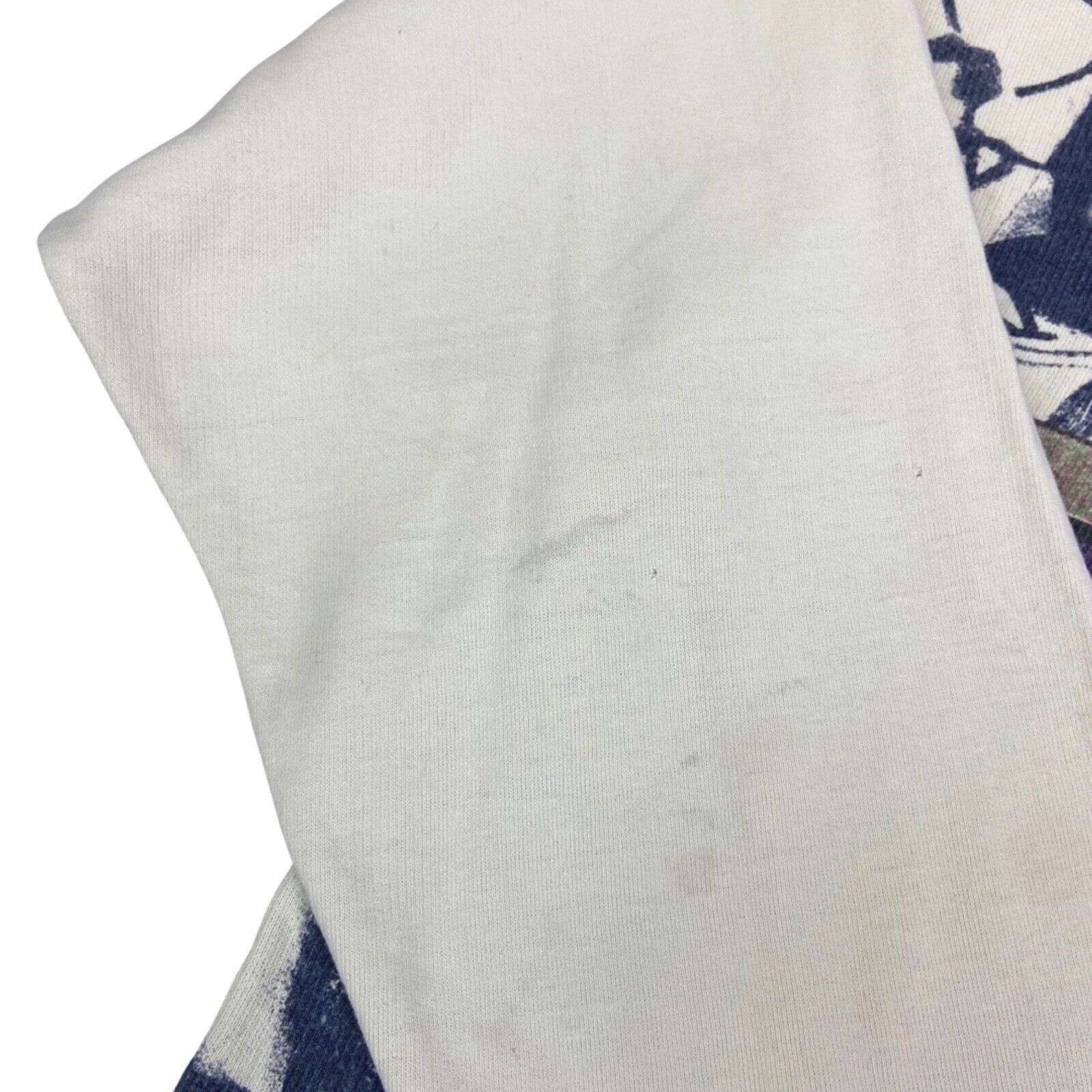 This is an awesome super rare Bevis and Butt-head long sleeve. It has a great round neckline, long sleeve and a boxey fit. There is a double graphic featuring Bevis and Butt-head and multiple speech bubbles. These colourful graphics are eye catching and fun. There is a slight stain and small hole on the arm of this item however it does not affect the overall look of the piece.