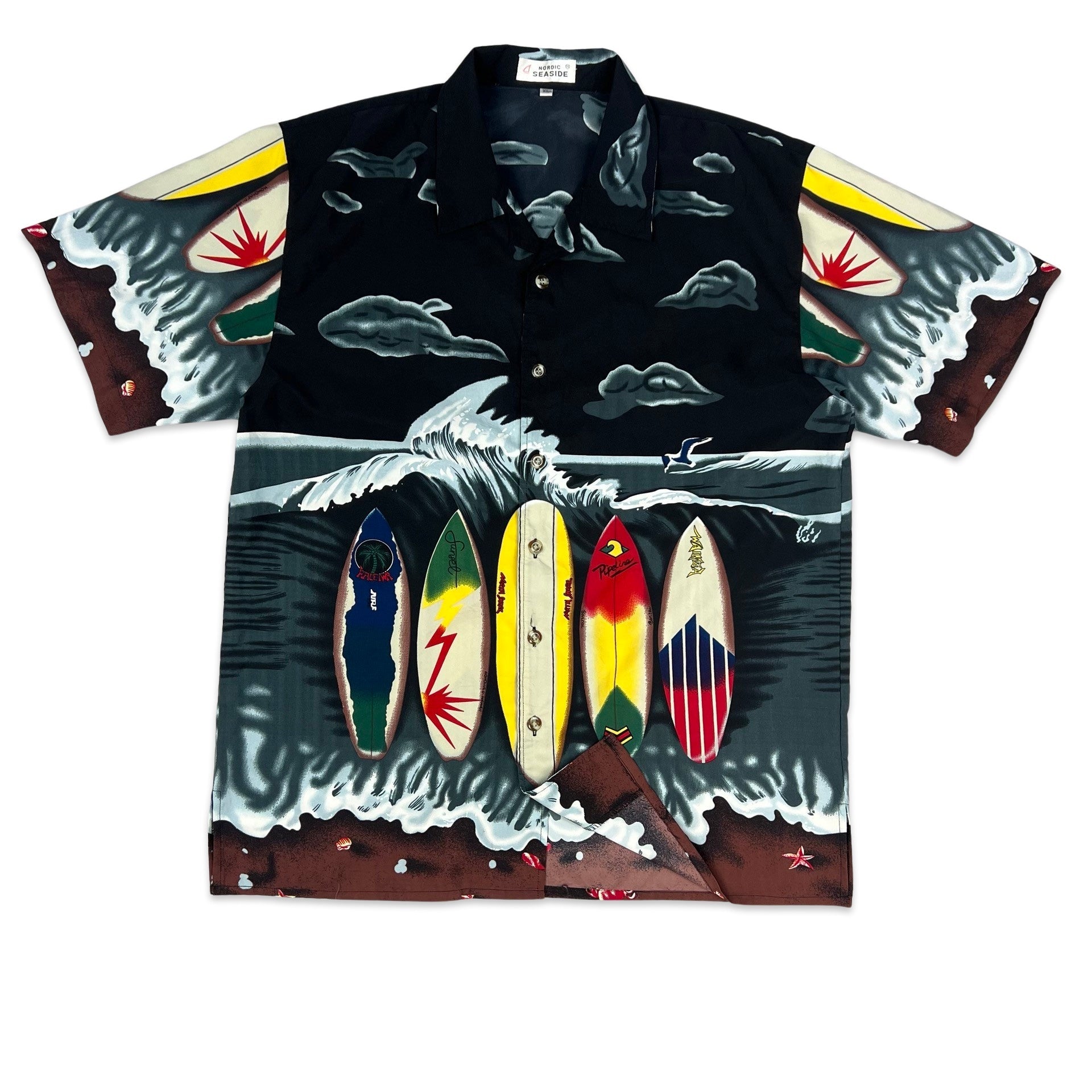 Vintage Y2K men's Hawaiian style shirt with large surfboard beach print.