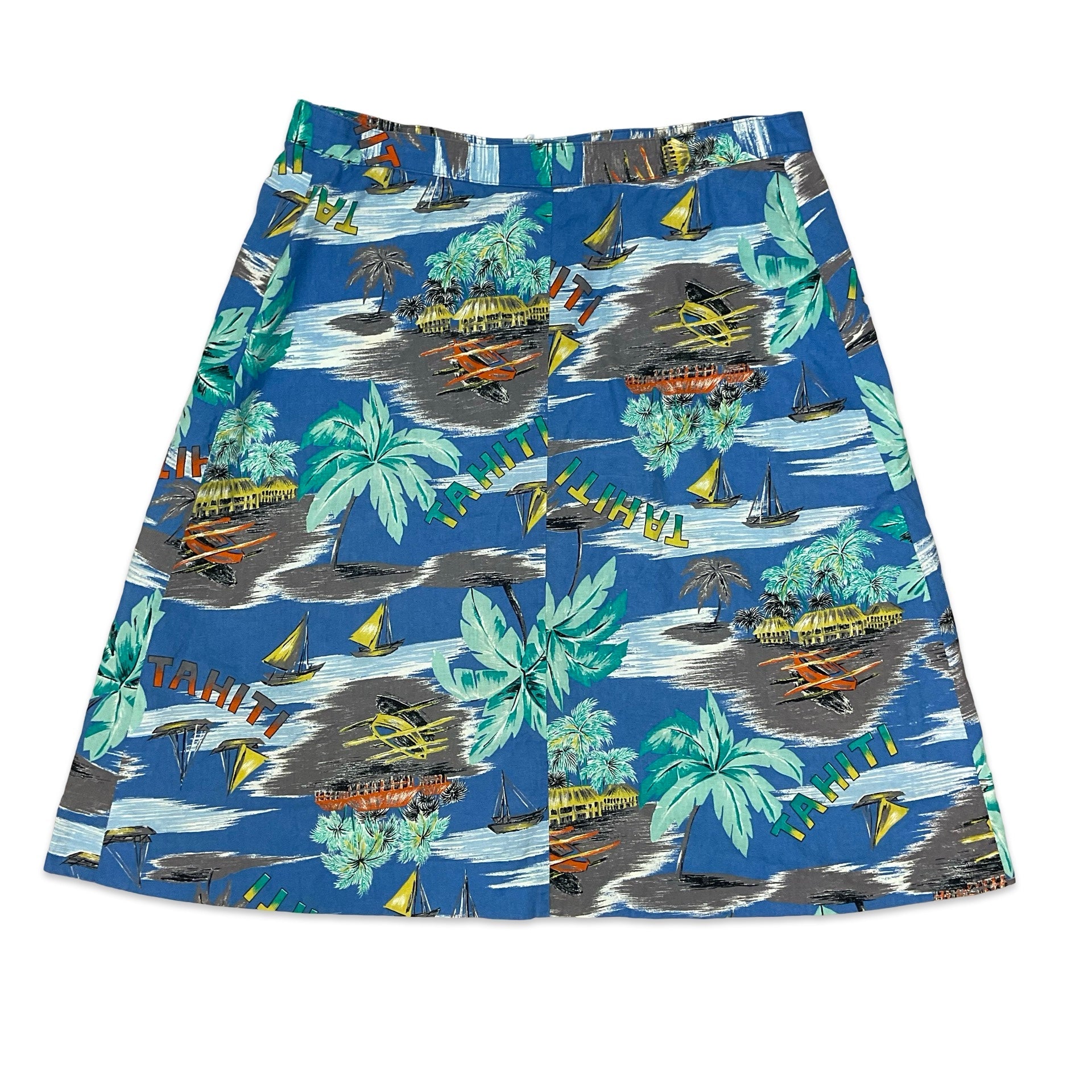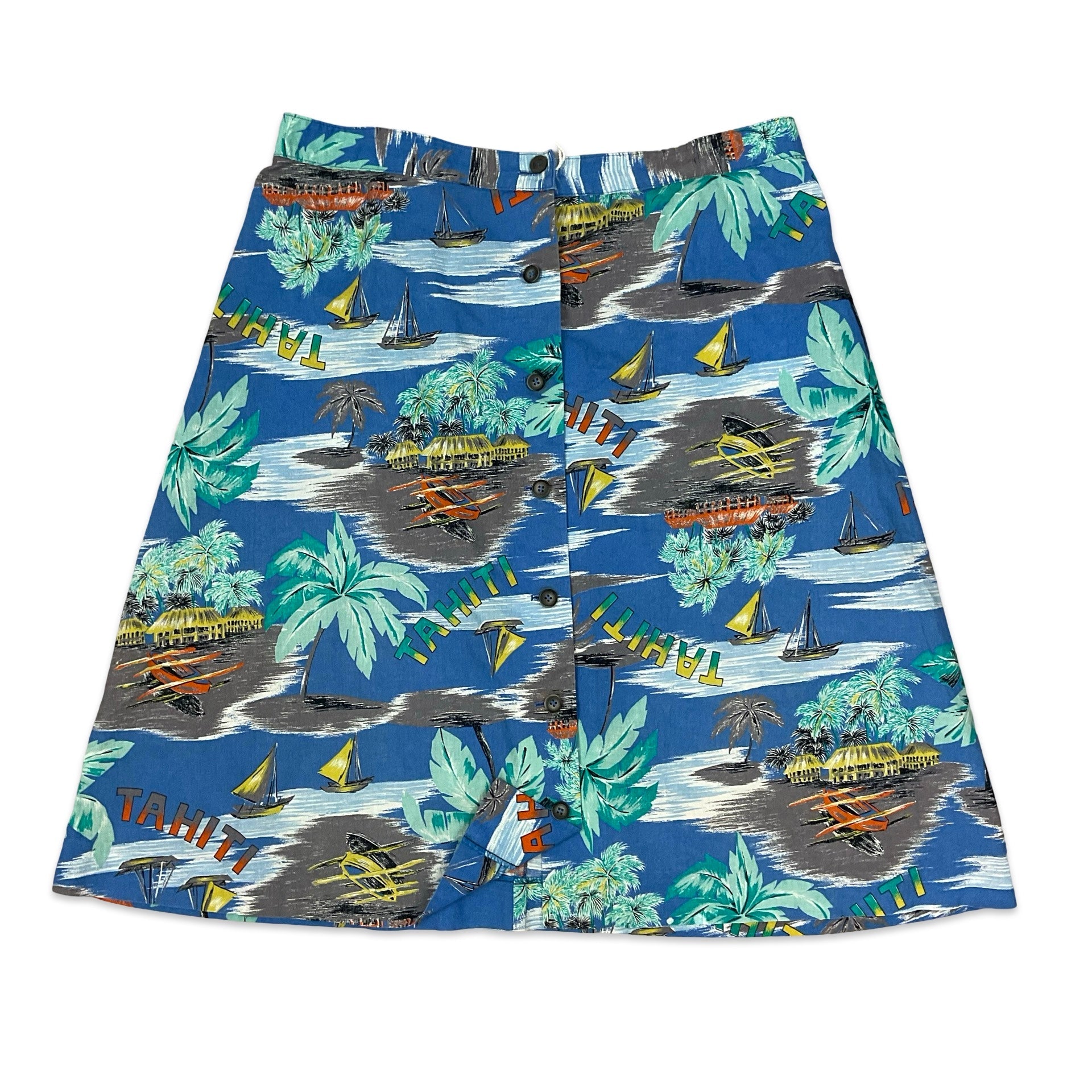 Vintage "Tahiti" Tropical Print Button-up A-line Midi Skirt 18