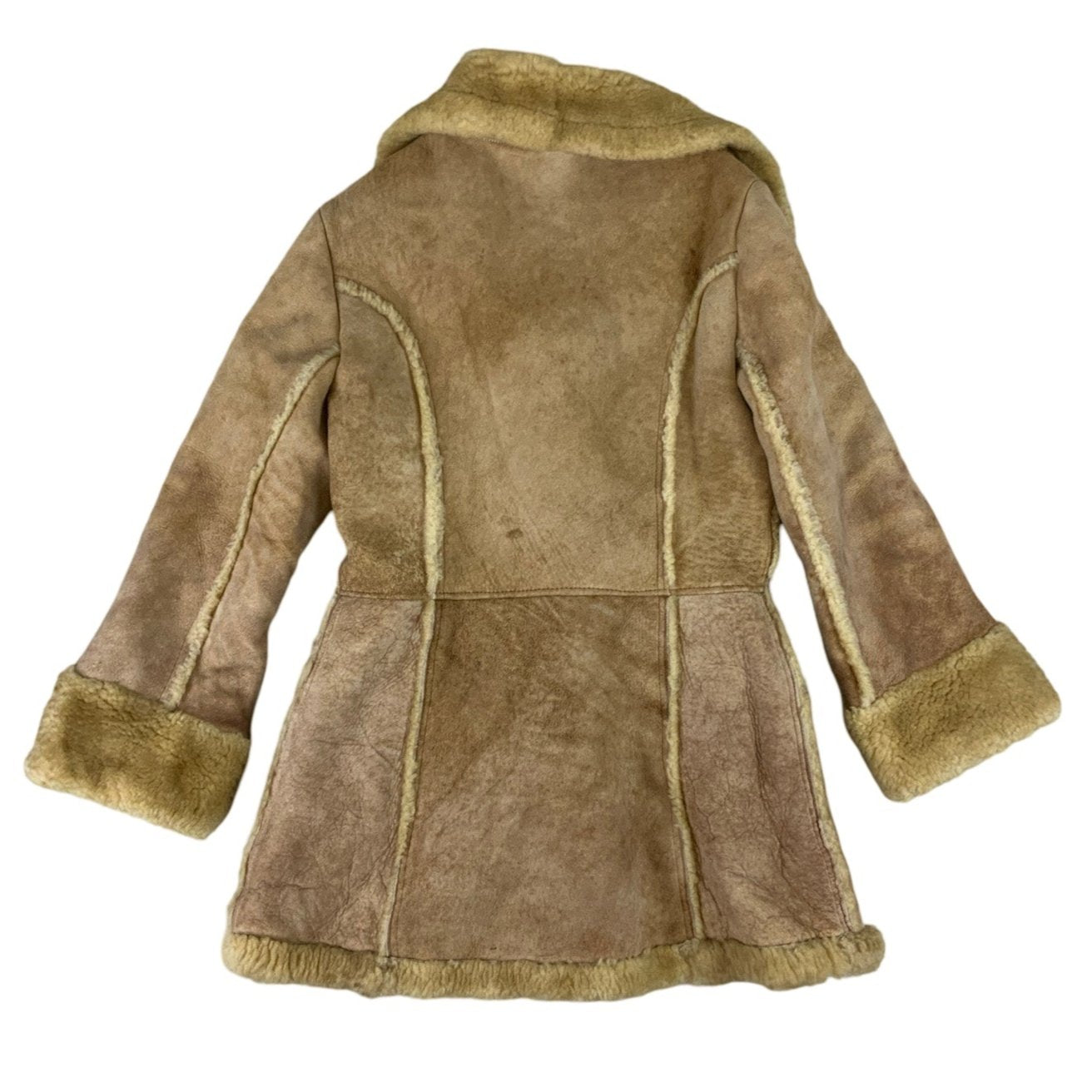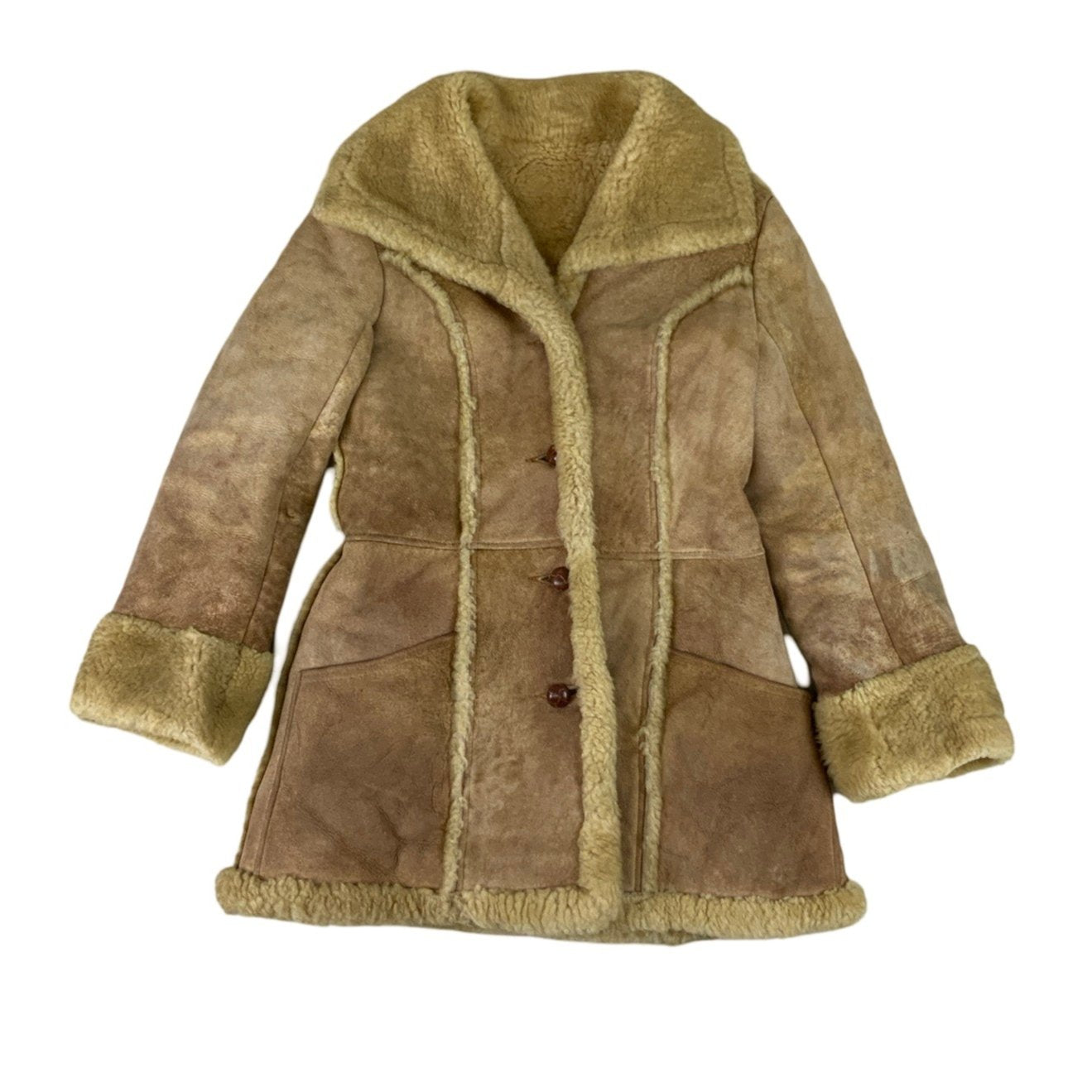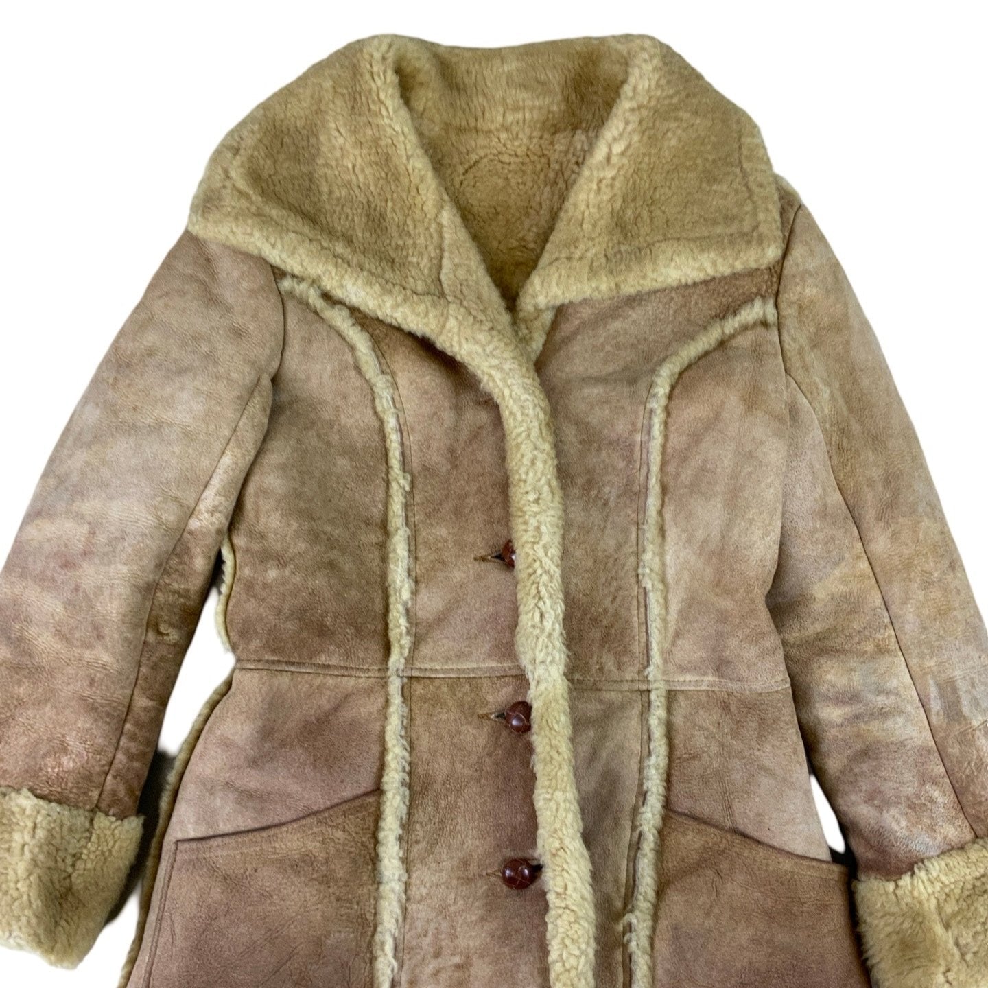Vintage 70s sheepskin/ faux suede shearling coat with faux fur/ piled fleece trim and collar. Light brown with reverse seem details. front pockets. Buttoned front fastening.