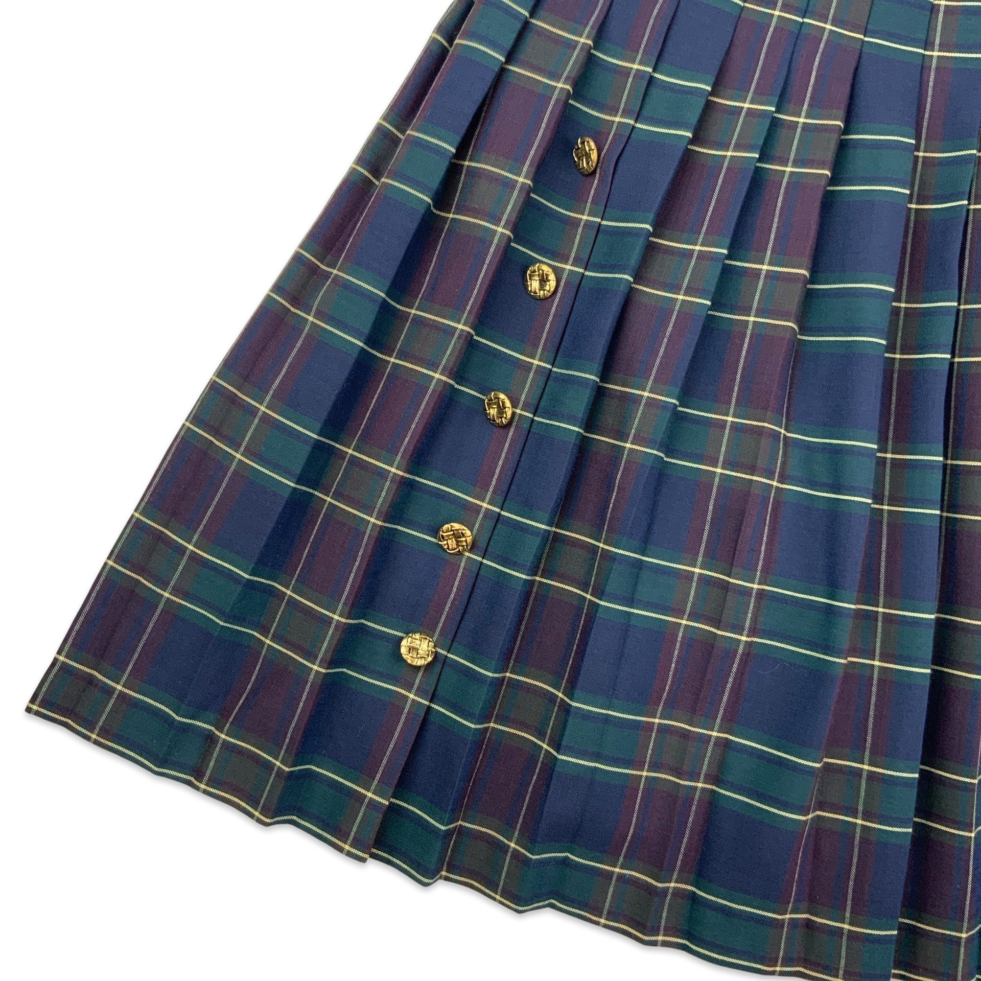 Women’s vintage pleated skirt. Navy, purple & green tartan print with gold button detail on front. Side zip fastening.