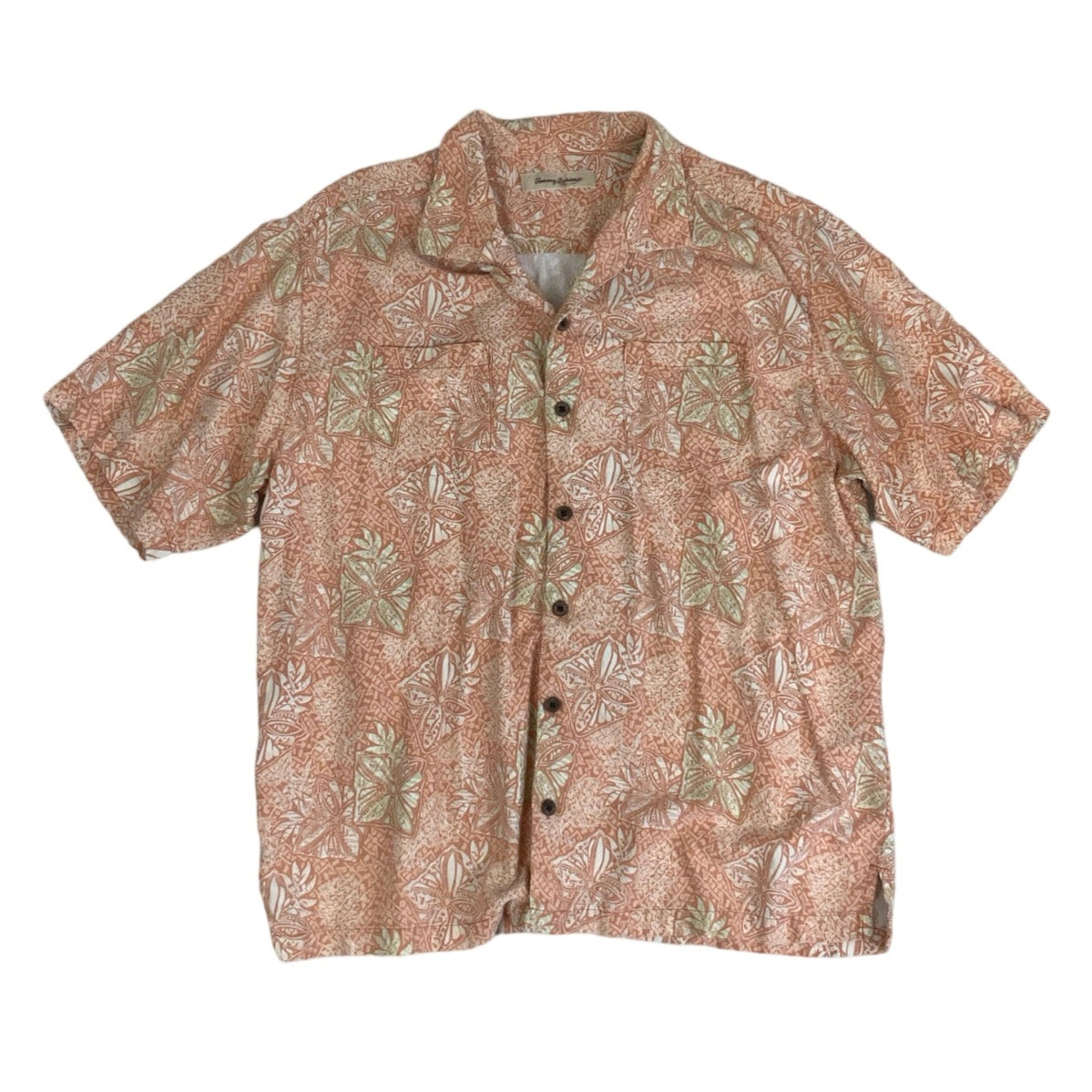 Vintage 'Tommy Bahama' Peach Pink White Hawaiian Floral Short Sleeved Shirt L XL