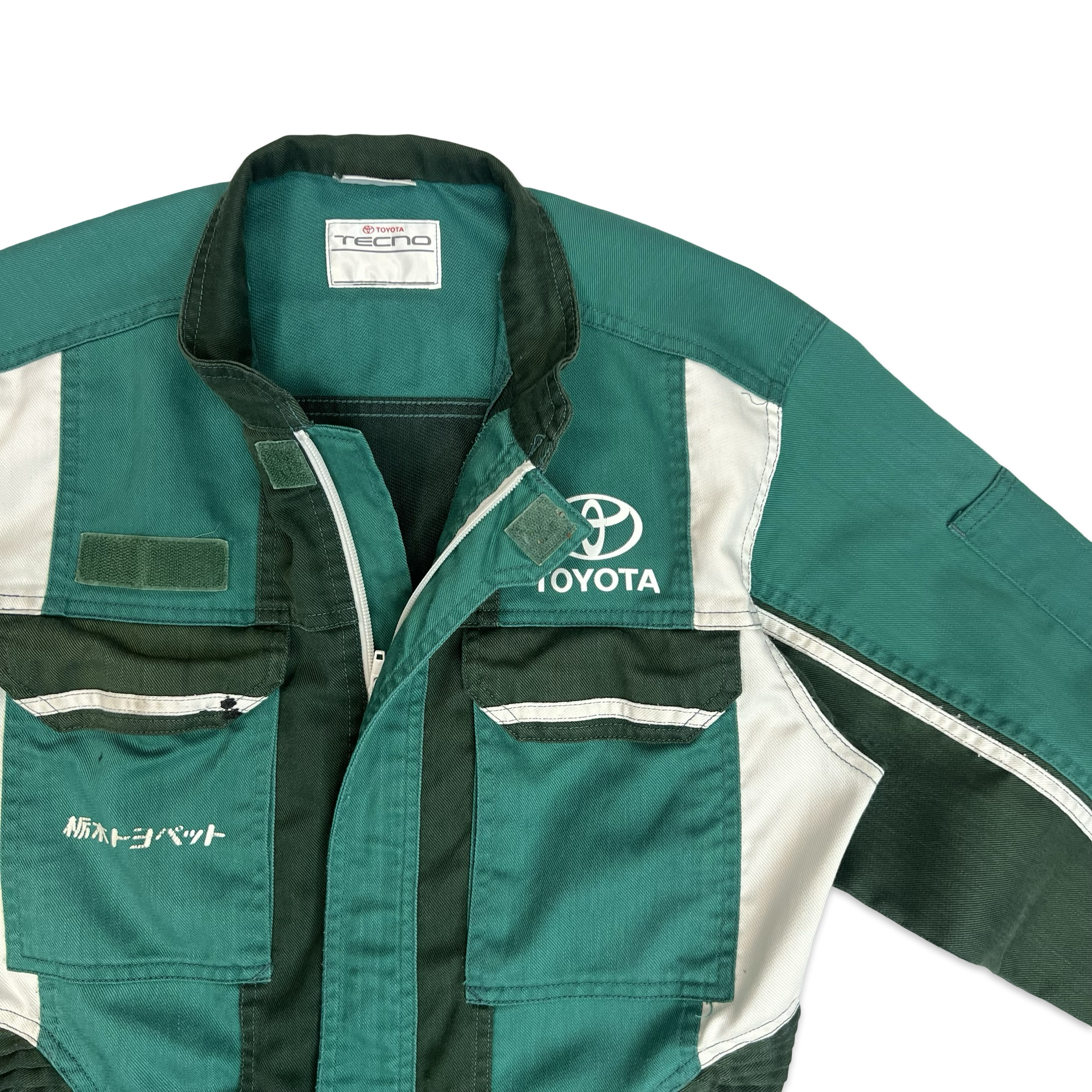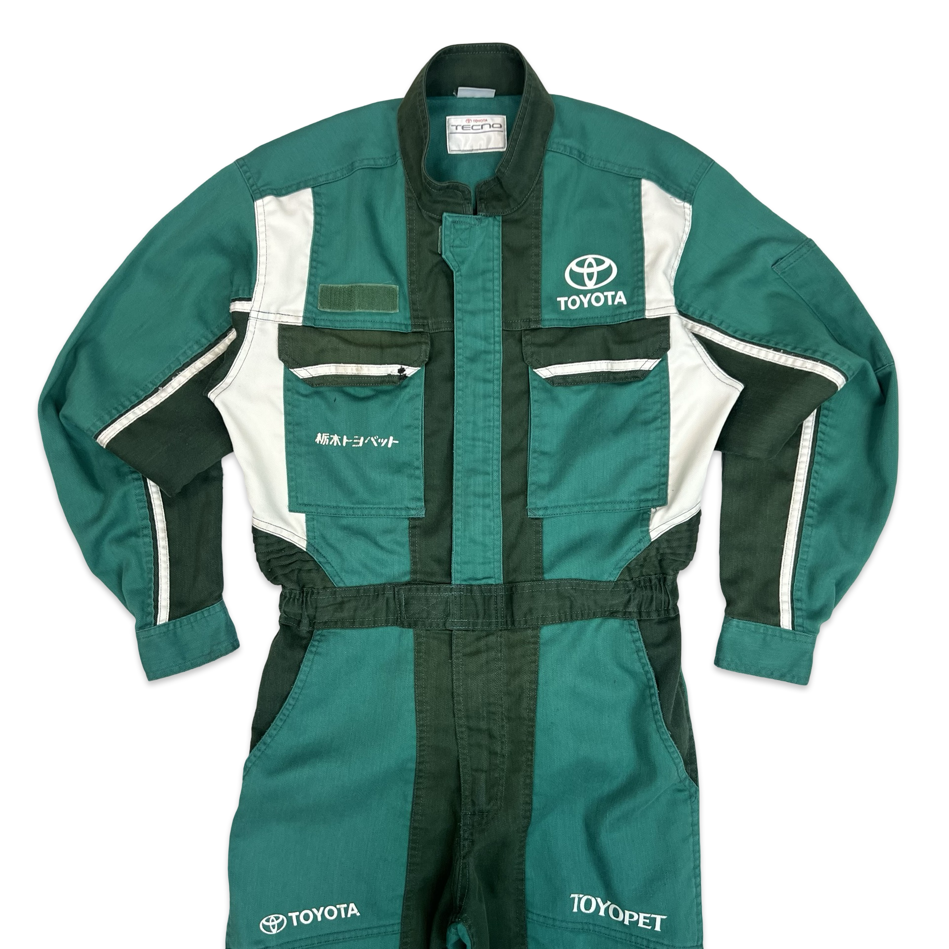 Vintage Toyota Tecno Toyopet technician jumpsuit in green with multiple printed spell outs and full zip-up front. Some marks and wear as pictured, as expected with vintage workwear.