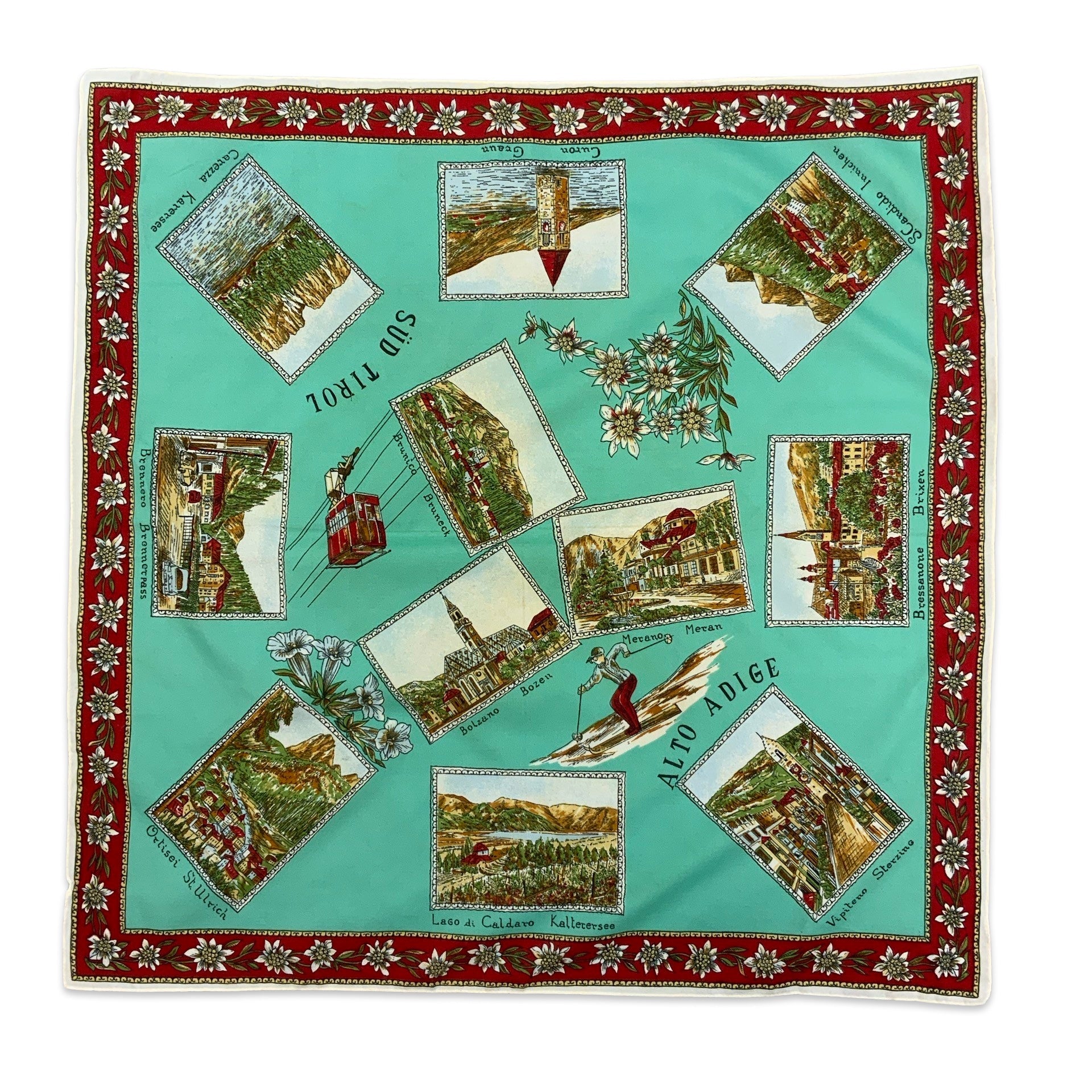 Vintage souvenir scarf from Italy with illustrated landmark design. Lightweight, semi sheer. Multicoloured in turquoise blue, red, green and cream.