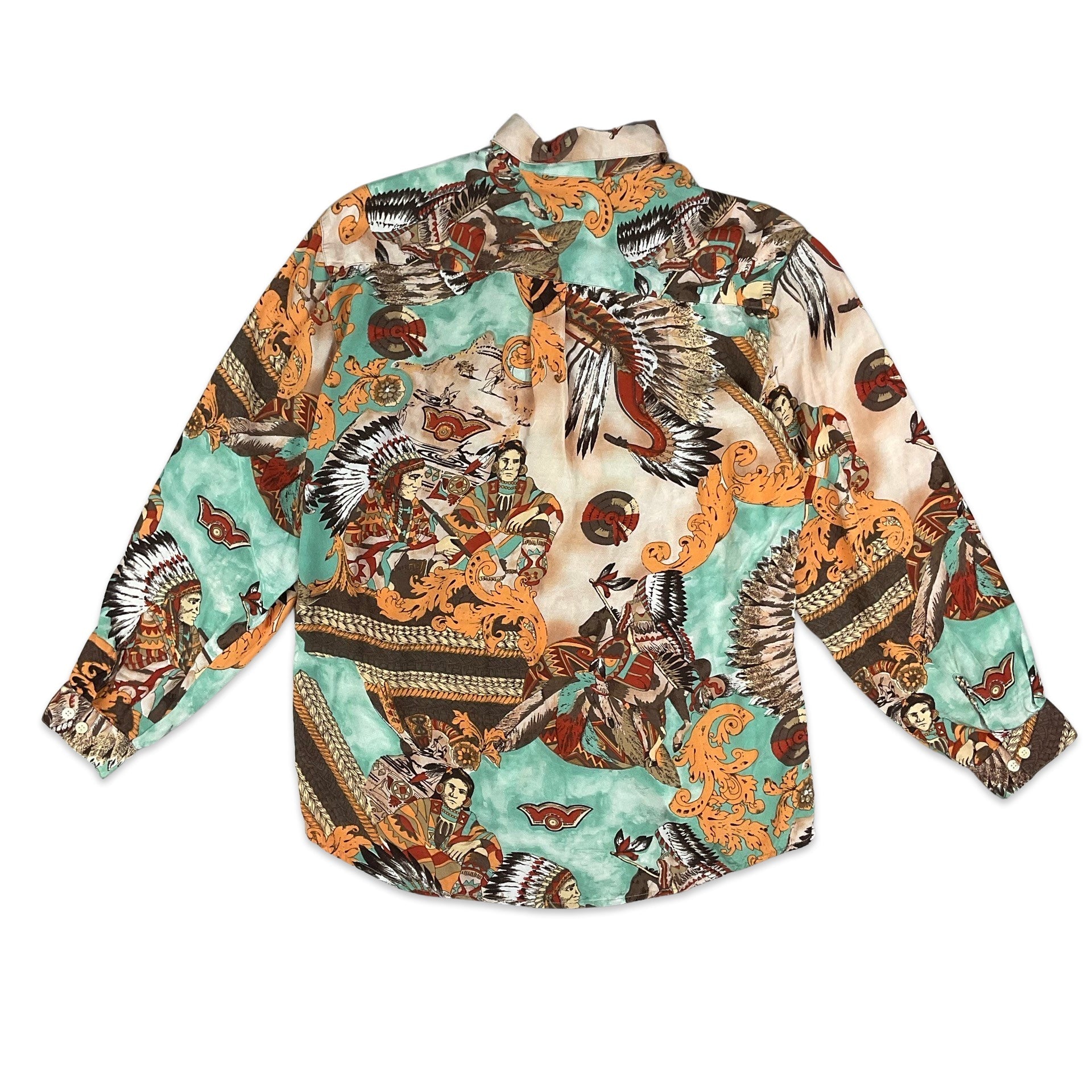Men’s vintage long sleeve shirt. Western print in orange, teal, brown and red colours with pearl white buttons. Lightweight fabric.