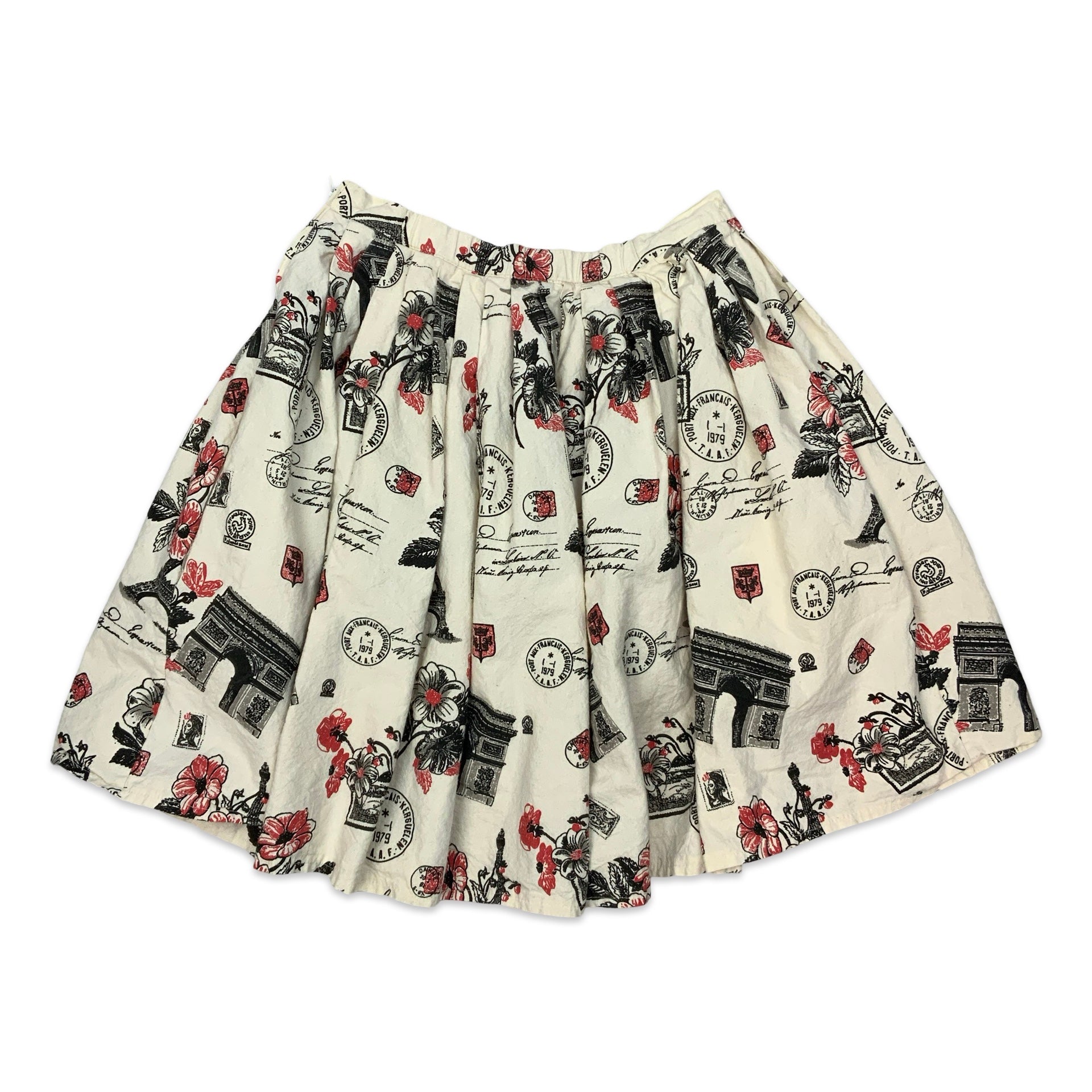 Women’s vintage pleated, puff ball skirt. Side zip fastening with 2 hidden side pockets. White with red & black floral, architectural print.