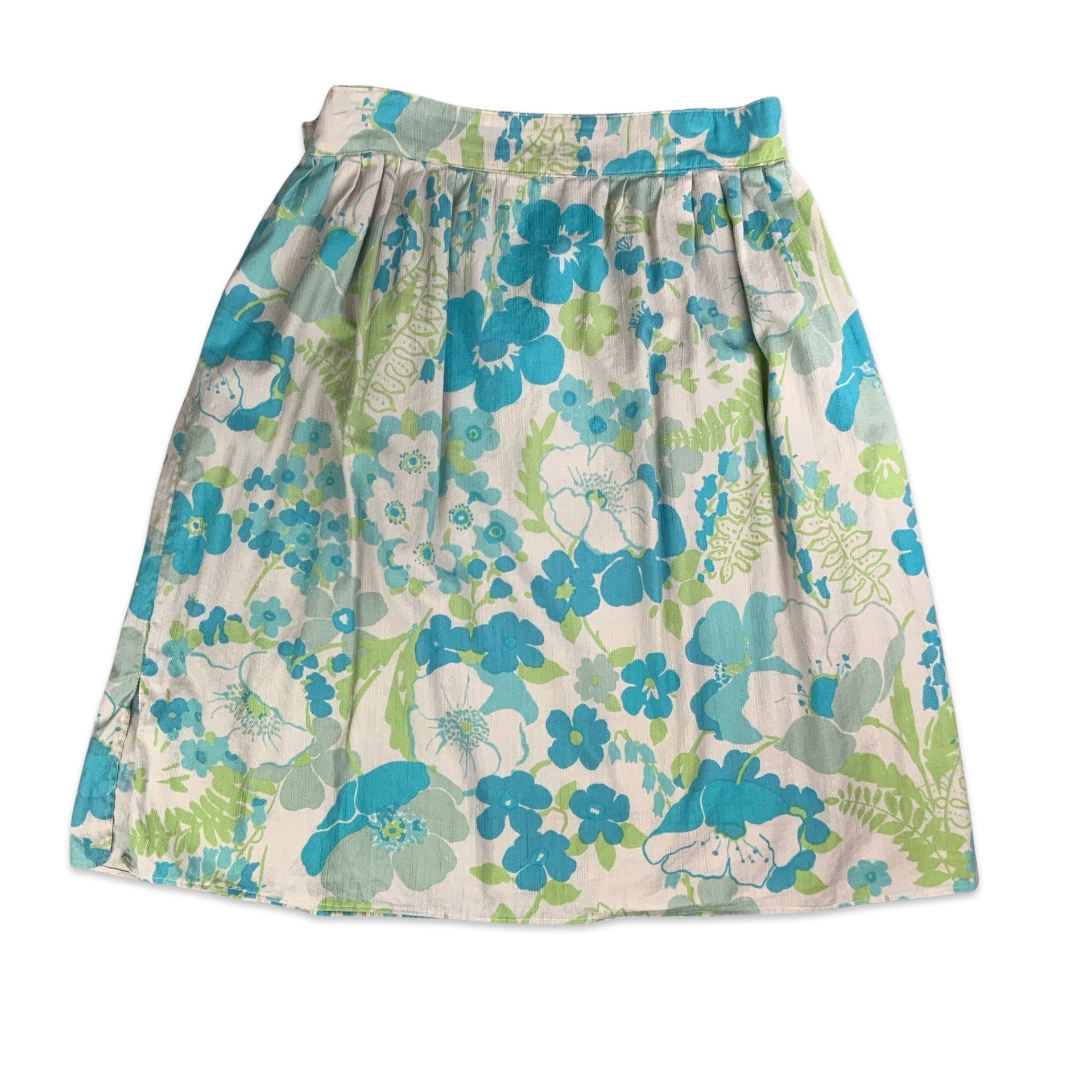 Women’s vintage pleated midi skirt. Popper button and side button fastening. Handmade item. White cotton fabric with green and blue floral print.