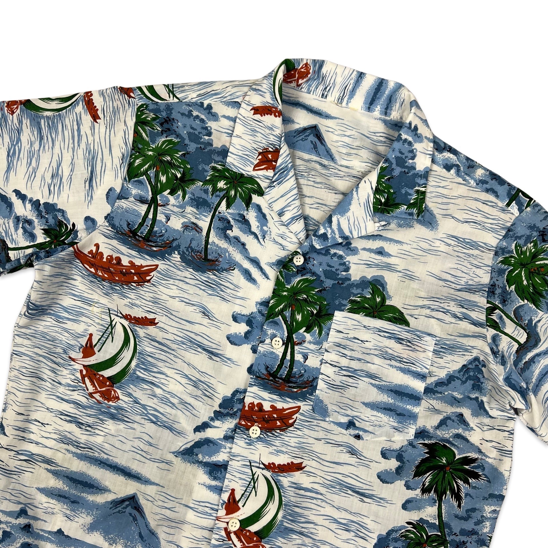 Vintage Hawaiian style shirt with all-over island print in white, blue, and green, with chest pocket.