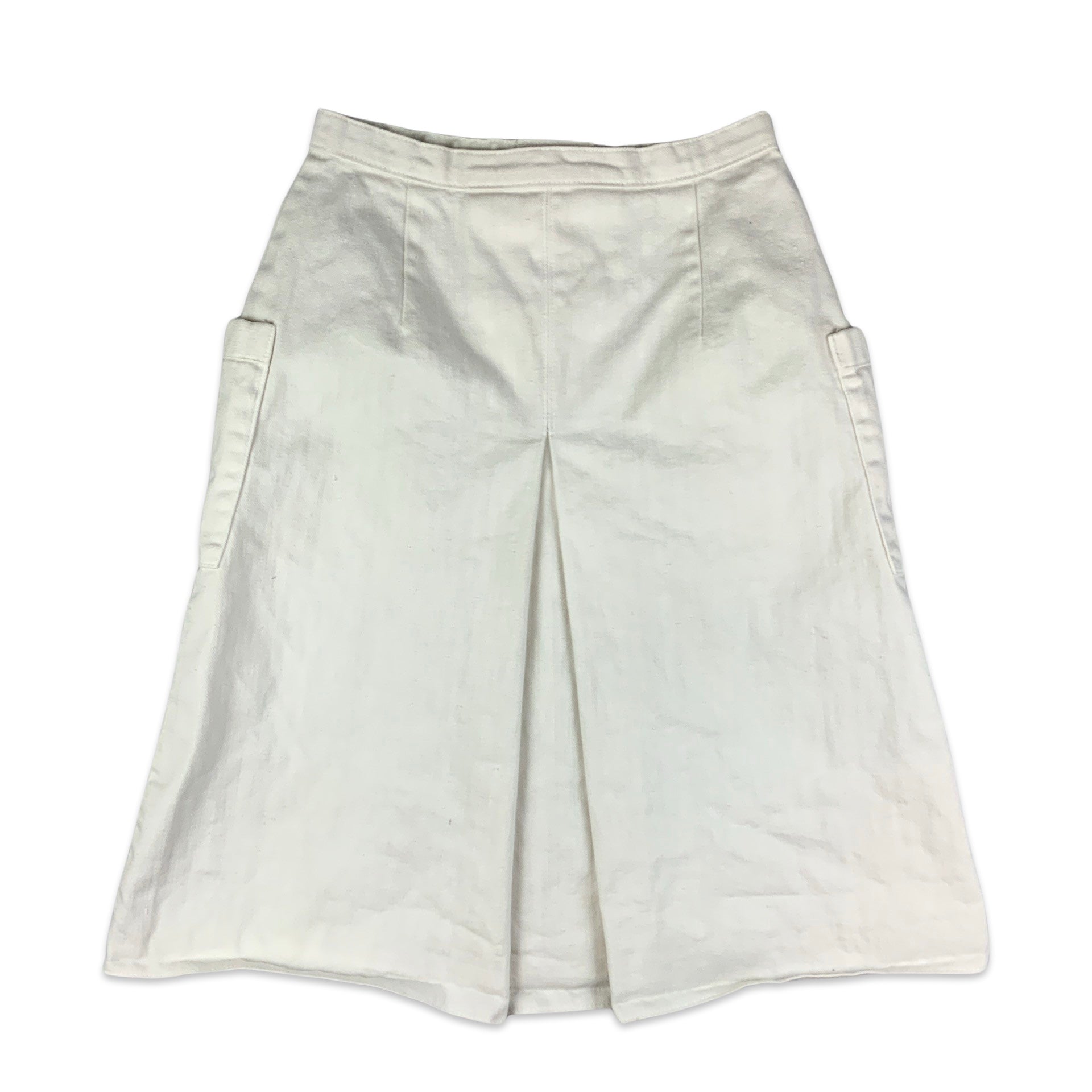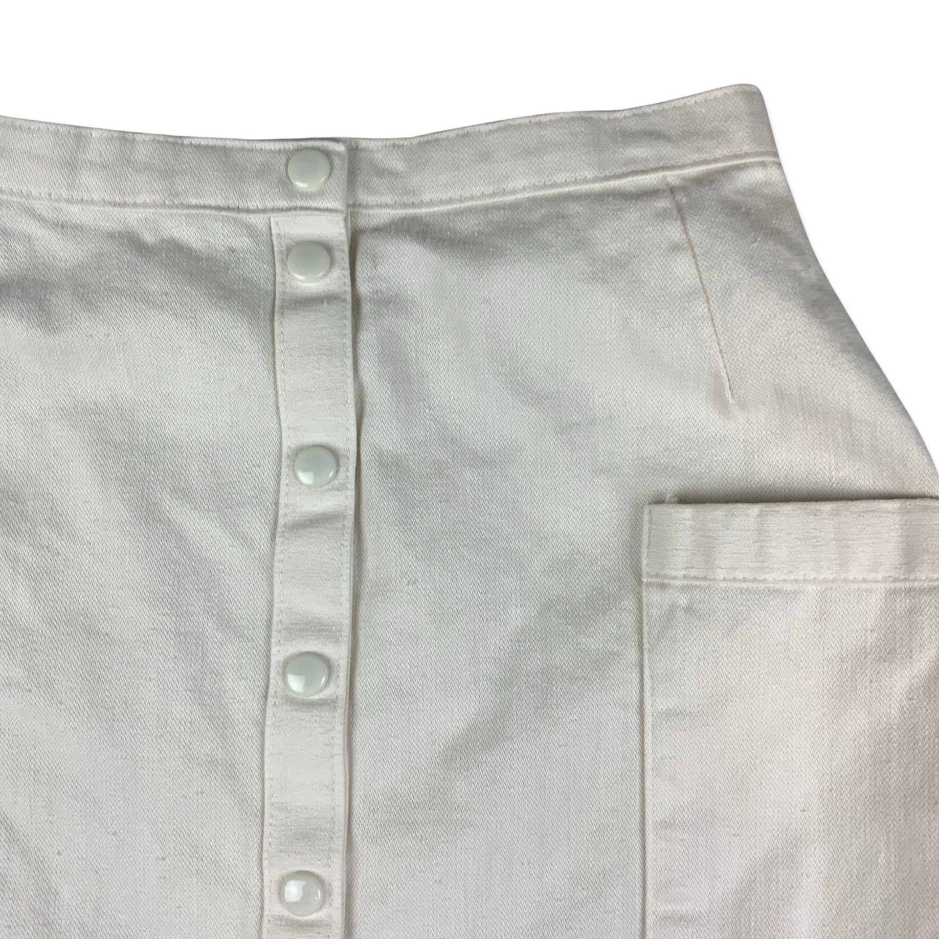 Vintage canvas button-up skirt in white with back box pleat and exterior large pockets.