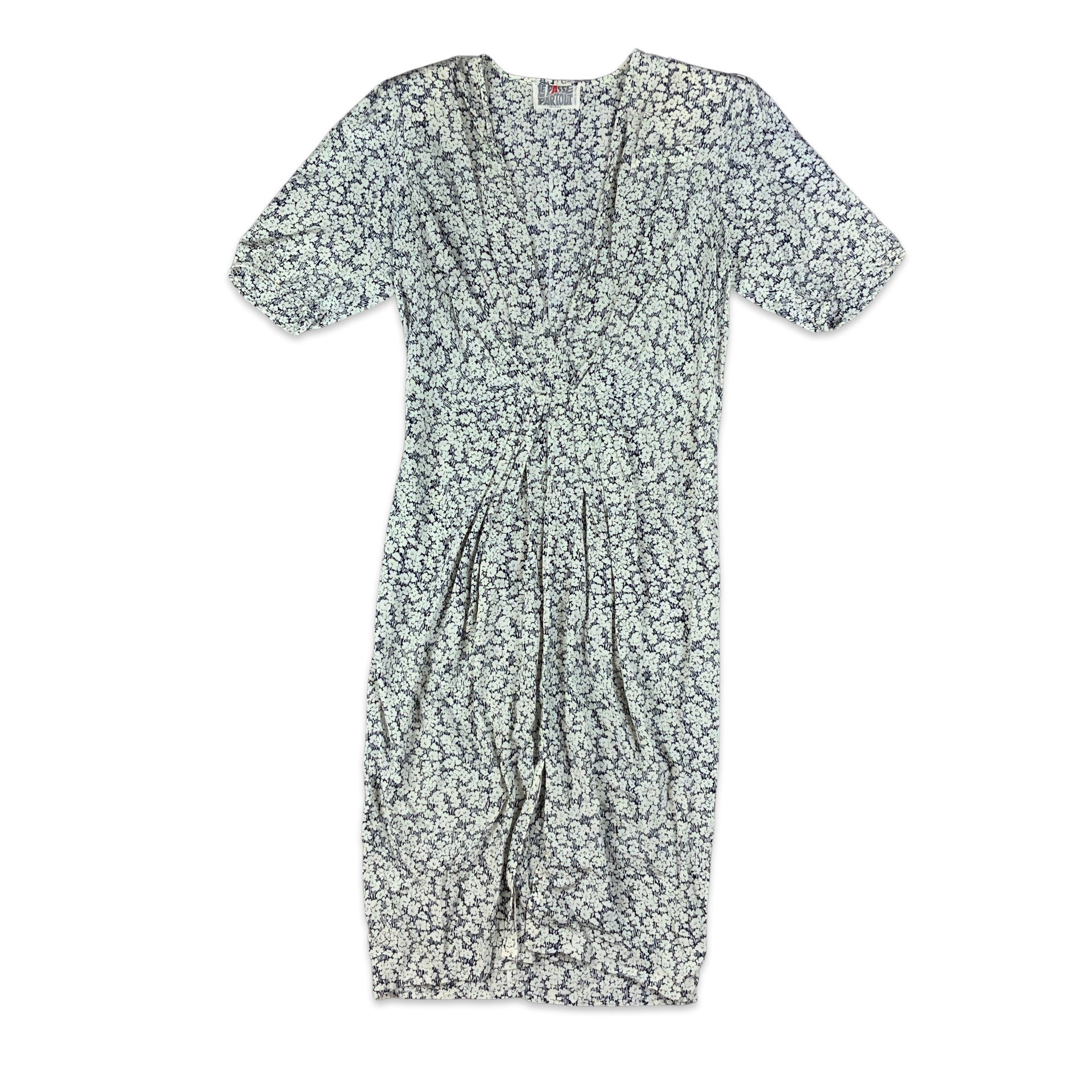 Women’s vintage floral midi dress. Low V neck, short sleeves with shoulder pads and a small front slit (9 inch). Lightweight white navy fabric. Side zip fastening.