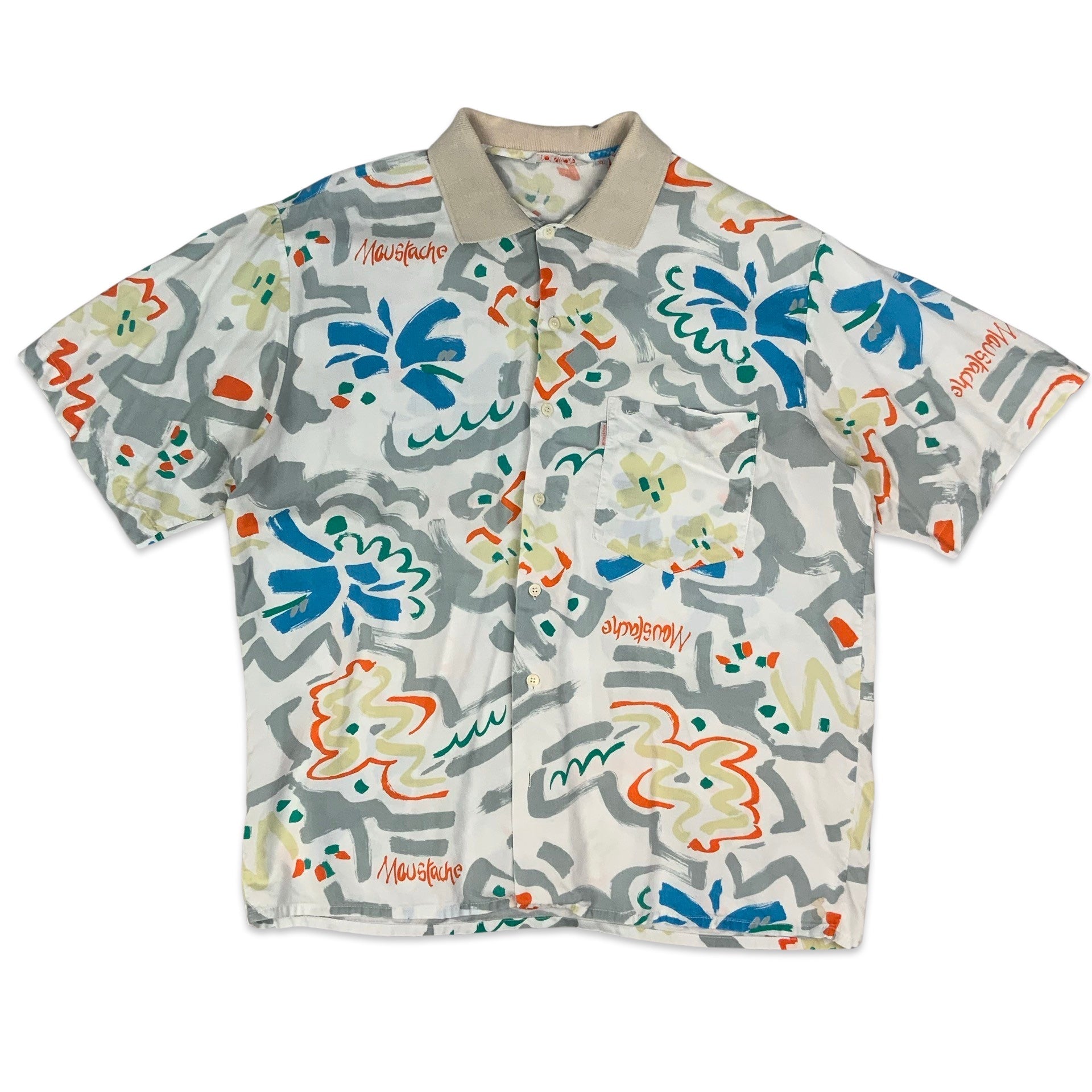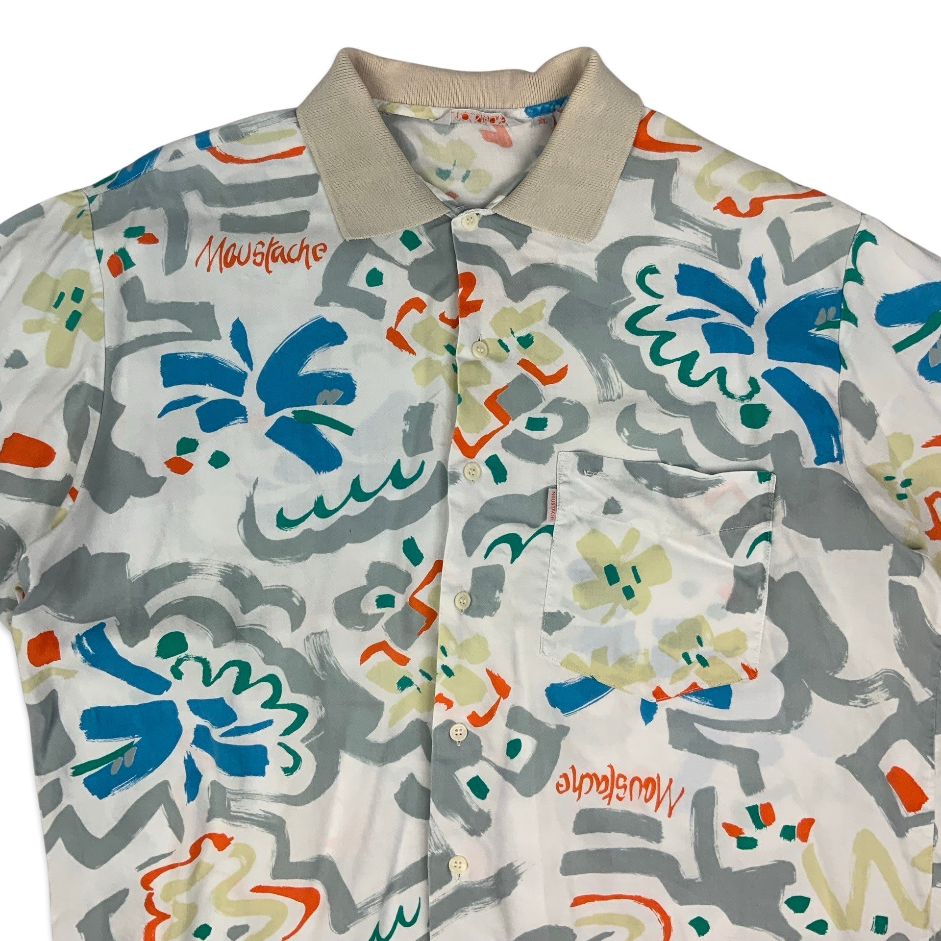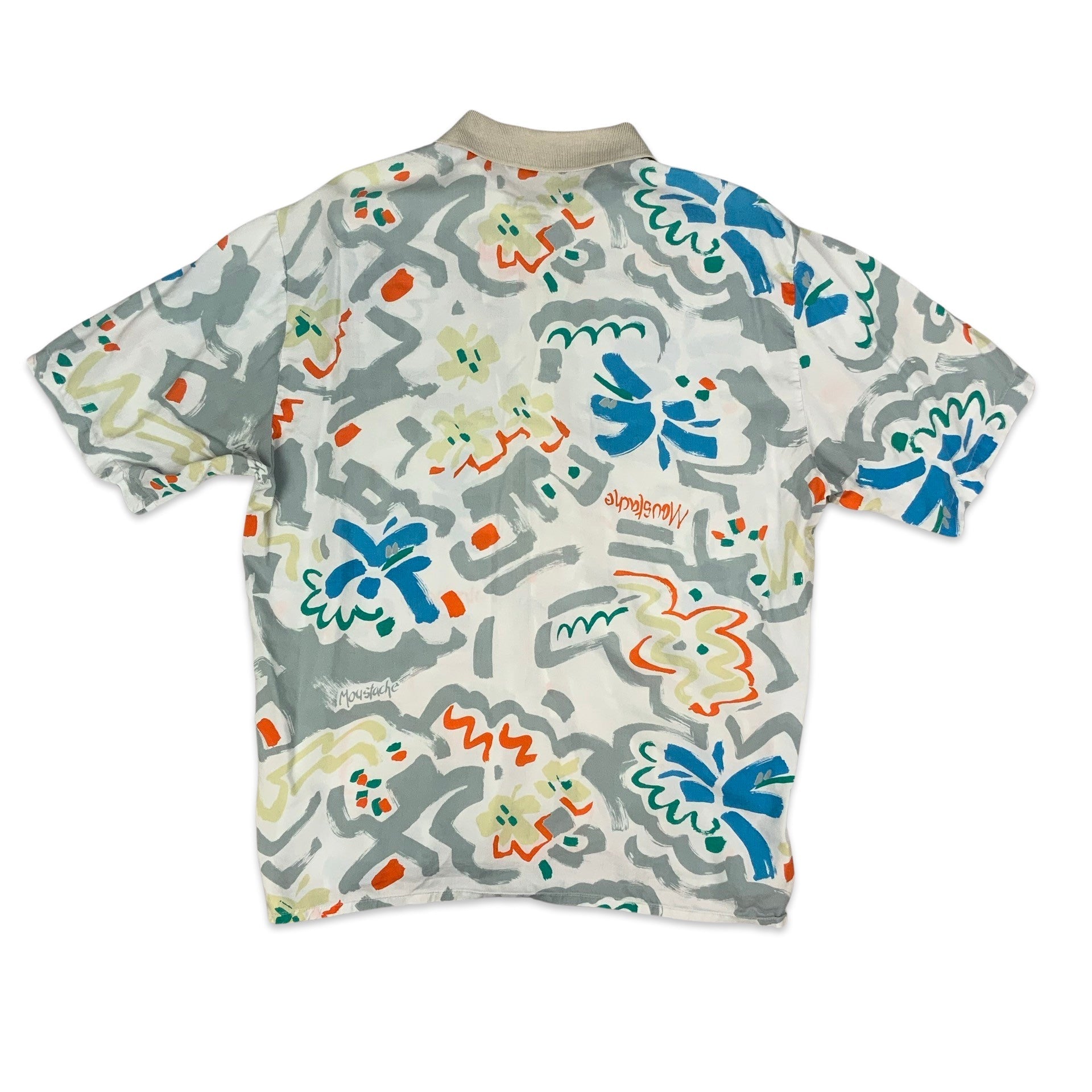 Men’s 1980s short sleeve shirt. White, grey, blue, orange & yellow print with polo shirt collar. Brand: Moustache