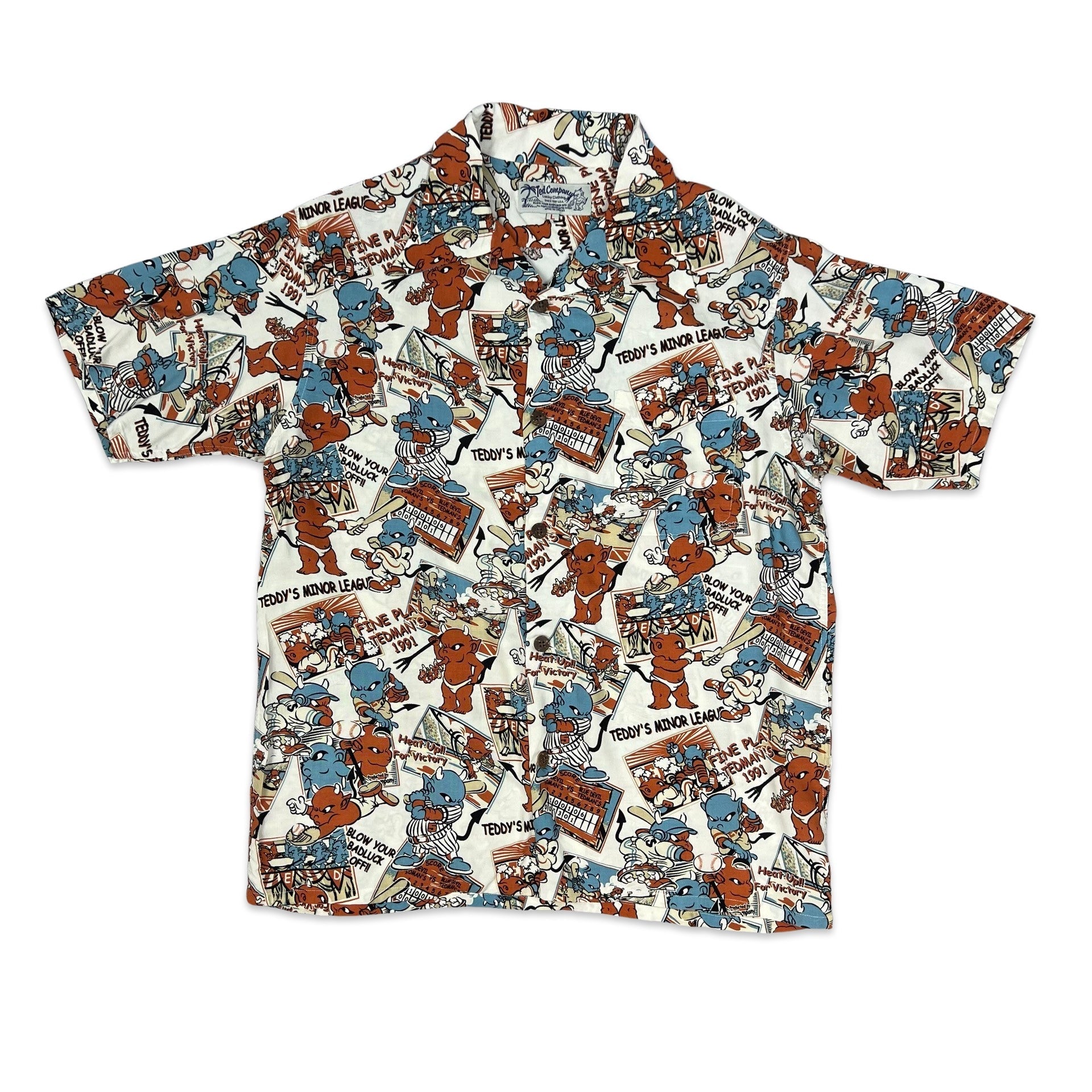 Vintage Hawaiian style shirt with all-over print of devil babies playing baseball.