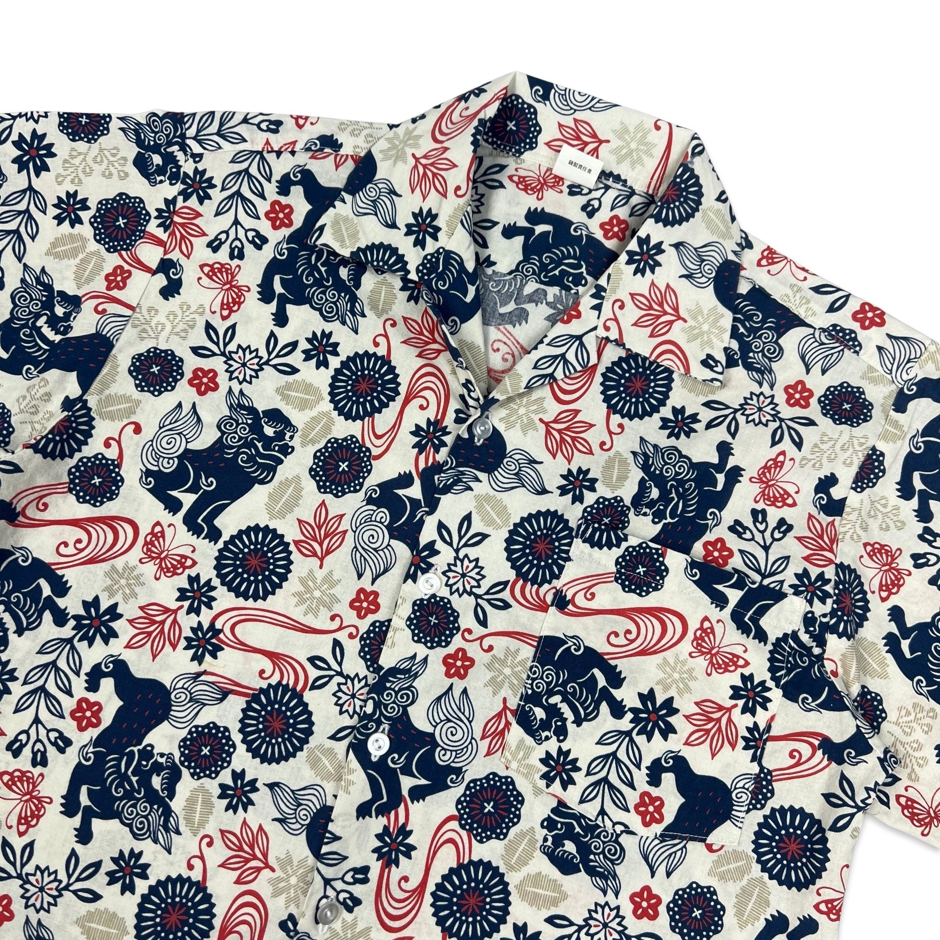 Vintage men's shirt with all-over abstract print featuring dragons in white, red, and navy.