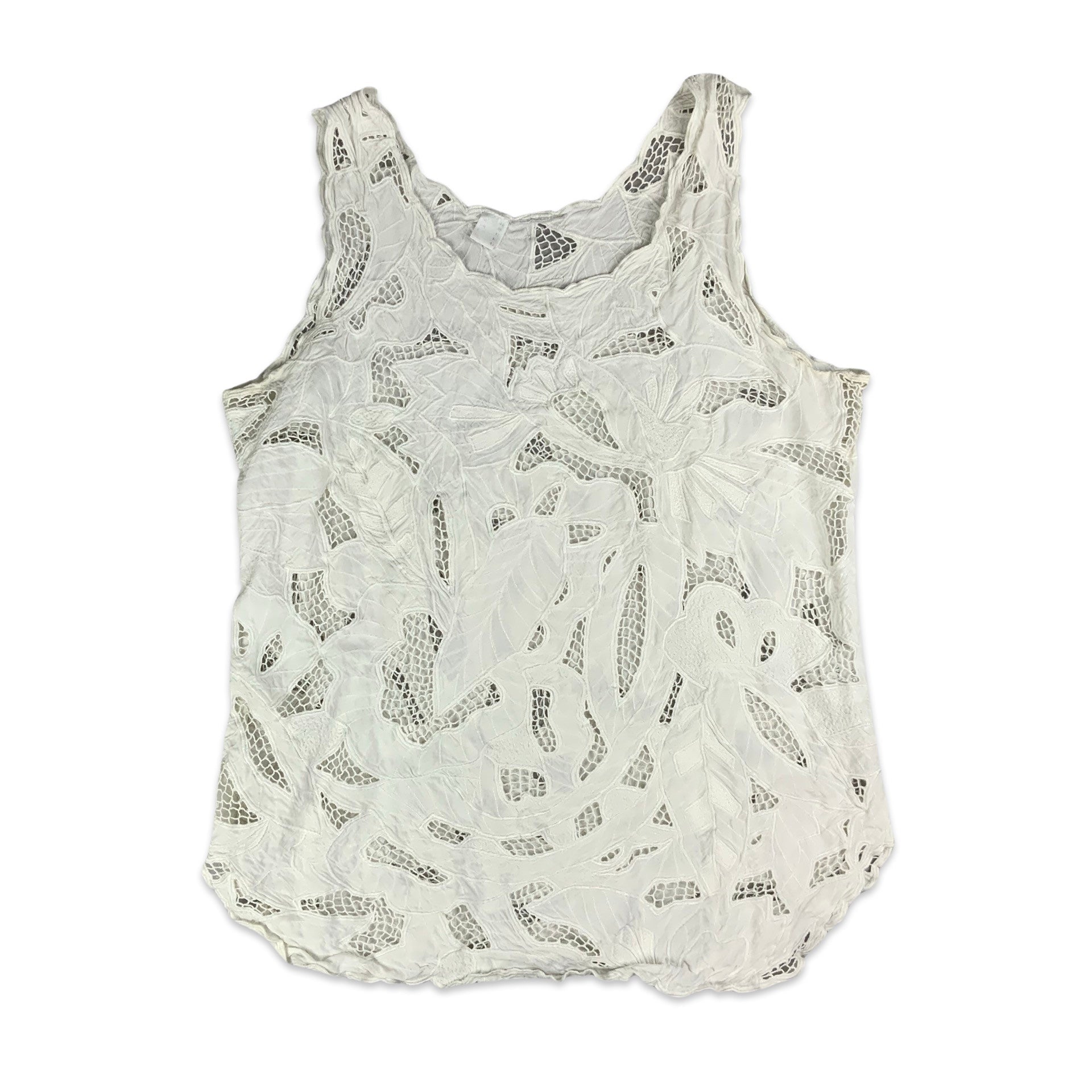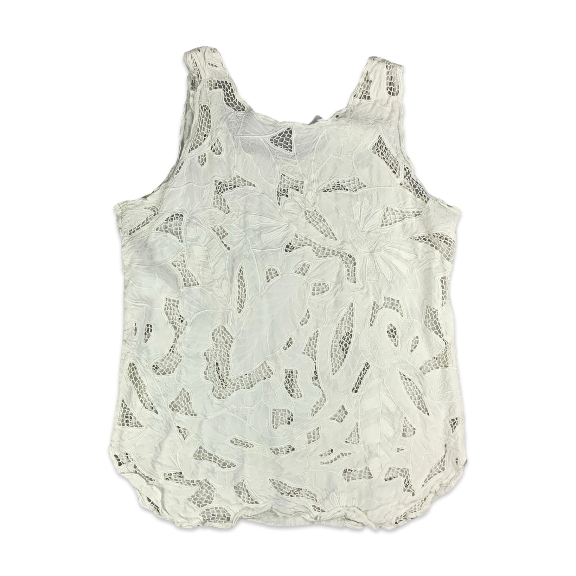 Women’s vintage vest top. White fabric with floral embroidery and net cut outs.