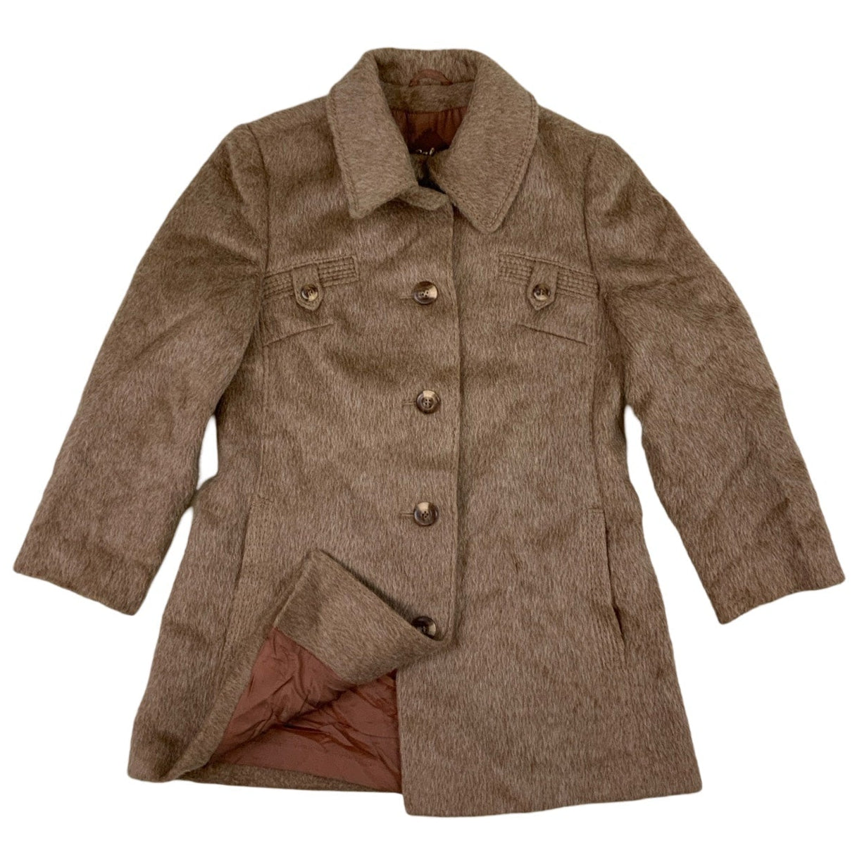 Vintage 80s Women's coat. brushed wool exterior pockets in tan . front button up fastening. 100% wool.