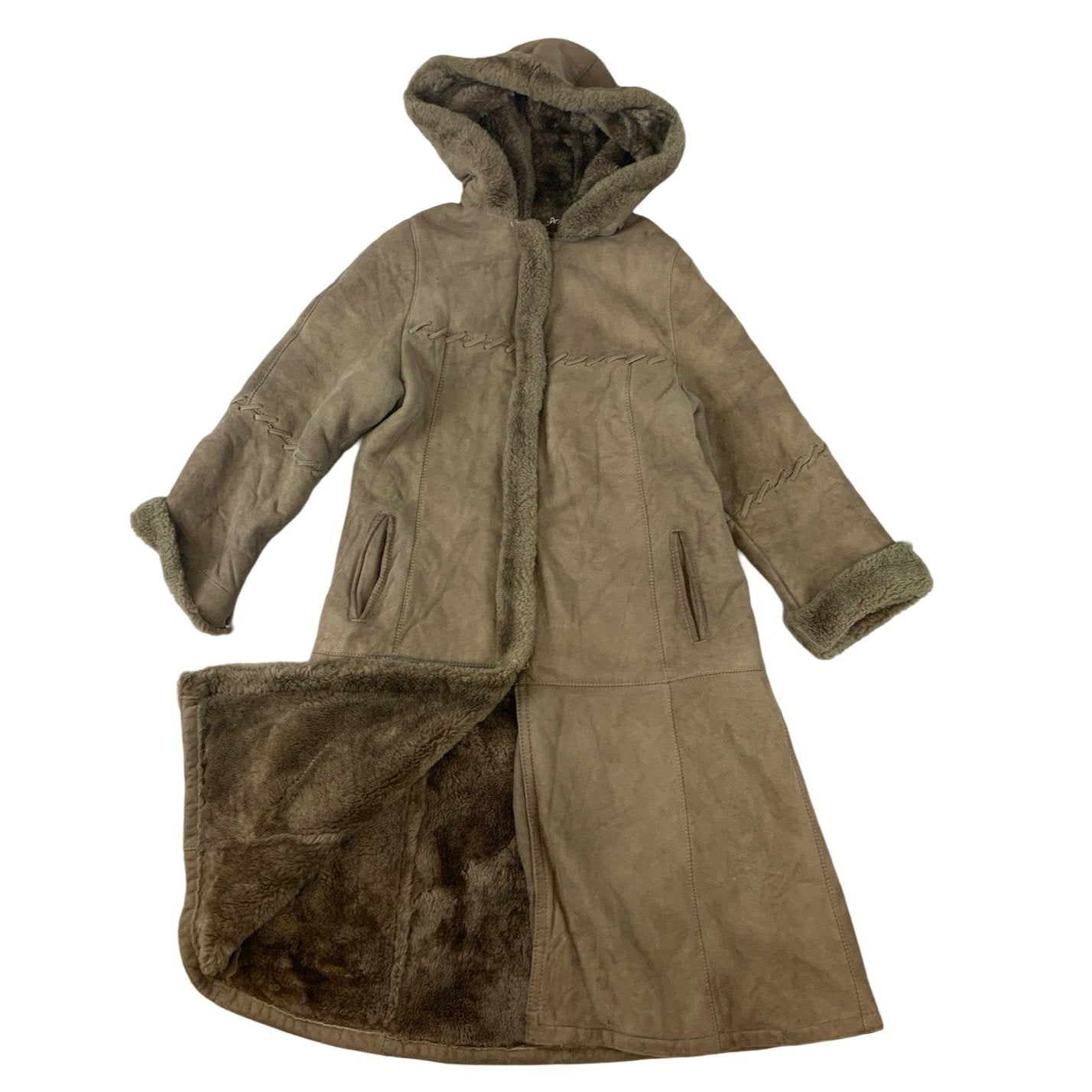 Vintage 70s sheepskin/ faux suede shearling coat with faux fur/ piled fleece trim and collar. Light brown with coloured embroidery to chest. Woven pattern featured chest arms and back of coat, front pockets. Buttoned front fastening.