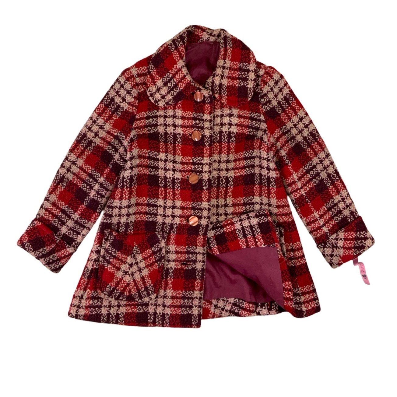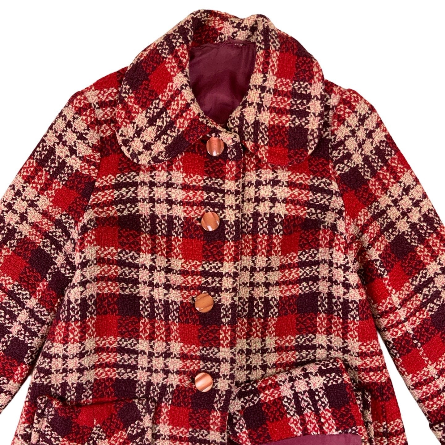 Vintage Woven wool coat. featuring two front pockets retro collar in a plaid woven red, cream, burgundy colour. front button up fastening. 100% wool.