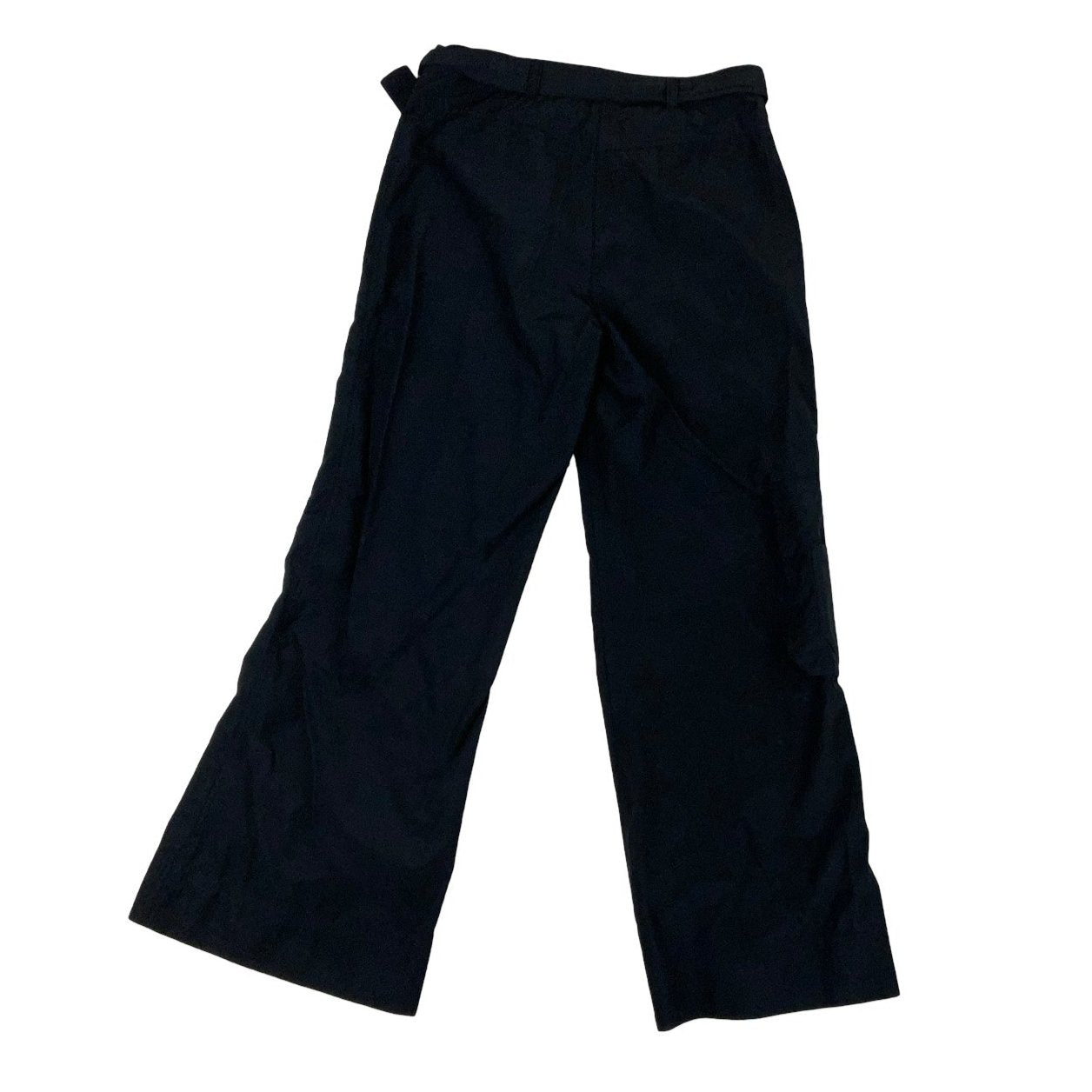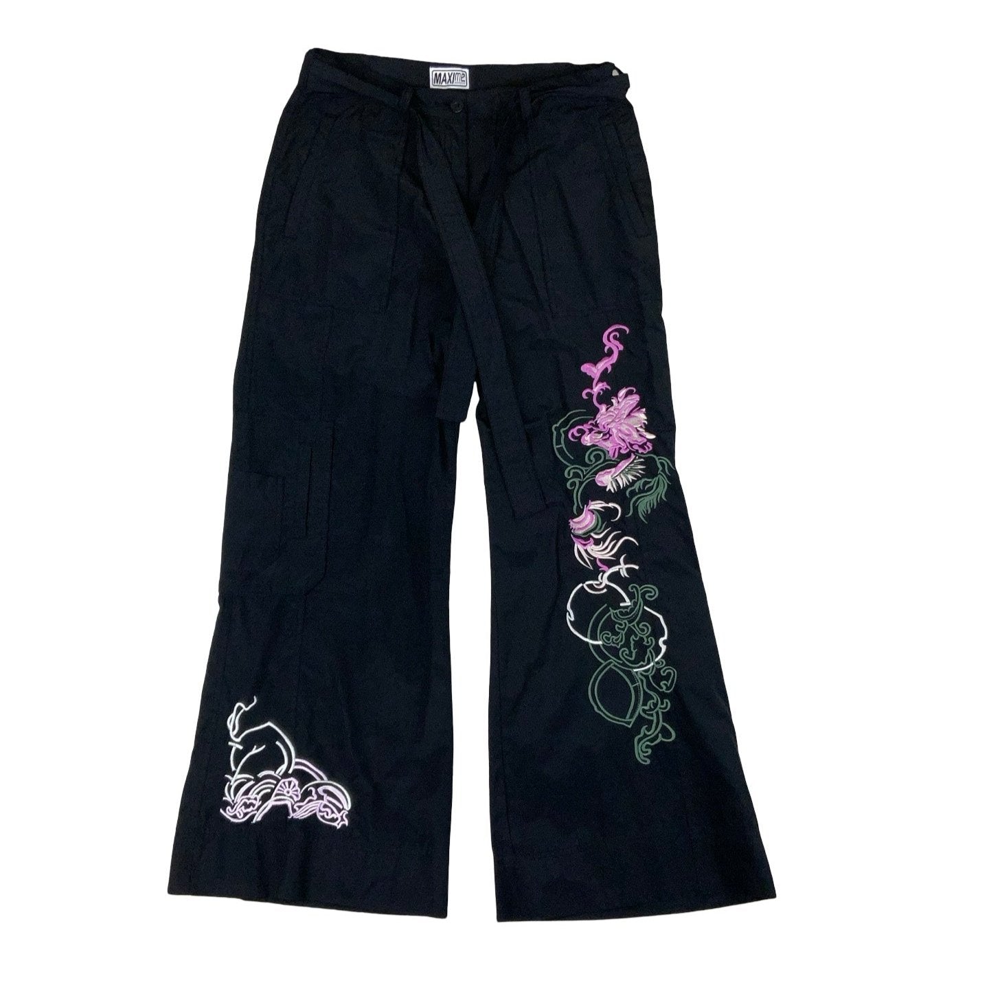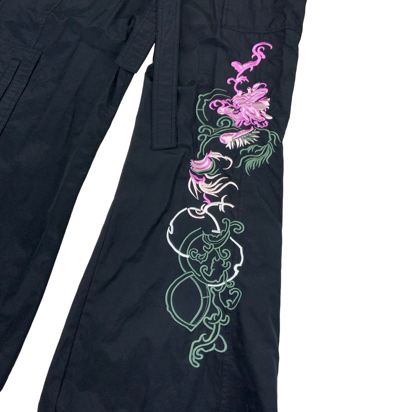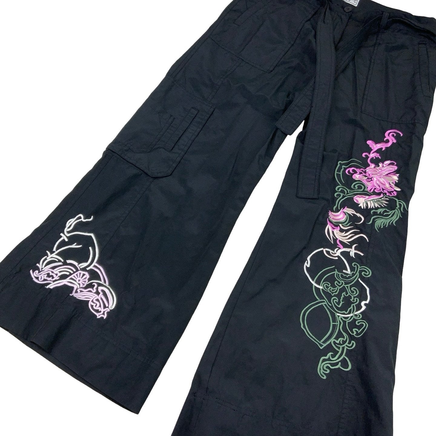 Vintage y2k black cargo wide leg joggers with Japanese style embroidery in a floral pattern around the ankles. Side pockets, zip and button fly, and tie belt.