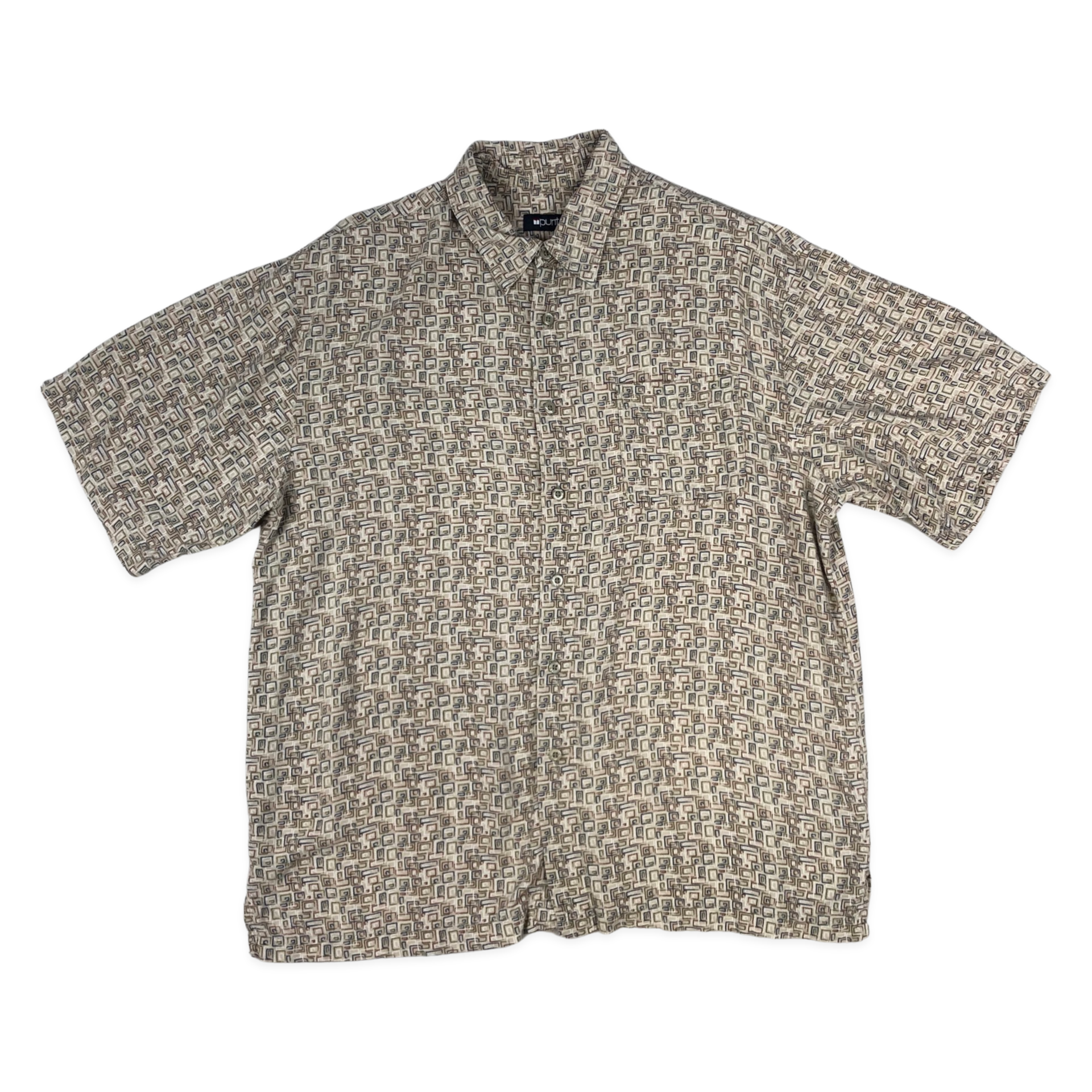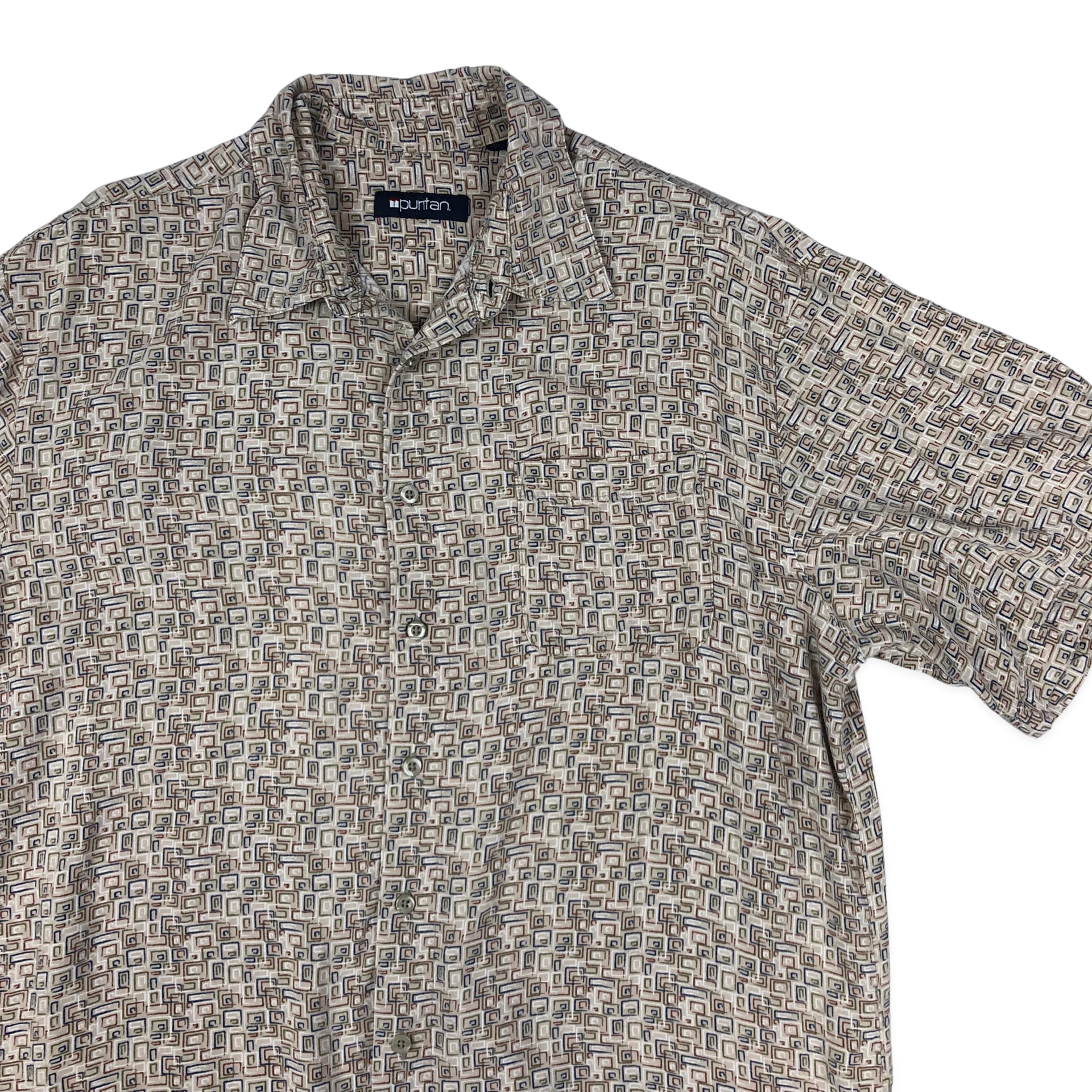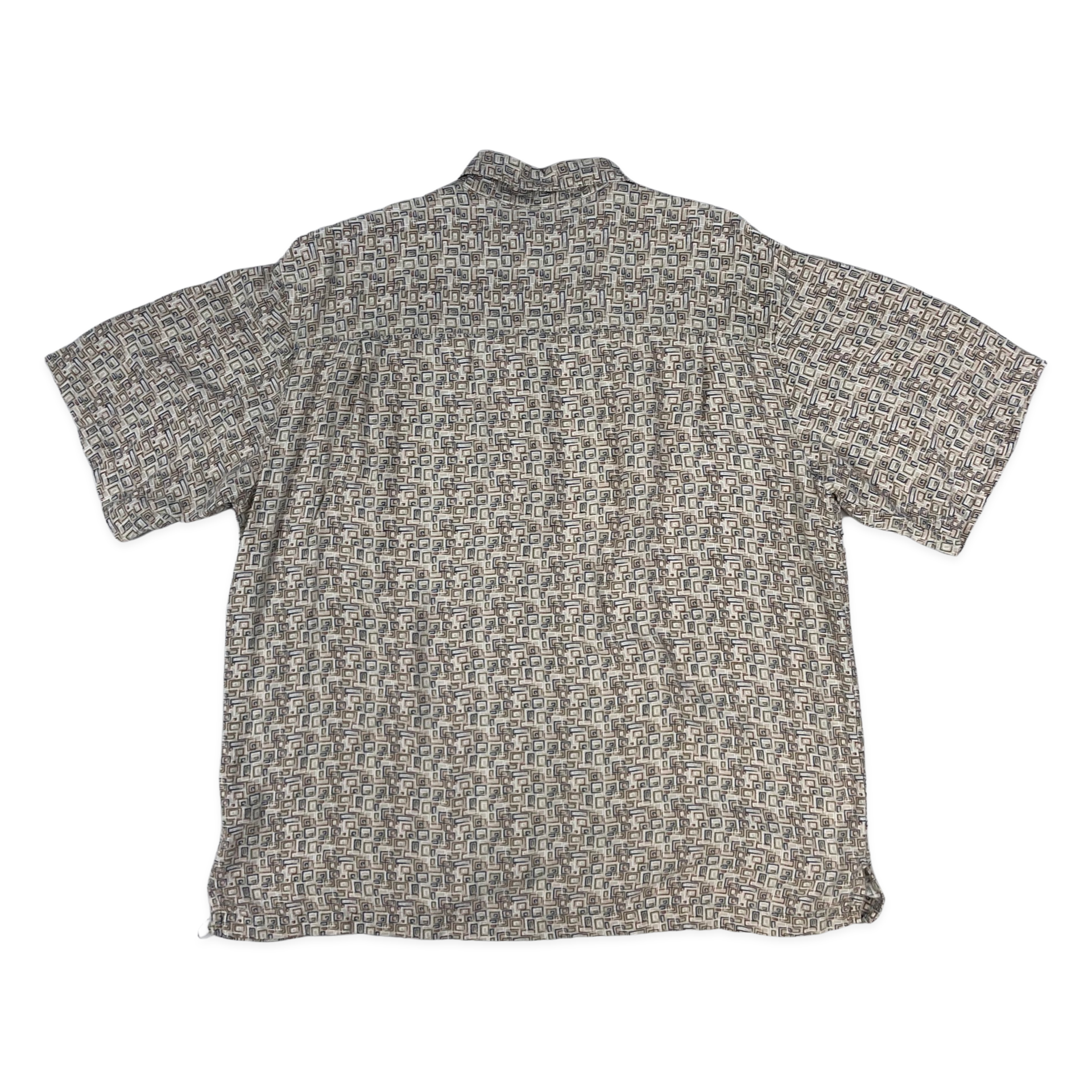 Vintage abstract print beige button-up short sleeved pocket shirt.