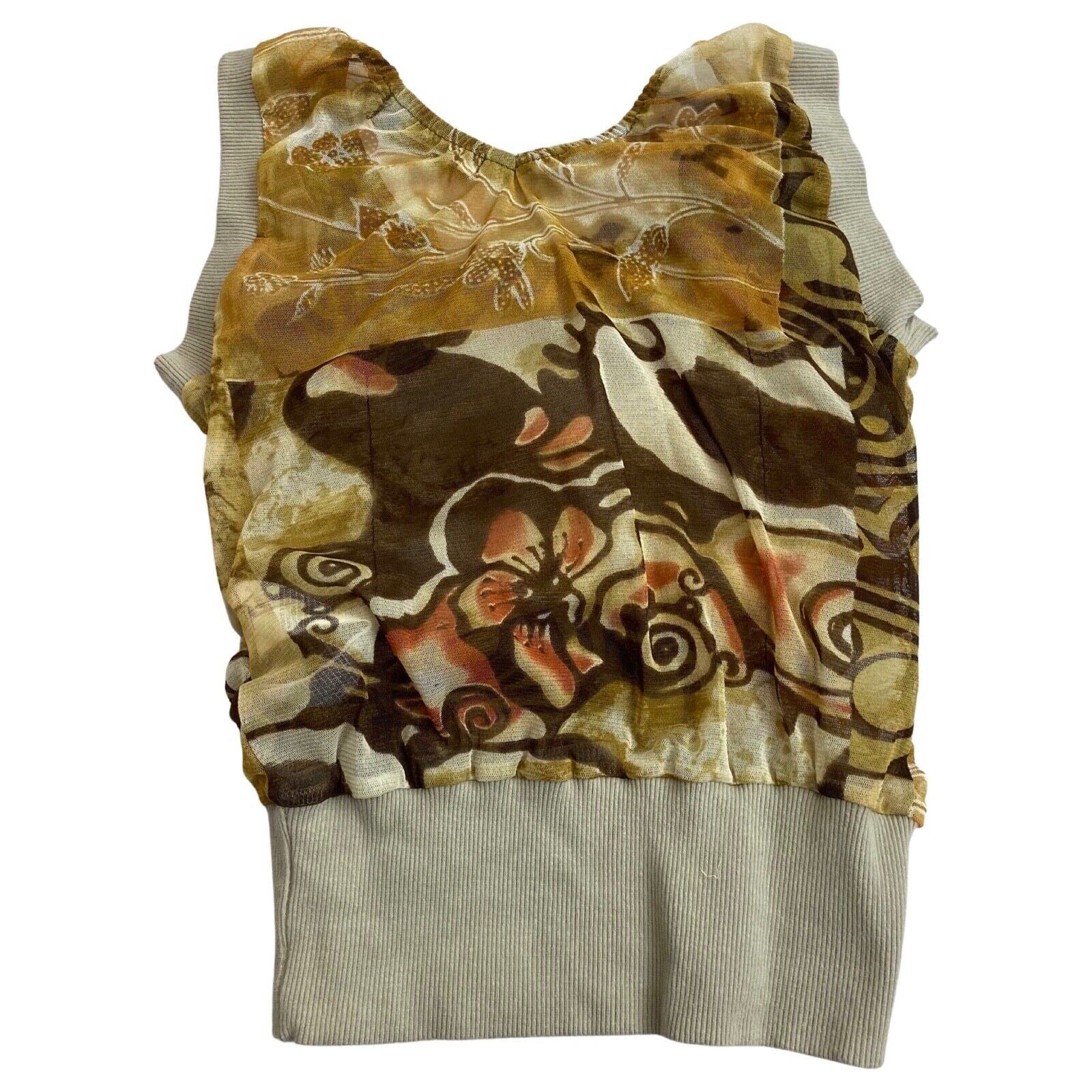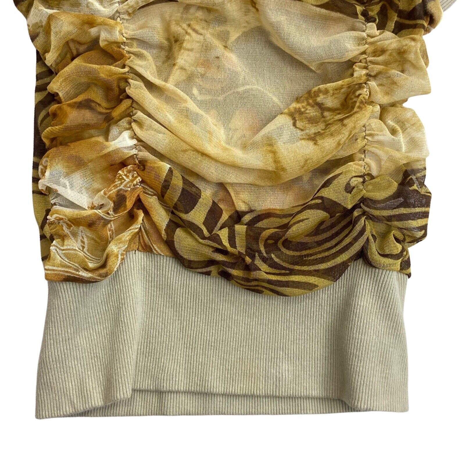 Vintage Y2K Beige Brown Elastic Ribbed Ruched Sheer Mesh Top 8 10 S