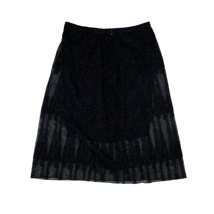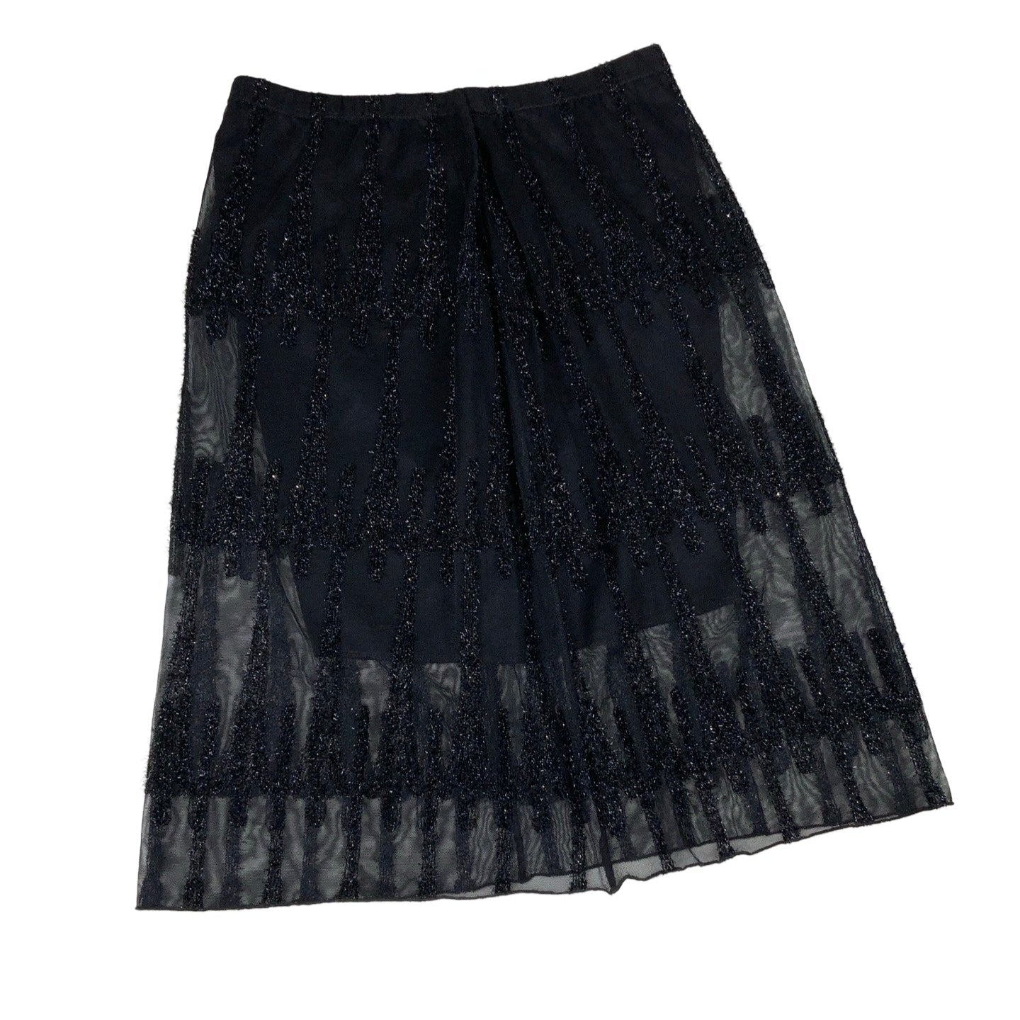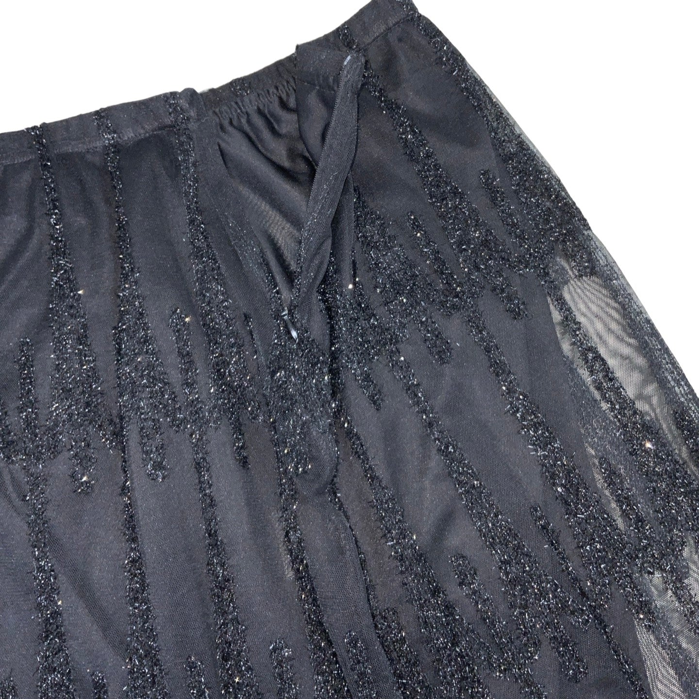 Vintage Y2K black mini skirt with black Lycra underskirt and black mesh over skirt that has vertical lines of textured black sparkly stitching. Back zip fastening.