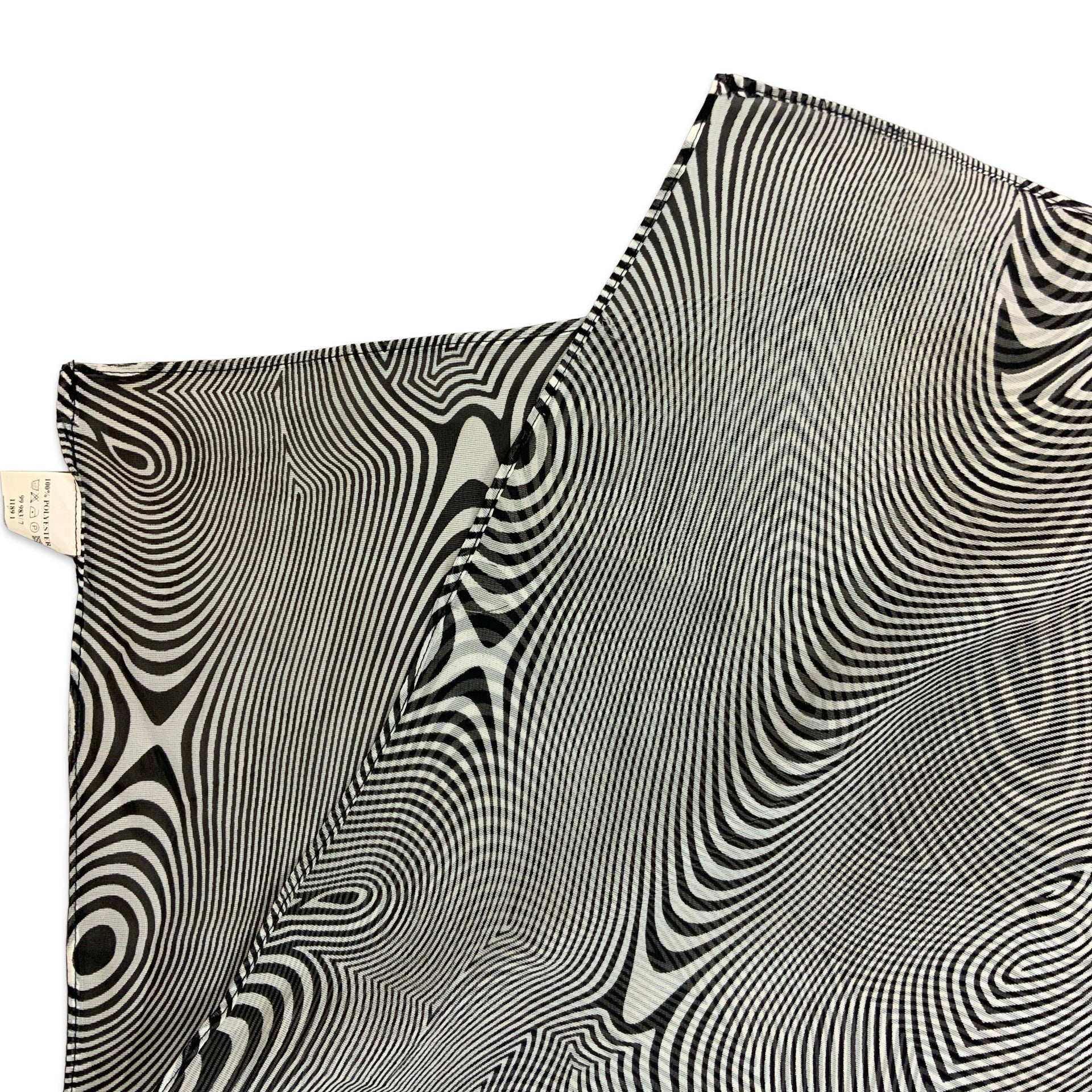 Vintage Y2K optical illusion psychedelic print in black and white. Lightweight, sheer polyester.