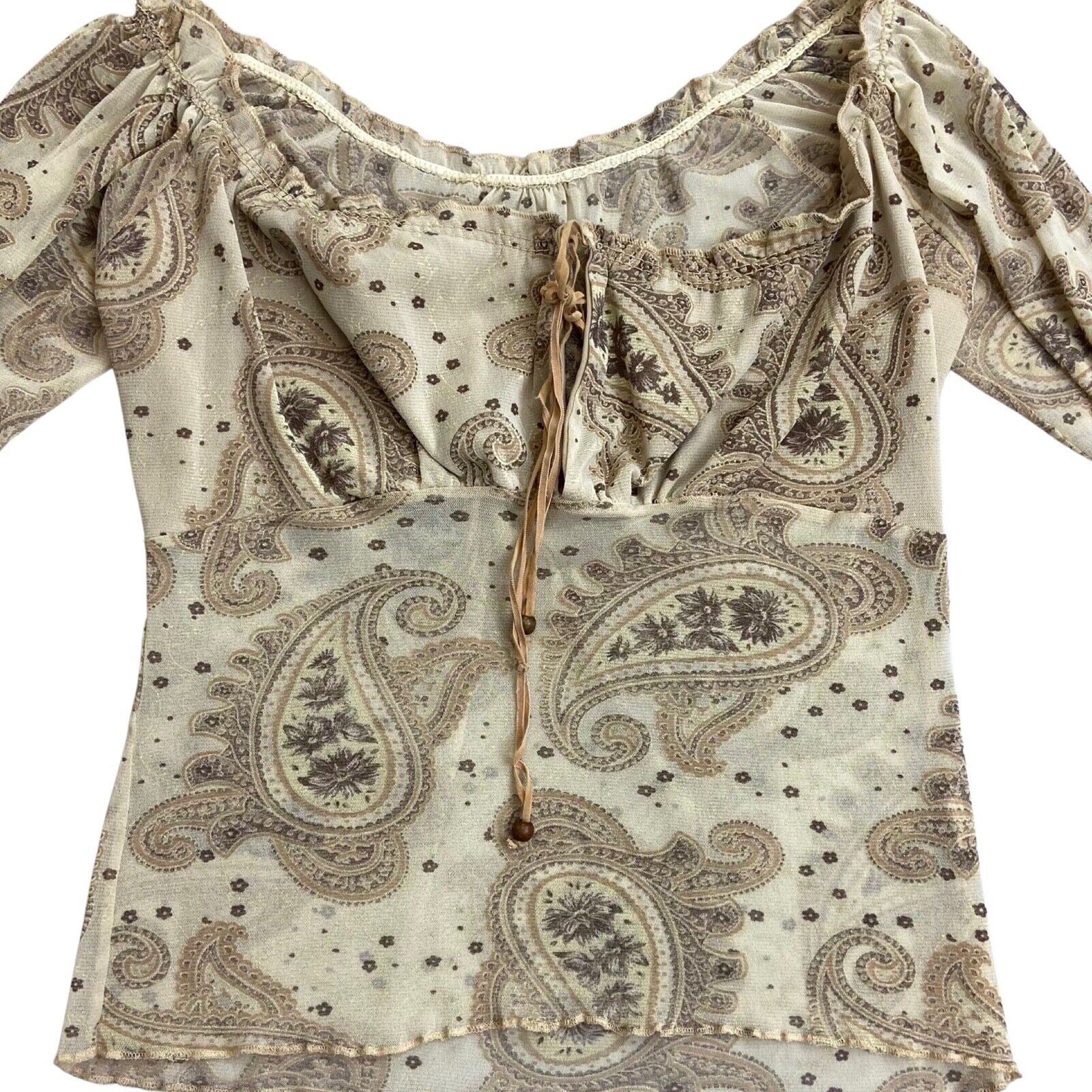 Vintage Y2K Cream Beige Sheer Long Sleeve Paisley Print Top 14 M L