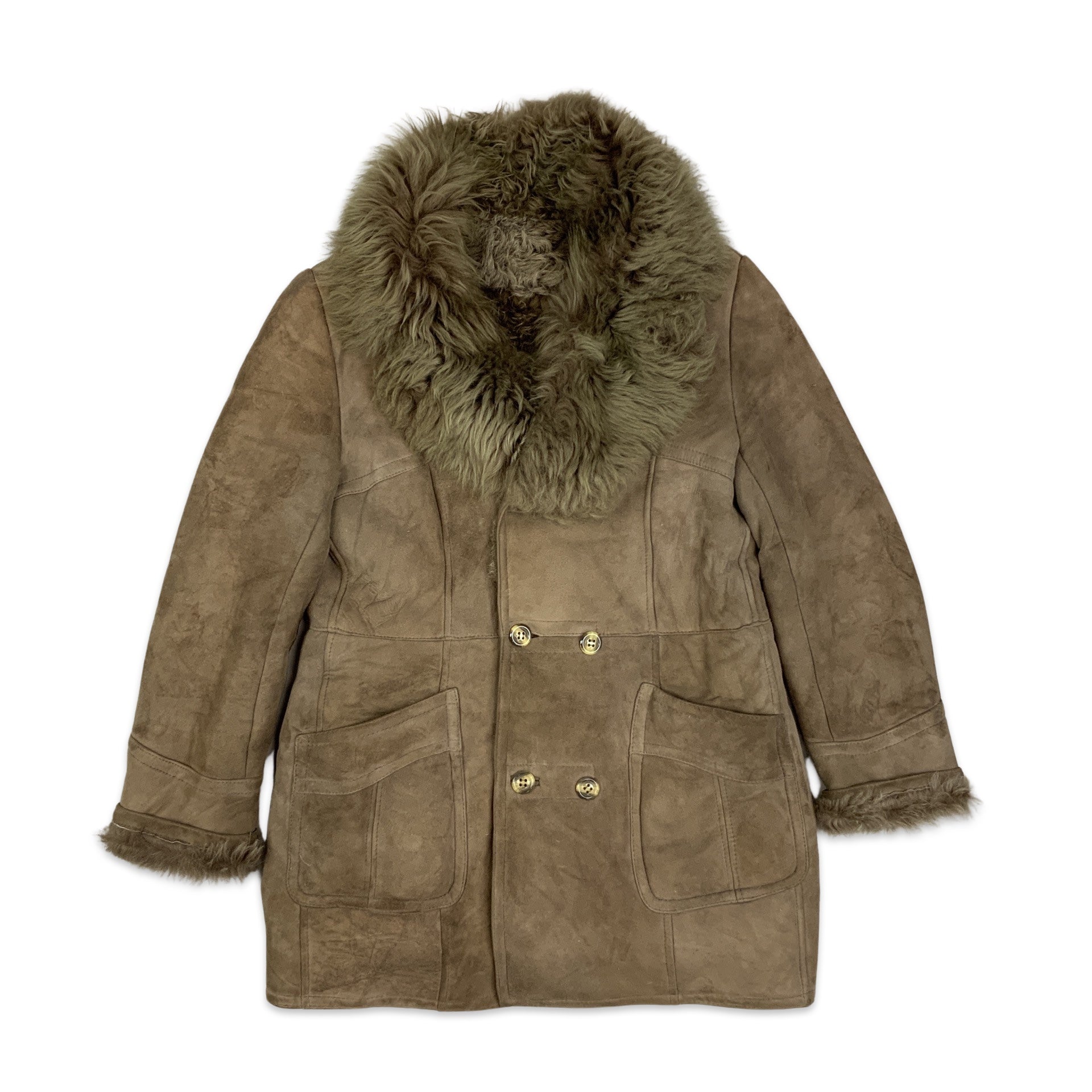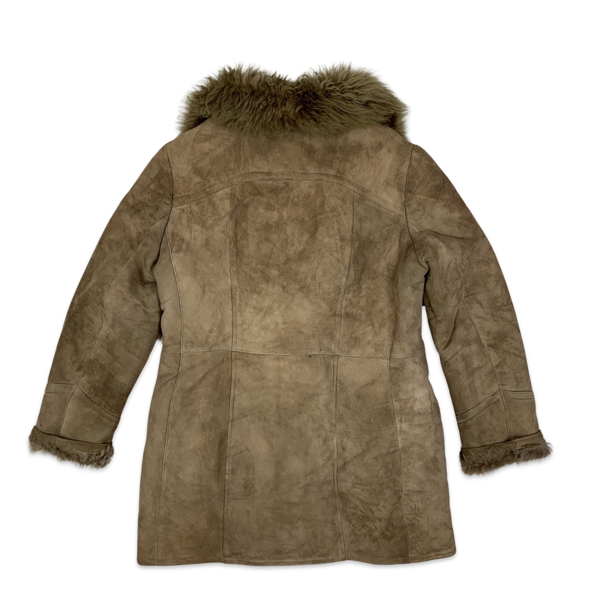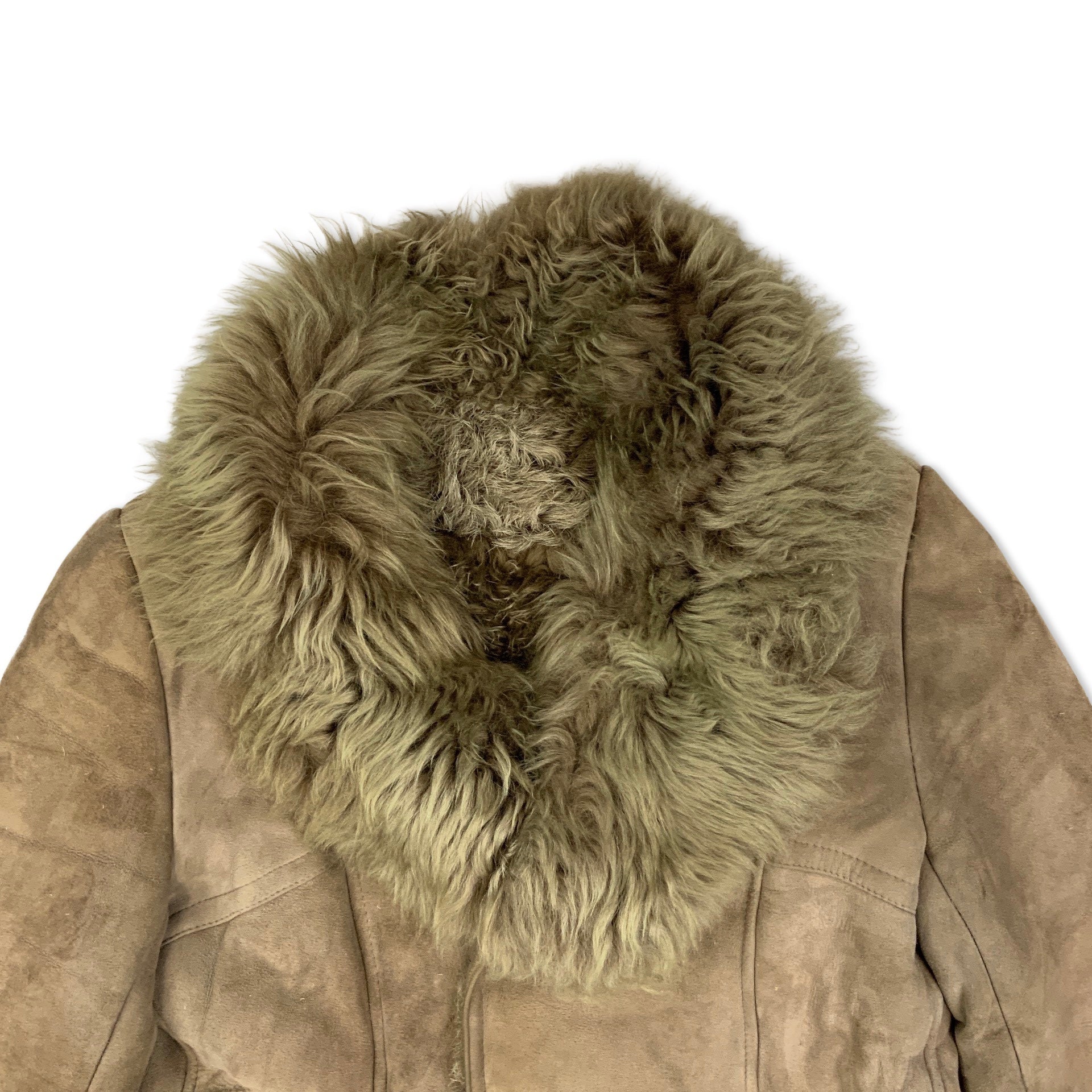 Vintage Y2K unisex shearling coat with faux fur lining and collar. Double breasted. Button up front fastening. Two deep front pockets.